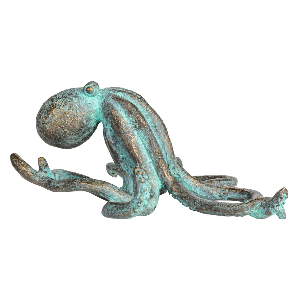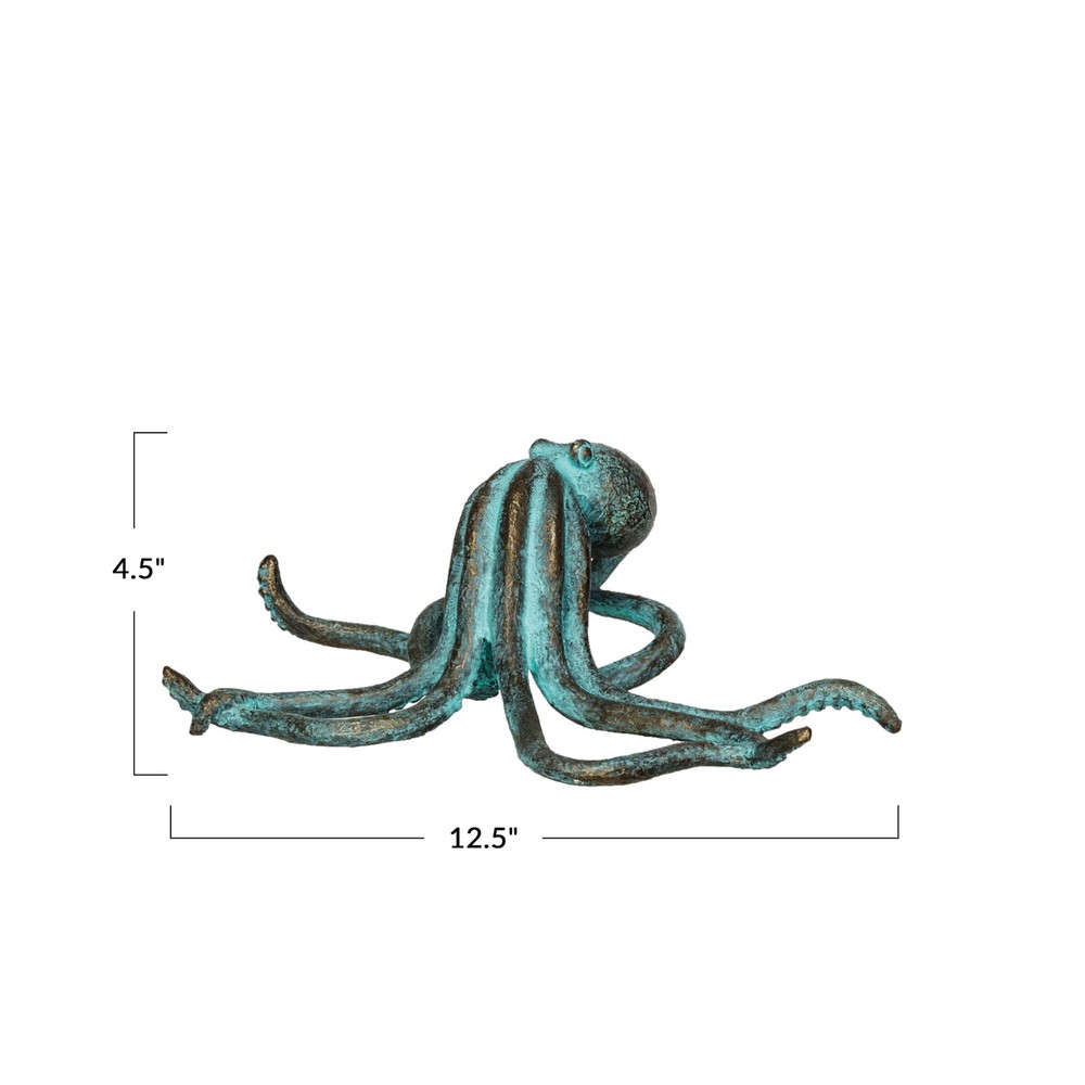 This resin octopus accent decor, in a verdigris finish and teal color, is a stunning addition to any home decor. Its realistic shape and antique appearance give it a weathered and antique look, while the teal color adds vibrancy and contrast. This piece is perfect for coastal, beach, nautical, or novelty themed decor, adding whimsy and character. It can be displayed on shelves, tables, mantels, or windowsills, and is made of durable resin, making it easy to clean. The piece measures 12.5 inches in length, 8.5 inches in width, and 4.5 inches in height, making it a great gift for anyone. Add some oceanic flair to the home with this resin octopus accent decor piece that features a verdigris finish and a teal color This accent decor piece is perfect for any coastal, beach, nautical, or novelty themed decor, as it adds a touch of whimsy and character This accent decor piece can be displayed on shelves, tables, mantels, or windowsills, as it is captivating, expressive, and eye-catching This accent decor piece is made of resin, a type of plastic that is durable and easy to clean Measures 12.5 inches in length, 8.5 inches in width, and 4.5 inches in height