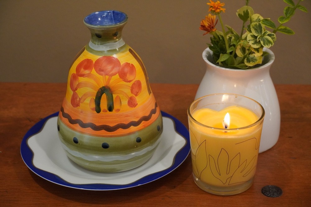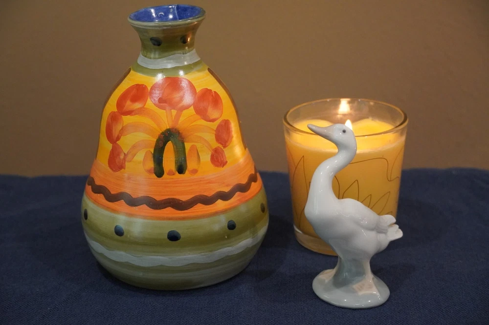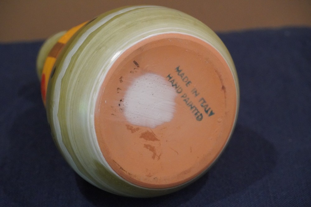 This vase is a colorful example of 1980's retro artistry. Handmade in Italy, it features a vibrant abstract floral pattern in bright colors including orange, yellow, green and blue. It's a unique addition to any collection. Crafted from high-quality ceramic, this vase is a unique original piece. It has a vintage feel, likely dating back to the late early 80's, and was produced using traditional pottery techniques. The vase is perfect for displaying flowers or as a decorative piece on its own. Dimensions: 7.25" tall by 5" width at the base. Other items in the pictures may be listed for sale. To see all of my listings click here: multipli-city-bazaar