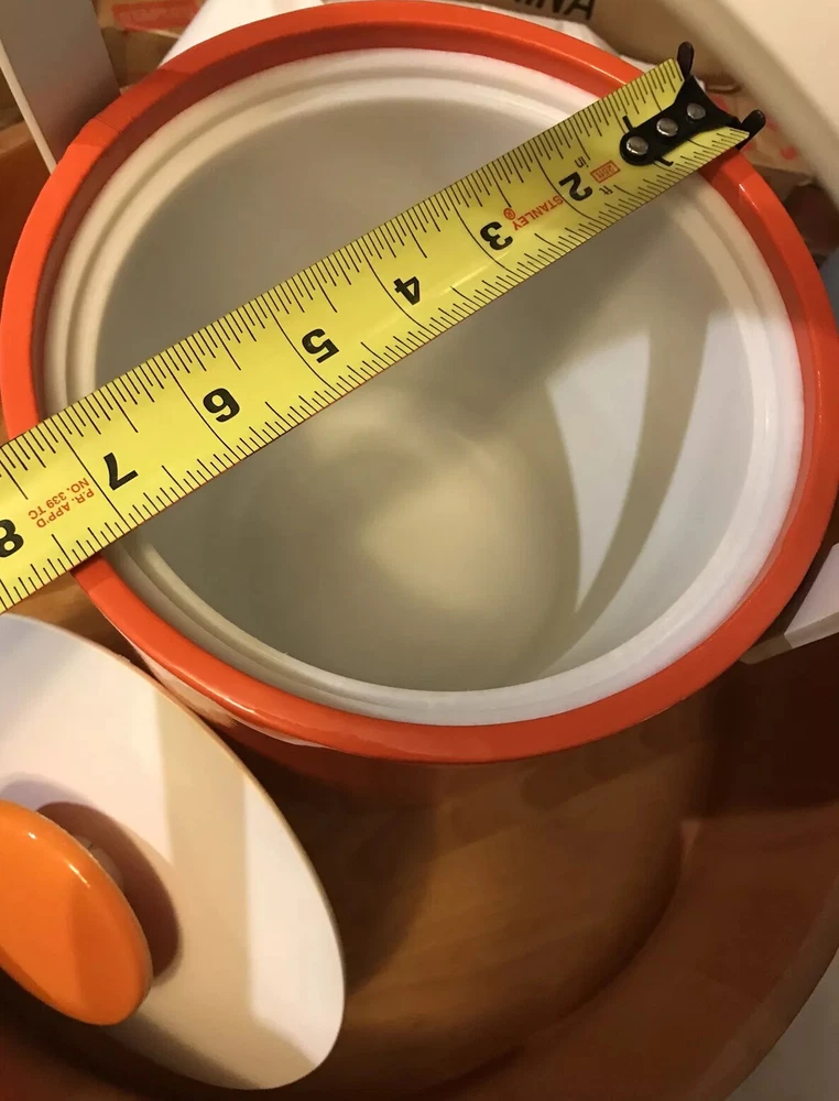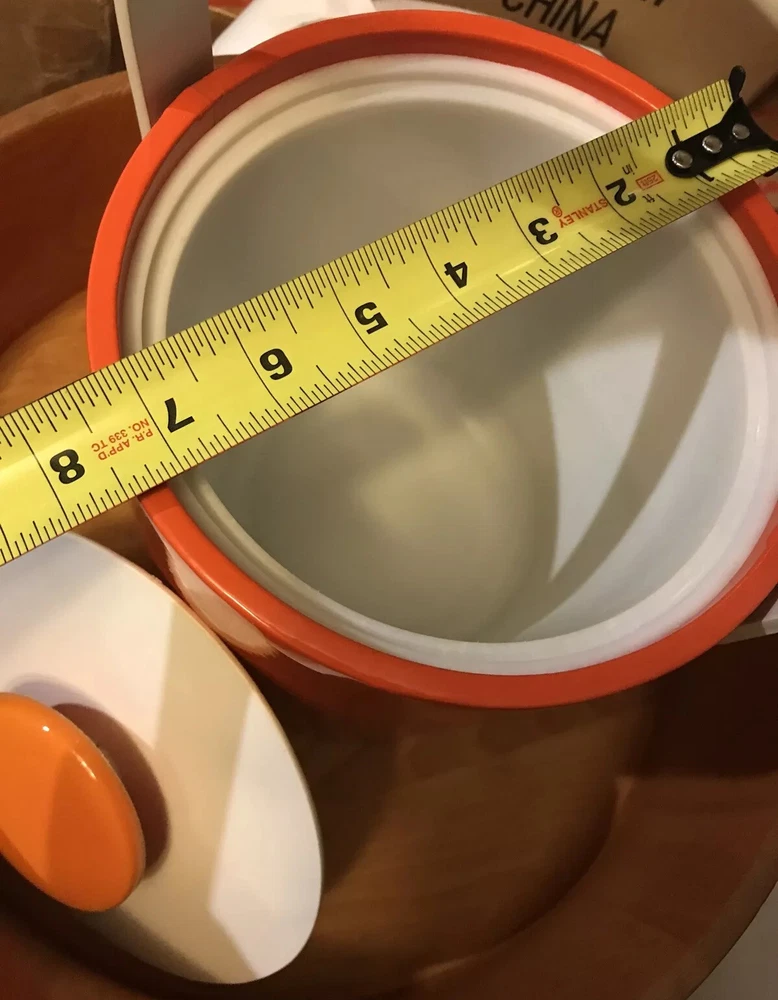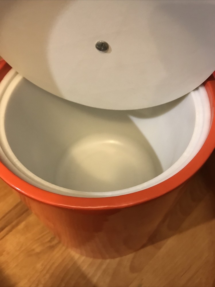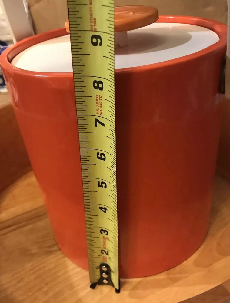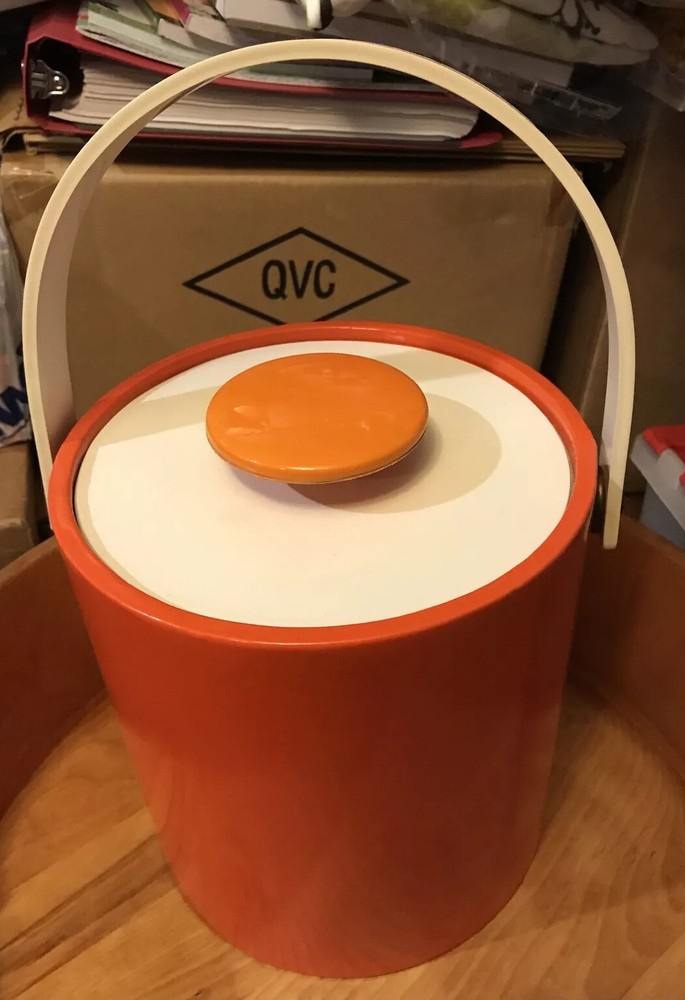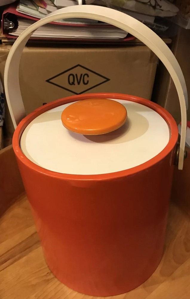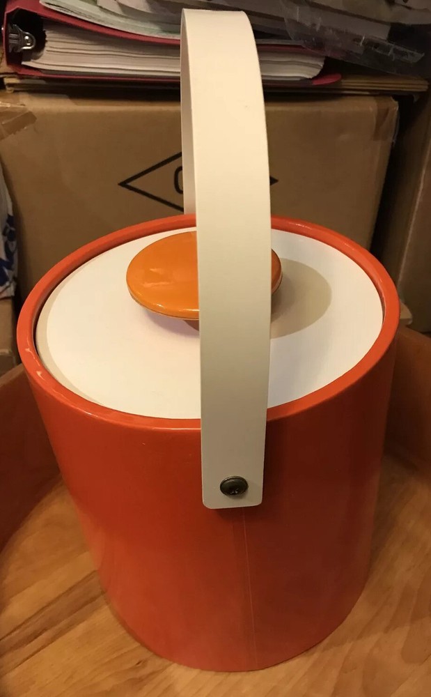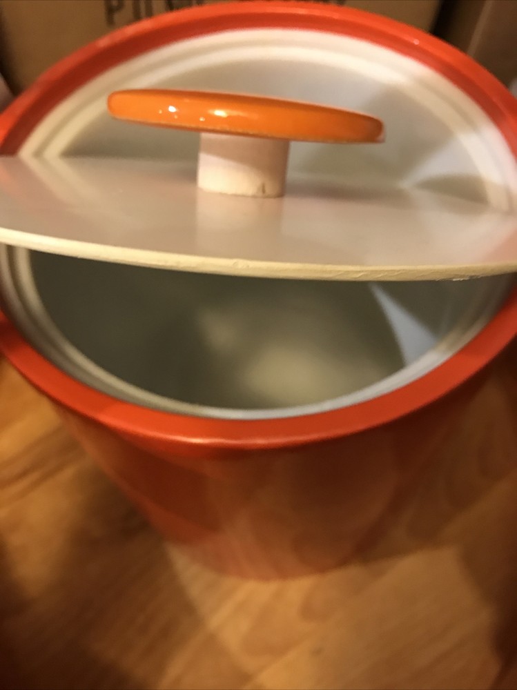 Simply stunning condition, maybe used once or twice, then stored away taking up space in storage. Too beautiful to continue the storage journey. This would make a beautiful presentation and screams 70’s rad retro. Vinyl is shiny and bright, clean and I do not see any visible damage to note. This needs to find a home with a retro fan! Wonderful piece to add to your decor. Retro Orange Mid Century Modern Unsigned Ice Bucket Orange is Shiny vinyl, with a little lighter vinyl circular knobbed top. Easy to clean White PVC top and wood separator as pictured for the lid to knob. Beautiful found condition, been in storage for decades. Amazing….amazing… amazing piece! I know you will love it! We thank you for your kind consideration.