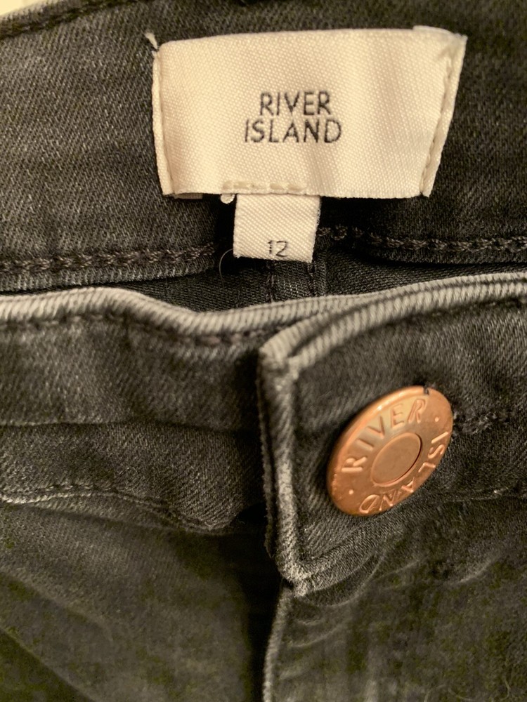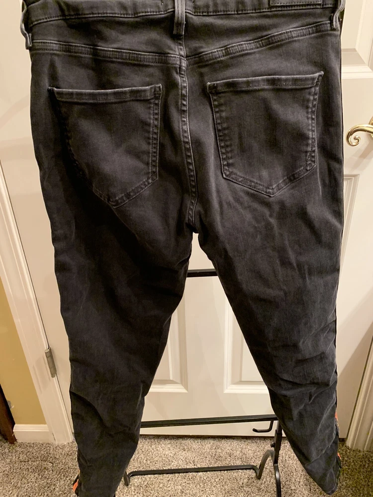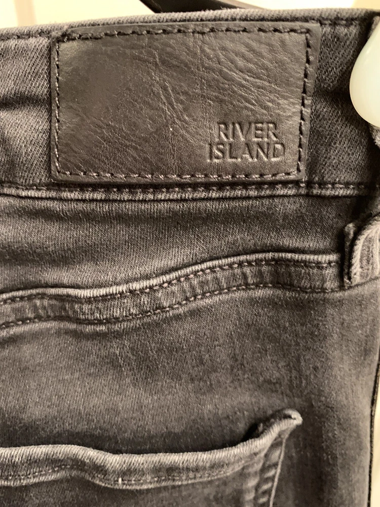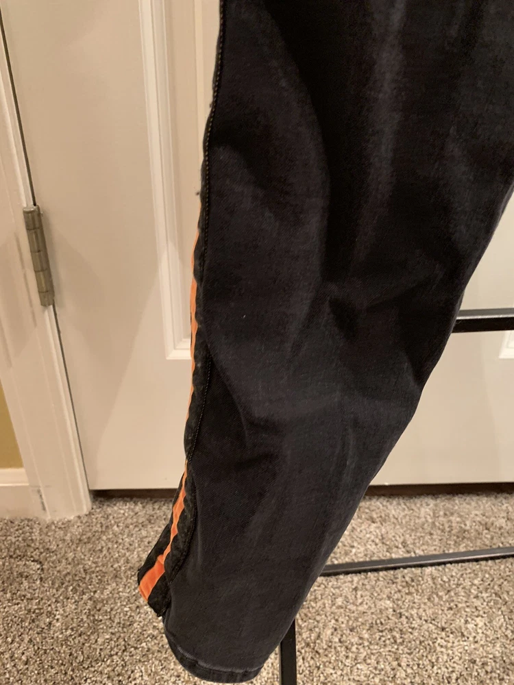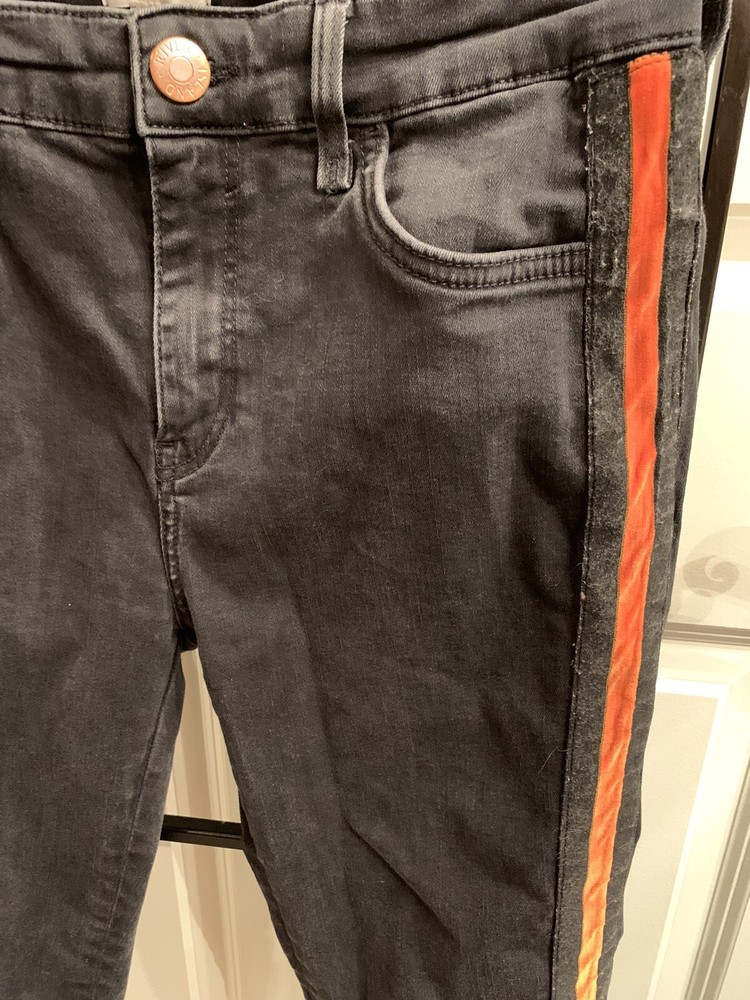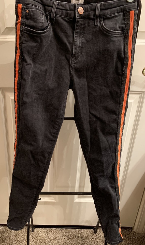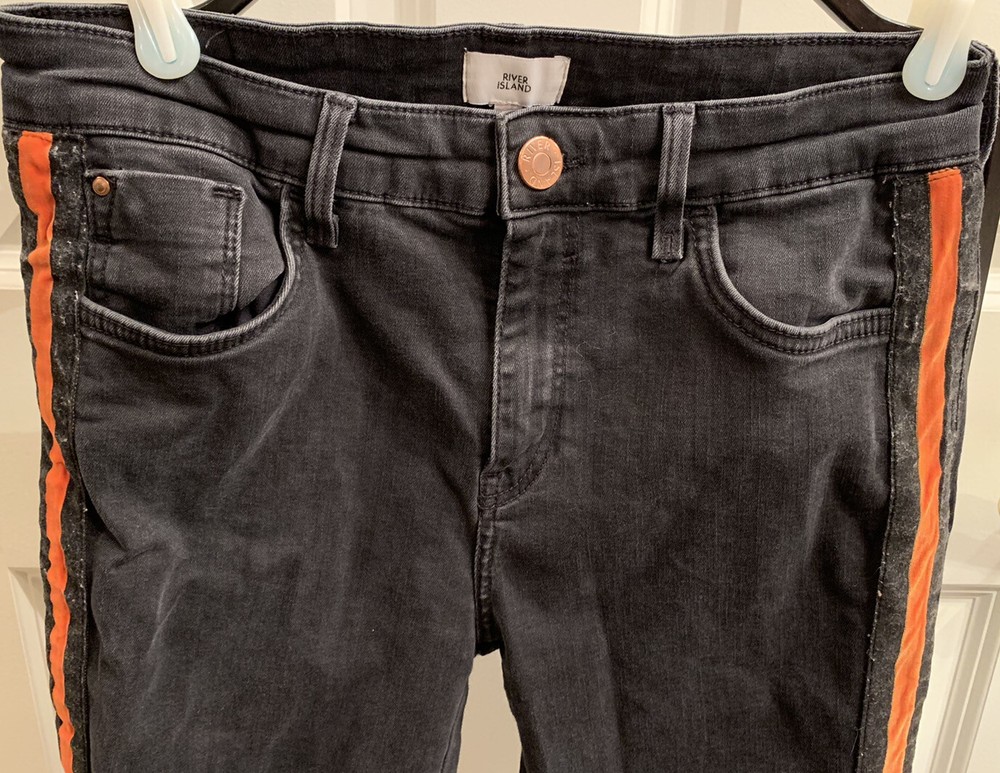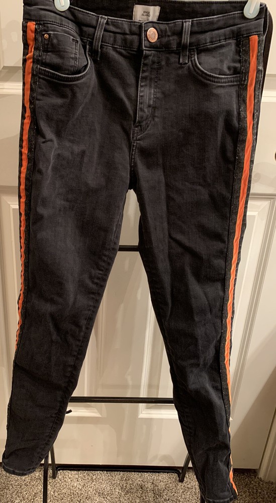 Black River Island Ladies Jeans. Size UK 12. Orange and Black velvet feel stripe coming down front side of both legs. Straight tight stretchy jean material. Waist measures 30" around, inseam 29", leg opening 10". Excellent used condition. Ships from the United States.