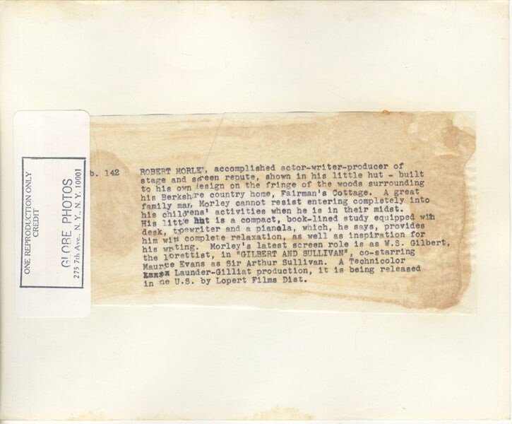 Robert Morley Gilbert and Sullivan era Berkshire Country Home Fairman's Cottage Original 8x10 Photo Stamped with Snipe VG/Near Mint Condition This item is an ORIGINAL 8x10 photo from the historic archives of Silver Screen Mementos. This original photograph was made in the actual year the film, television show or event was produced. The movie studios produced publicity photographs for distribution to the press, photo agencies and publicity departments to advertise the film/tv show or event. Very often original photos have press release information on the reverse of the photo - movie credits, description of the scene, event and people involved. This is a historic piece of cinema art and is being offered from one collector to another, no rights given or implied. Silver Screen are gradually releasing thousands of Original Photographs, Transparencies, Negatives, Lobby Cards, Posters, Magazines and other memorabilia from our historic archive. Powered by SixBit's eCommerce Solution