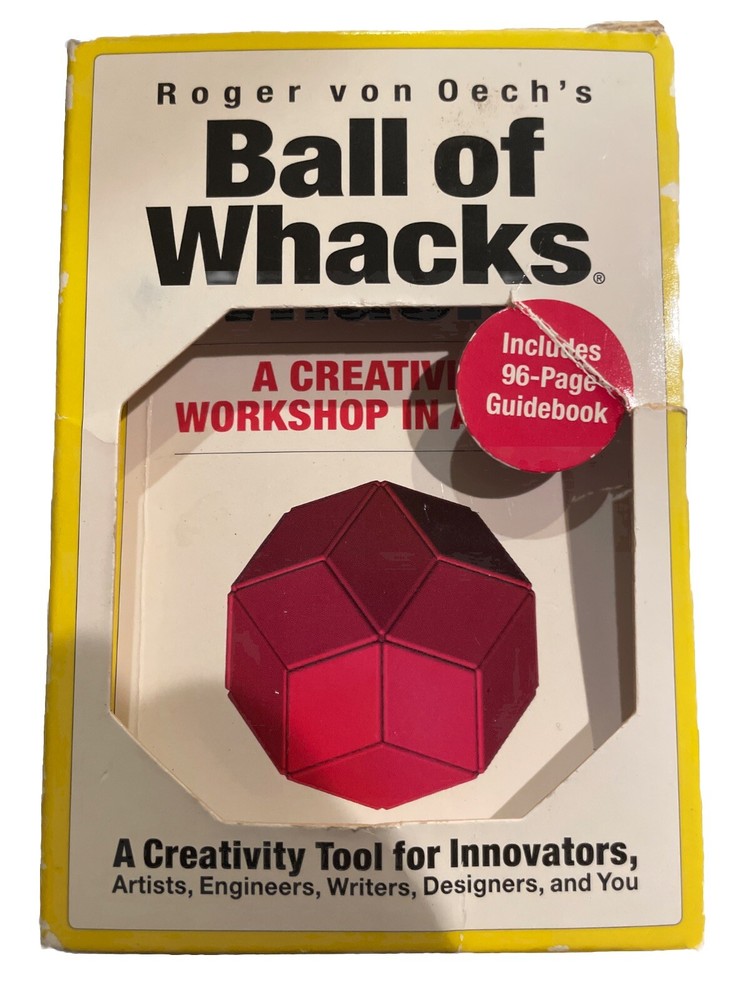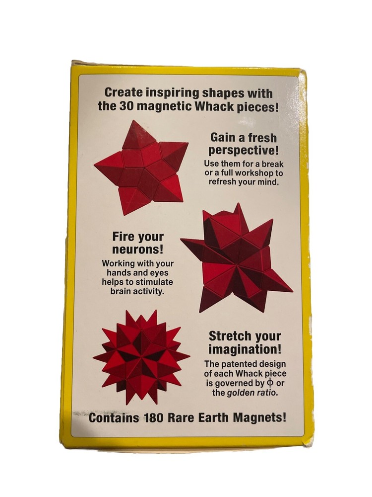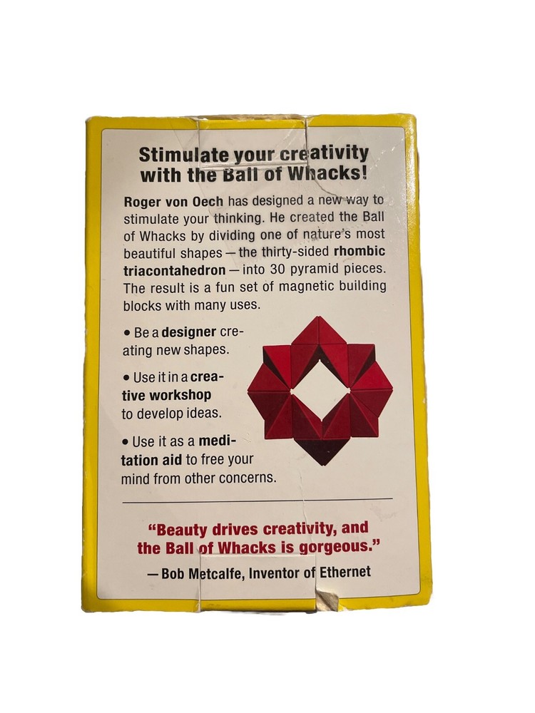 The "Roger Von Oech's BALL OF WHACKS Set Of Magnetic Design Blocks Creative Tool" is a puzzle toy by Creative Whack Company, featuring an irregular shape with magnetic design blocks. Released in 2008, this red cube/twist puzzle is designed for individuals aged 14 and above. The set of blocks serves as a creative tool, allowing users to explore various patterns and designs through a tactile and interactive experience. Perfect for those interested in brain teasers and contemporary puzzles, this unique product offers a fun and engaging challenge for individuals looking to exercise their creativity and problem-solving skills.