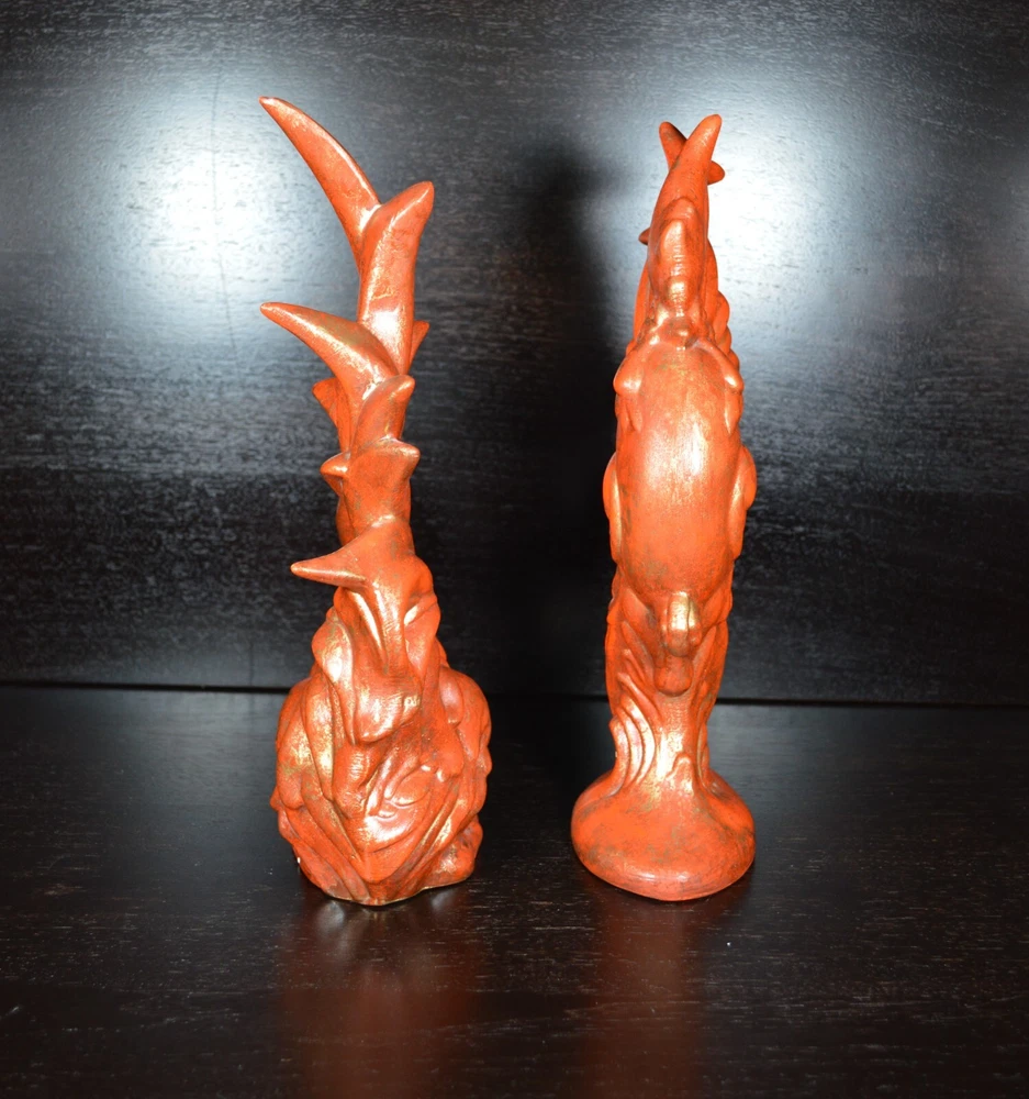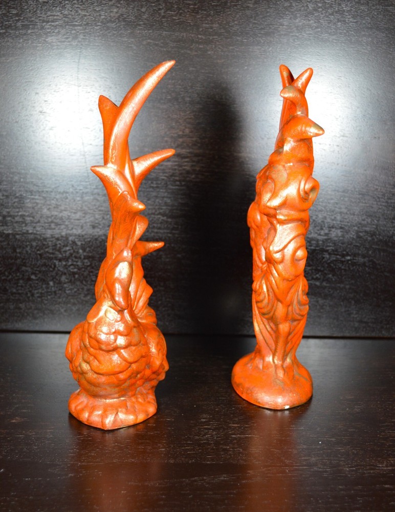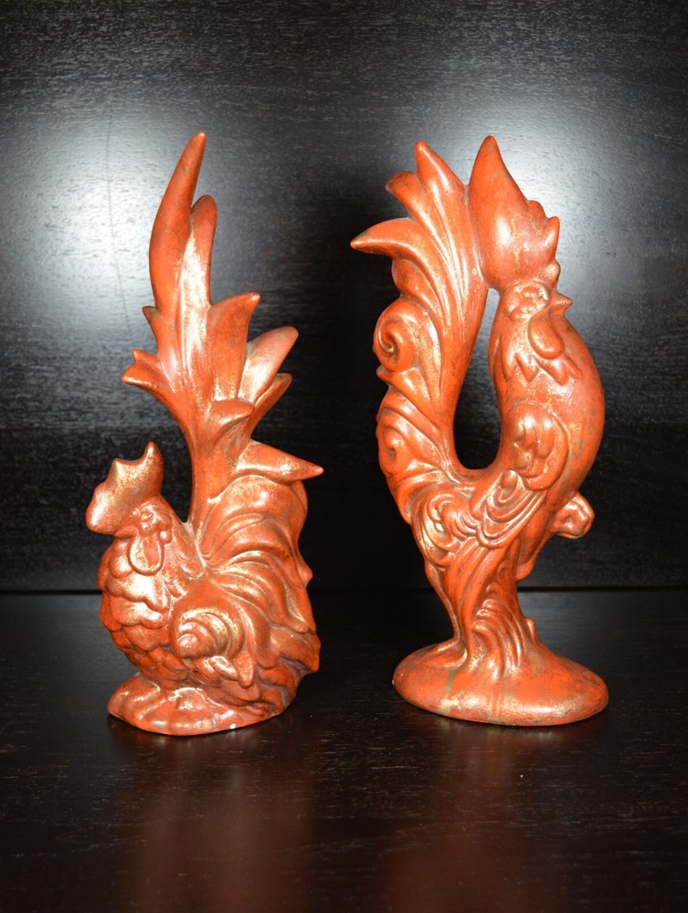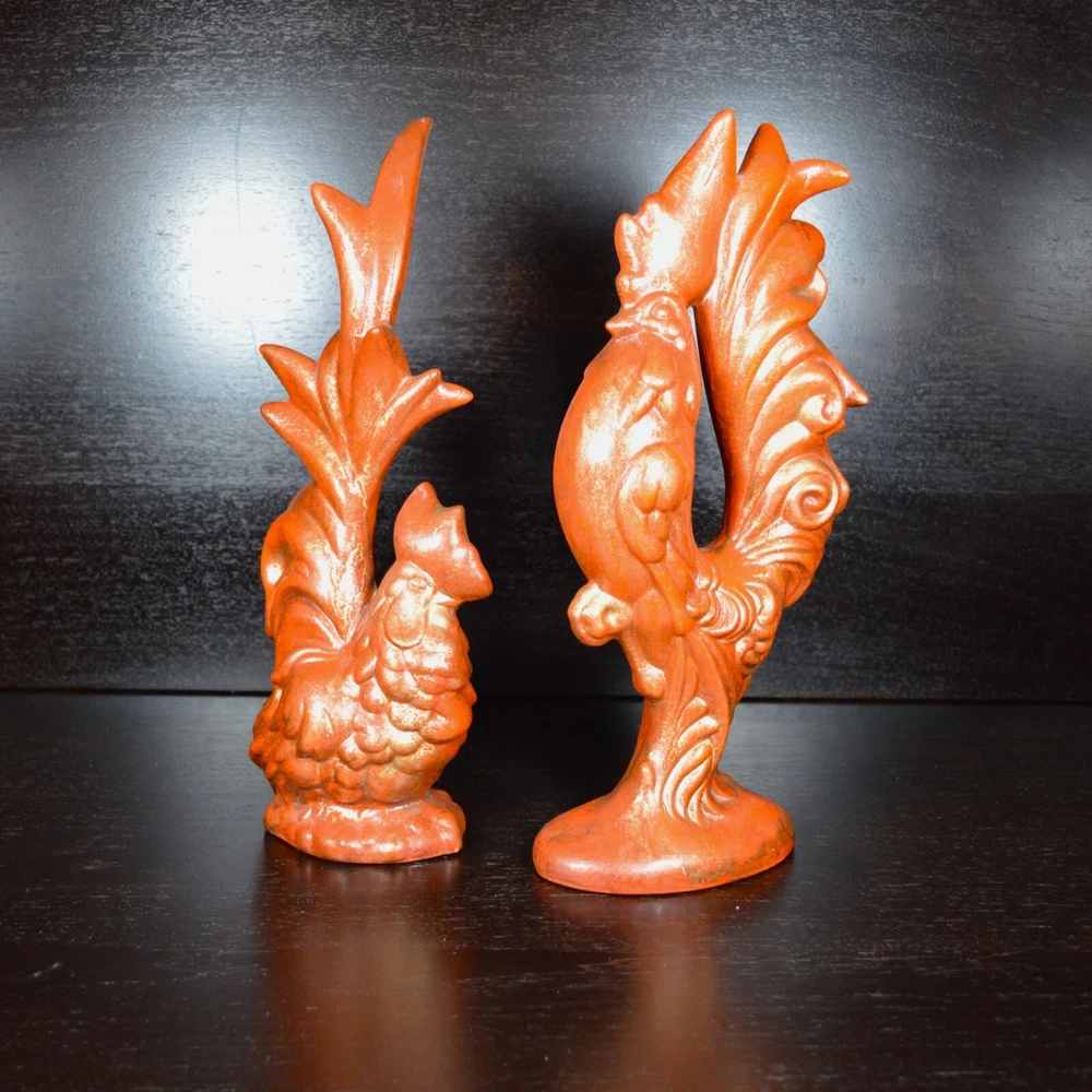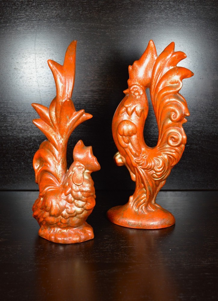 For sale is this vintage set of Arnel's Molds Rooster and Hen figurines. They are made from bisque ceramic and then decorated with a rusty orange paint. The artist then highlighted each piece with gold paint. These were made by a hobbyist and are done really well. Each items measures 12" tall and the Rooster is 5" wide, while the hen is only 4" wide at the base. These were very popular items to paint at home during the 1950's, 60's, and 70's. Make these a part of your farmhouse décor to bring in that wonderful Fall/Autumn feel. Antique and Vintage items are sold AS IS. Please ask any questions before making your purchase.' Items are shipped via USPS Priority Mail or similar. I use calculated shipping and CARRIER determines shipping rates. We are professional packers and use proper packing material to protect your item(s). All packages are insured. If damage occurs due to shipping, please contact us within 24 hours. It will make the refund process quicker. Refunds are issued upon arrival of returned item(s) in SAME condition as when shipped from my shop. Thank you for stopping by and have an amazing day.