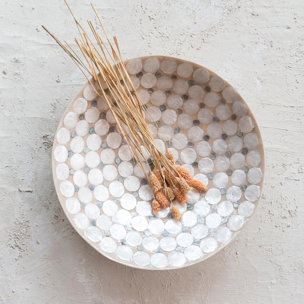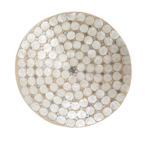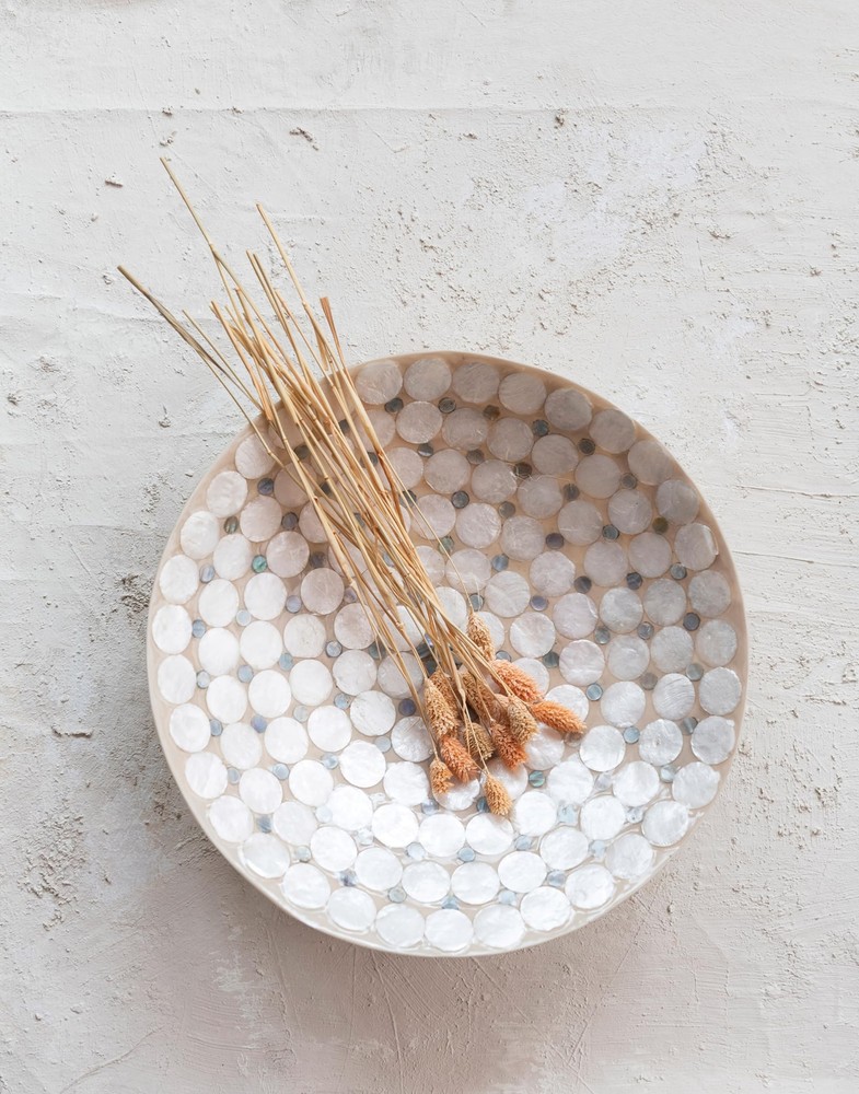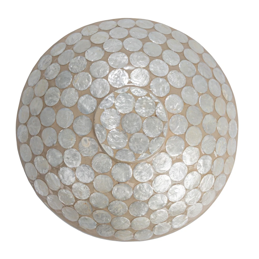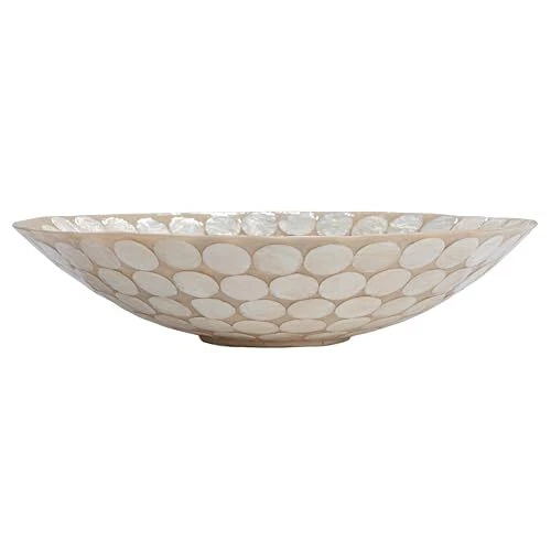 This white and natural Capiz bowl is a beautiful way to add sparkle and texture to the home. The bowl is made of resin and Capiz shell arranged into a round shape and polished to create a smooth and shiny surface. The bowl's white and natural color scheme any farmhouse, French country, coastal, or cottagecore style home. The bowl measures 14.5 inches in diameter and 3.25 inches in height and can be used to display or small items such as jewelry, keys, coins, or candies. This white and natural Capiz bowl is a stunning piece that will catch the eye and enhance any space. A lovely round bowl with a white and natural color scheme and a shimmering Capiz shell surface A fitting piece for any farmhouse, French country, coastal, or cottagecore style home A decorative bowl that can be used to display or small items such as jewelry, keys, coins, or candies Made of resin and Capiz shell that are durable and elegant Measures 14.5 inches in diameter and 3.25 inches in height