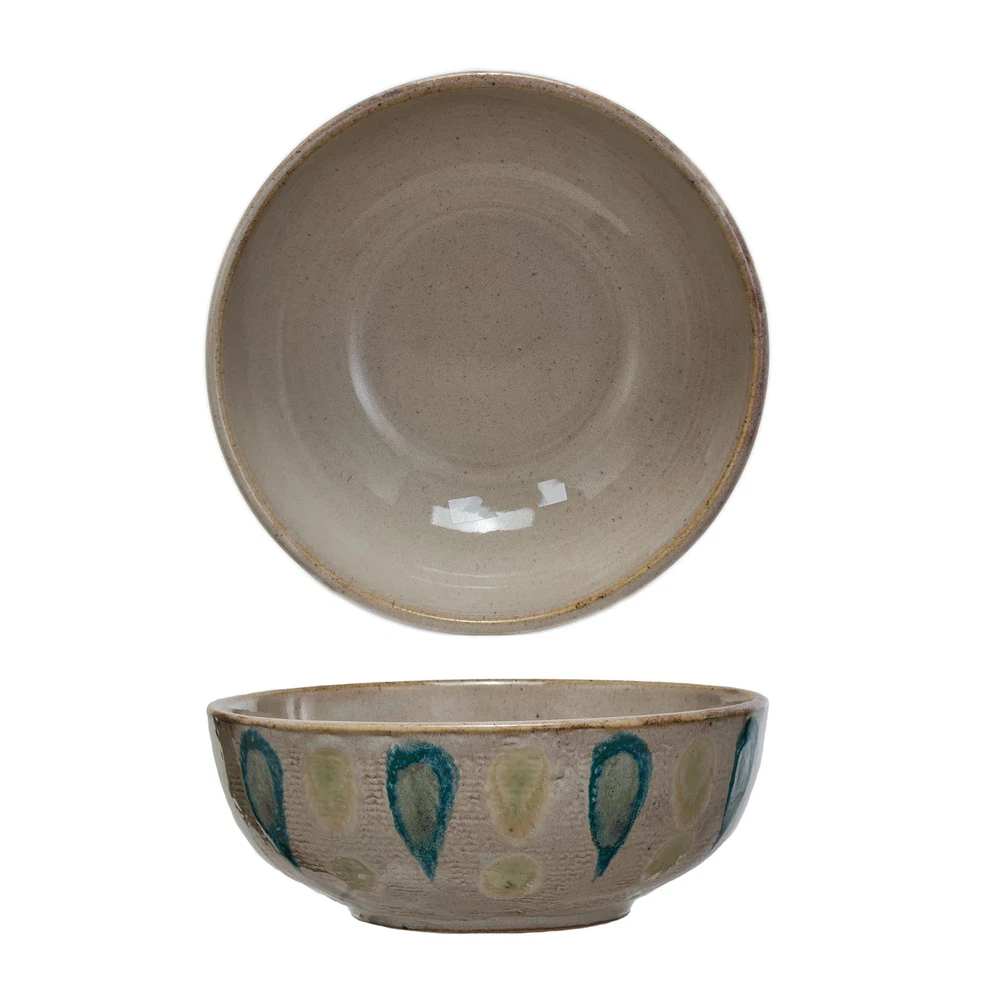 This Geometric Stoneware Bowl is a celebration of color and pattern, where the earth meets the sea in a dance of green and blue hues. The intricate geometric design, reminiscent of ancient mosaics, brings a touch of the exotic to the table, while the bronzed background adds a touch of warmth and depth. It's a piece that doesn't just hold food; it holds the gaze, inviting admiration and conversation. It measures 9.5 inches in diameter and 3.75 inches in height, providing a generous canvas for its intricate design. Whether filled with fresh fruits or left empty, it stands as a testament to the beauty that functional art can bring to everyday life. In a world that craves authenticity, this bowl is a genuine expression of global craftsmanship and style. A small, round stoneware bowl that captivates with a green and blue geometric pattern set against a bronzed background An artistic statement, it complements Boho, Scandinavian, Rustic, and Global decor styles with its vibrant, earthy palette This bowl is ideal for those who appreciate the art of presentation, serving as a striking vessel for varied creations Made of durable stoneware, this bowl is a harmonious blend of functionality and visual appeal, with a pattern that tells a story 9.5” Diameter x 3.75” H