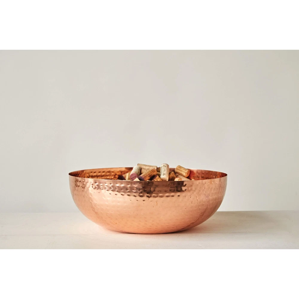 's thoughtfully crafted collection of serveware showcases an expansive selection of natural materials and artisanal silhouettes that are all intentionally designed for the modern host. Elevate gatherings of friends and family with an offering of stylishly versatile pieces including serving bowls, pitchers, platters, crocks, ladles, salt and pepper shakers, pinch pots, tiered trays, creamers, appetizer boards, serving trays, so much more. Choose from a wide array of materials from marble to wood, and styles from rustic and modern to farmhouse and glam. Curate a dazzlingly elegant display for a dinner party, or simply add a touch of style to daily rituals with a piece that is sure to impress. This classically designed serving or mixing bowl features a hand-hammered texture and glistening copper finish Fill with popcorn, toss a salad, or simply use as a stylish mixing bowl Food safe; Hand wash only Made from 100% iron 14 inches diameter x 4.5 inches H