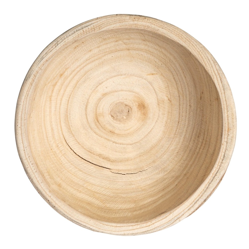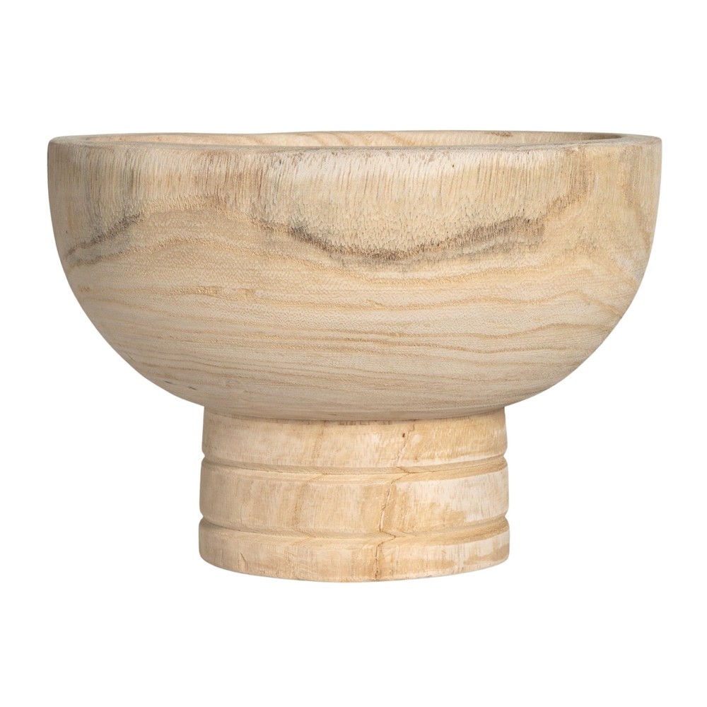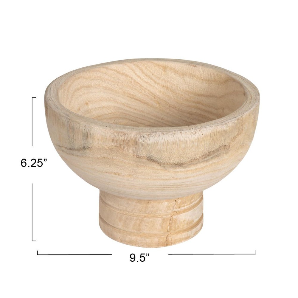 This paulownia wood pedestal bowl is a lovely and rustic piece that will enhance any space. The bowl features a natural paulownia wood finish that has a beautiful and varied grain pattern, creating a cozy and inviting effect. The bowl also has a round shape that gives it a classic and timeless appeal, creating contrast and balance. The bowl is made of paulownia wood, a sustainable and lightweight hardwood that comes from the paulownia fruit tree. It is easy to clean and maintain. The bowl measures 9.4 inches in diameter and 6.25 inches in height. The bowl also has a pedestal base that adds some height and stability to the bowl. This paulownia wood pedestal bowl is a versatile and stylish piece that can be used to display fruits, flowers, candles, or other decorative accents. It is a perfect addition to any space that needs some organic warmth and charm. A lovely and rustic pedestal bowl with a natural paulownia wood finish and a round shape A perfect addition to any space that needs some organic warmth and charm Ideal for displaying fruits, flowers, candles, or other decorative accents Made of paulownia wood, a sustainable and lightweight hardwood 9.4" Diameter x 6.25" H