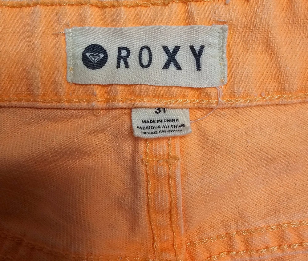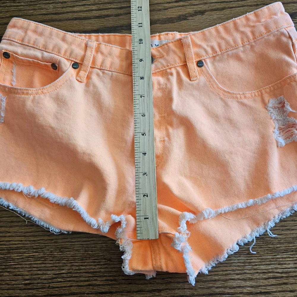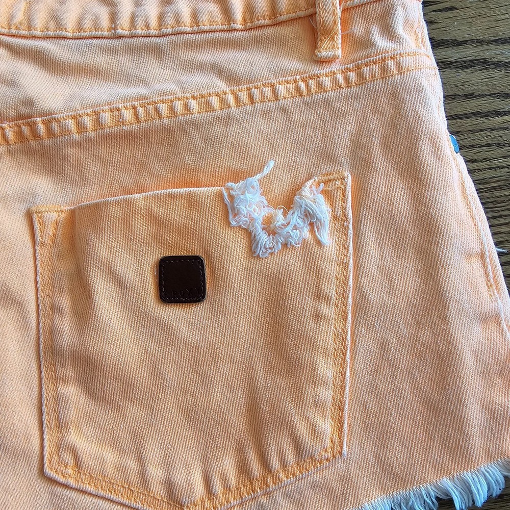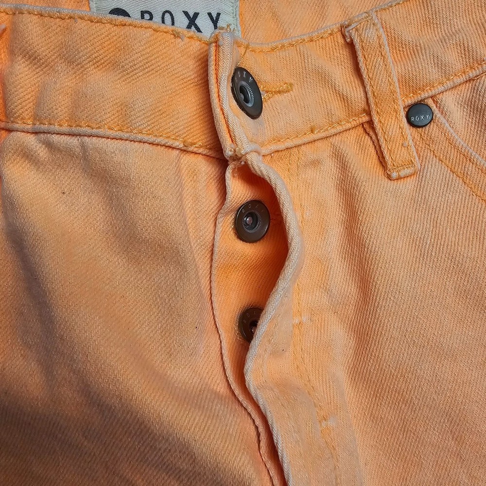 Roxy Bright Orange Diatressed Button Fly Jean Shorts Size 31 Mid Rise Raw Hem Measurements in photos B2869...