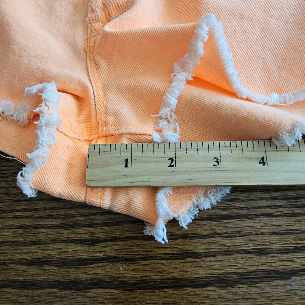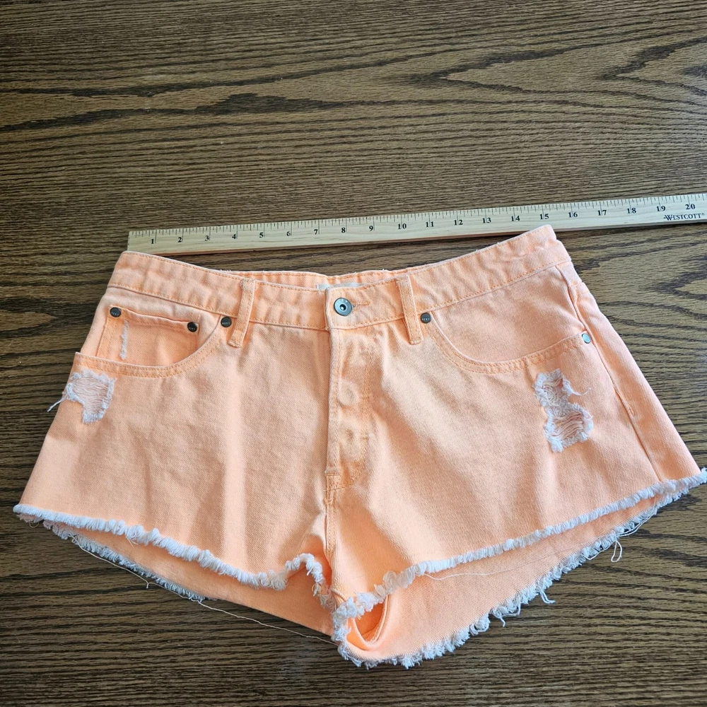 Roxy Bright Orange Diatressed Button Fly Jean Shorts Size 31 Mid Rise Raw Hem Measurements in photos B2869