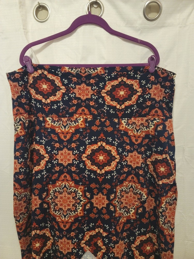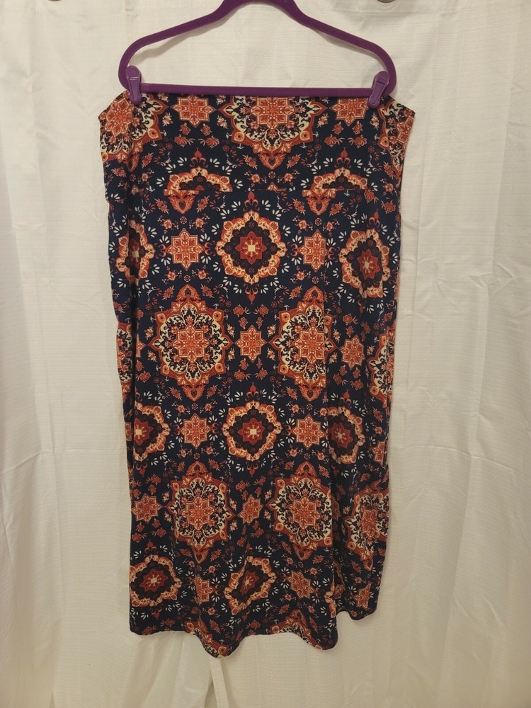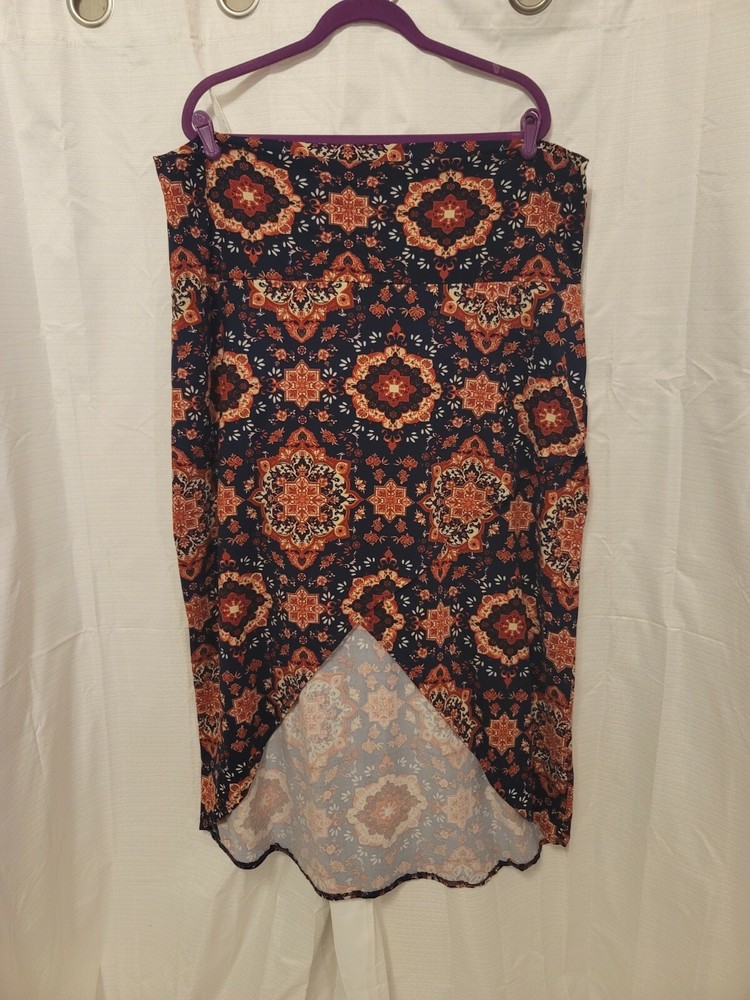 Rue 21 Blue & Orange Damask High-Low Skirt Women's Size 3X. Condition is "Pre-owned". Shipped with USPS First Class. Waist - 42" but stretchy Length in front - 23"/Back - 40"...