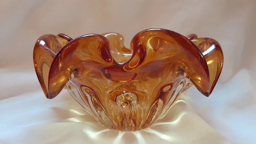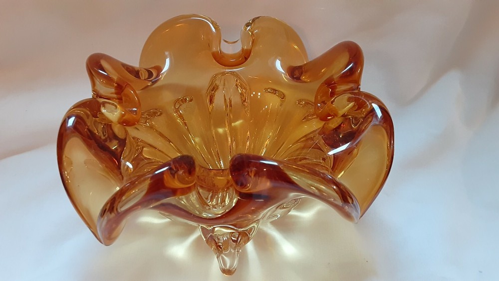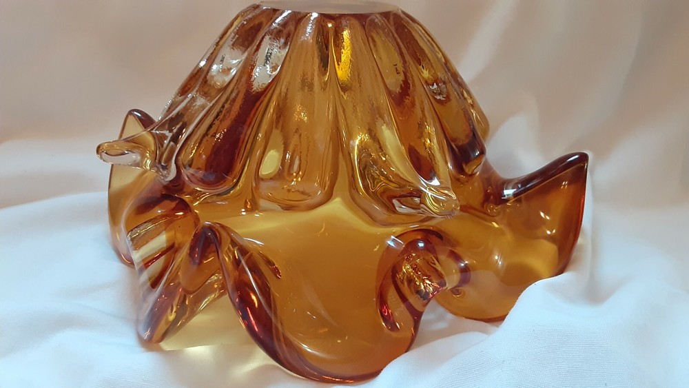 This stunning mid-century ruffled glass bowl is a vibrant showstopper! The bold orange-yellow hues catch the light beautifully, and the heavy, substantial feel adds luxury. Though it has minor wear underneath, the intricate ruffled design steals the show—perfect for displaying trinkets or as a standalone art piece. Packed with care, it arrived safely. Absolutely love it!