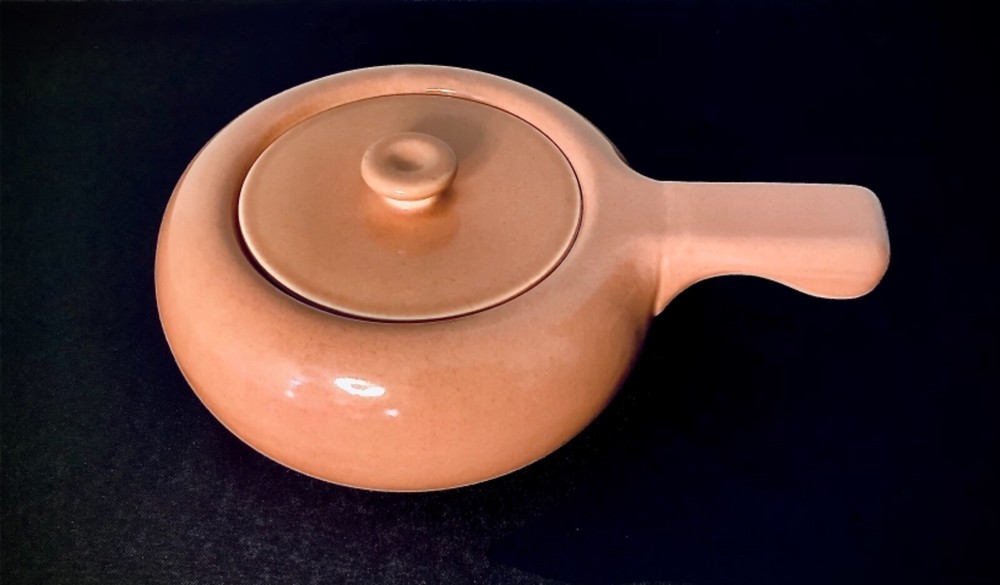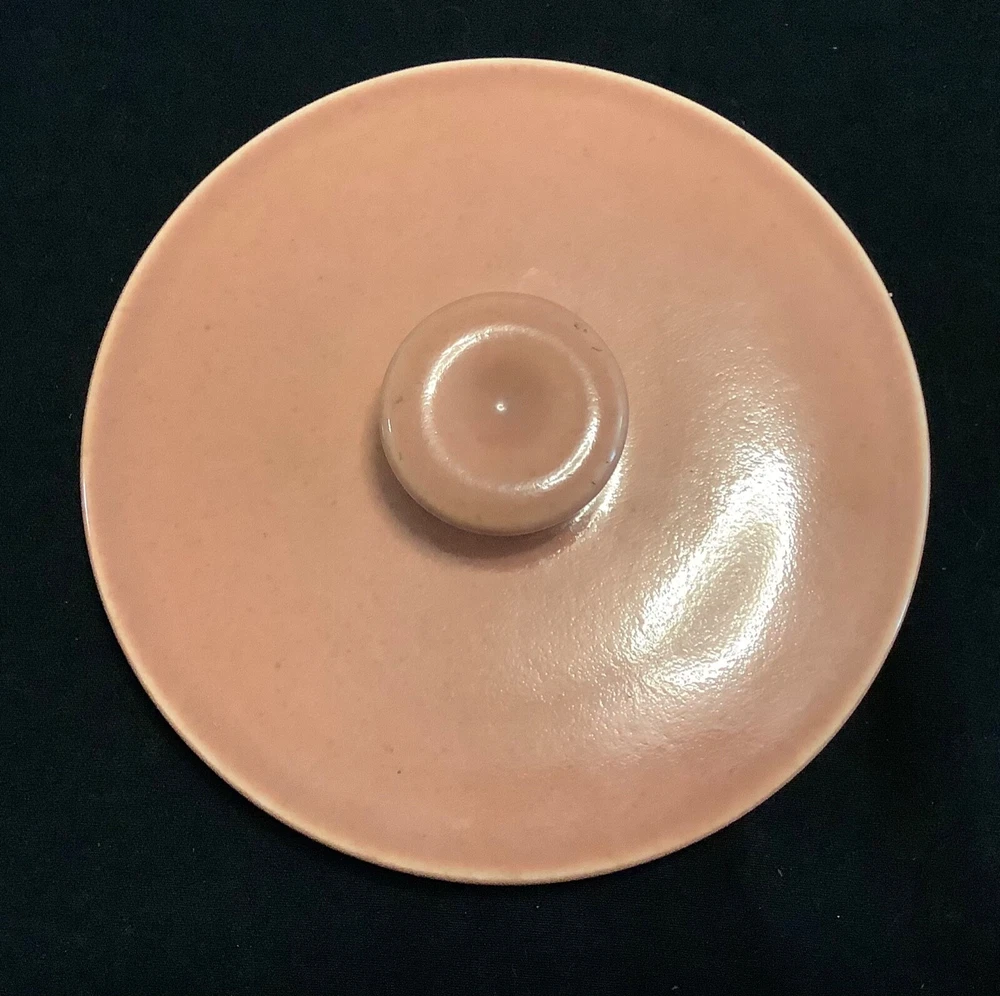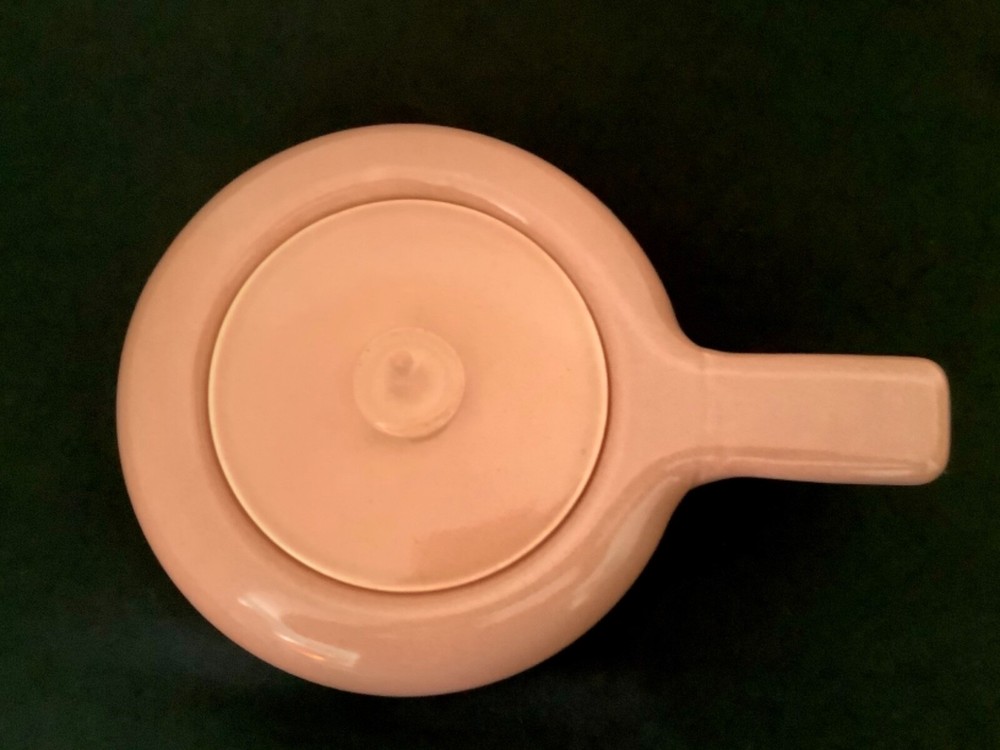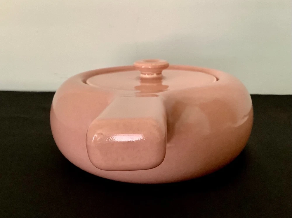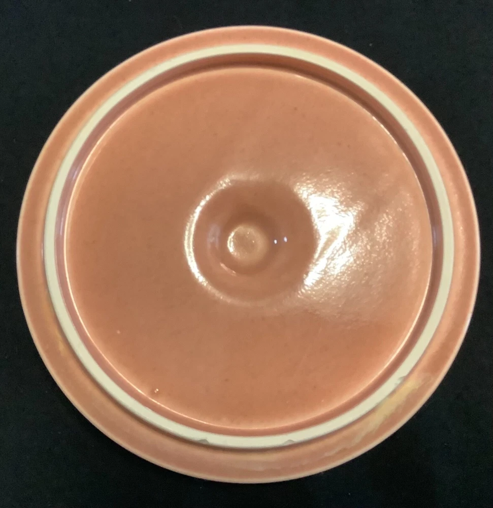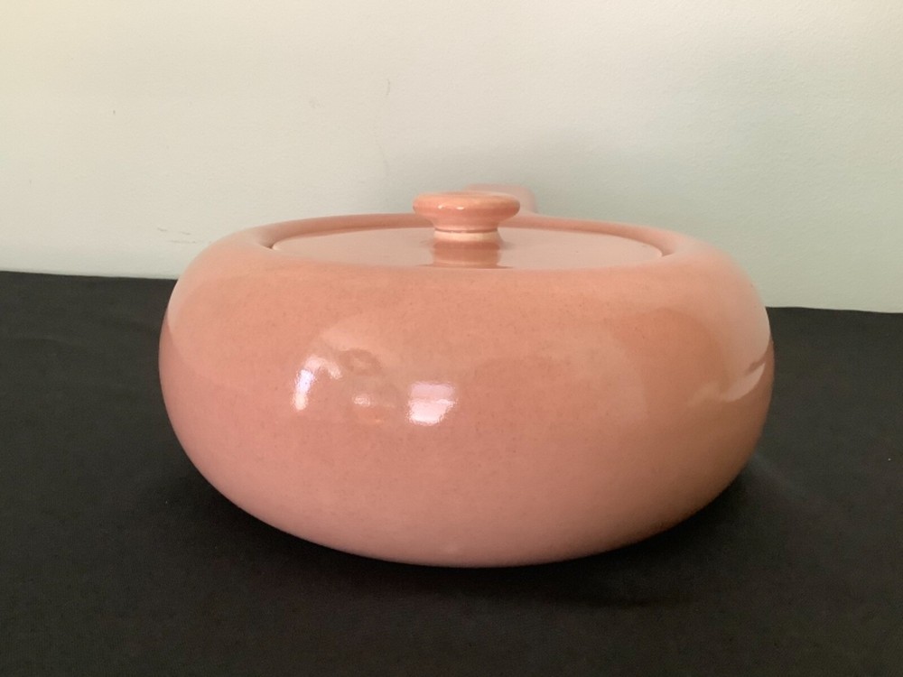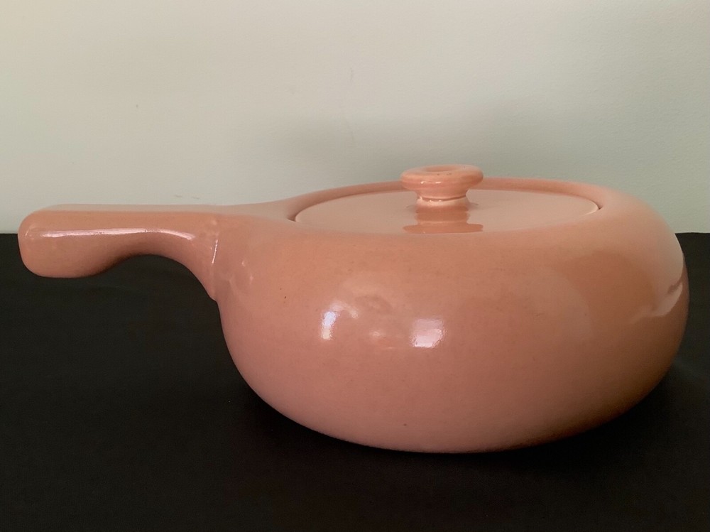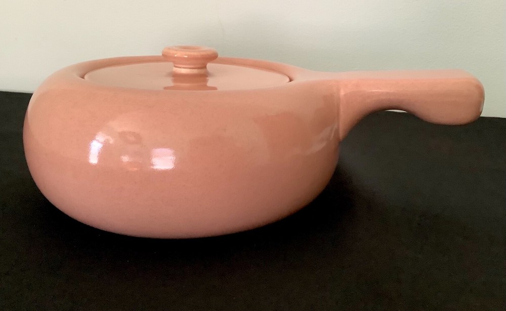 Russell Wright Mid - Century Steubenville American Modern Dinnerware Bean Pot Casserole “Russell Wright American Modern Dinnerware was produced in Steubenville Pottery of Ohio, introduced in 1939 and had sold some 250 million pieces by the end of 1950’s. The original colors were Seafoam Blue, Coral, Chartreuse, Grey, White, and Bean Brown”. Measurement: Height: 4 1/2 ‘’ with lid Length: 11 3/4’’ with handle Width: 8’’ Signed Russell Wright Steubenville Hard to read USA The Coral Bean Pot / Casserole is in very good condition Coral is one of the an original color . As with all 1950’s pottery it is rare to find a piece that has uniform color throughout. . The matching lid basically is in very good condition, however there is 3 small minimal nicks on outside rim ( see photo). They probably could be sanded smooth. All in all terrific condition for it’s age.