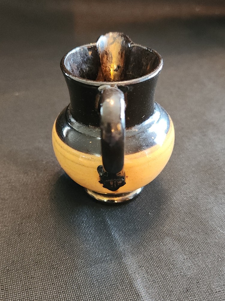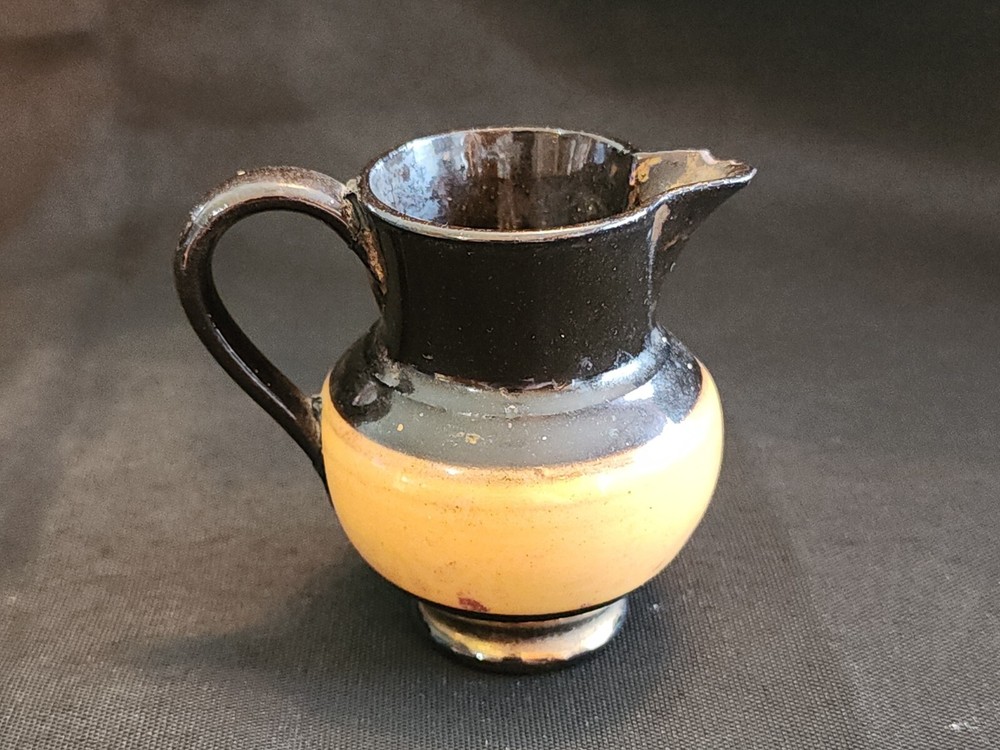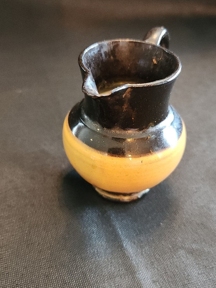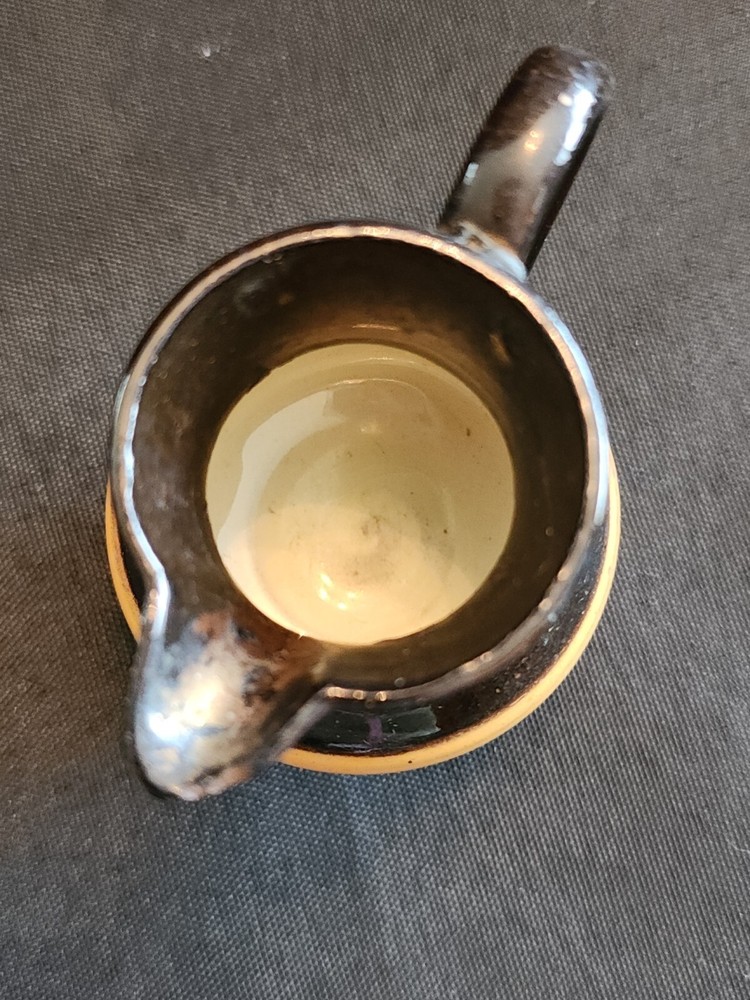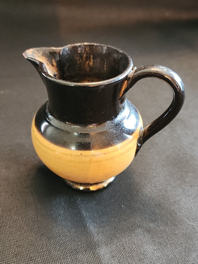 This stunning ceramic and copper pitcher from the mid-19th century is a rare find for any collector. The beautiful burnt orange and copper colors complement each other perfectly, making it a unique addition to any home decor. The luster creamer is an original piece manufactured in the United Kingdom by likely Staffordshire, with a model name of "LUSTRE CREAMER." Measuring at 3 inches in width, this medium-sized jug is a perfect example of early Staffordshire style and craftsmanship. The pitcher is an original, reproduction from the United Kingdom. This piece is a must-have for anyone who values the history and beauty of antique ceramics and is a perfect addition to any collection.