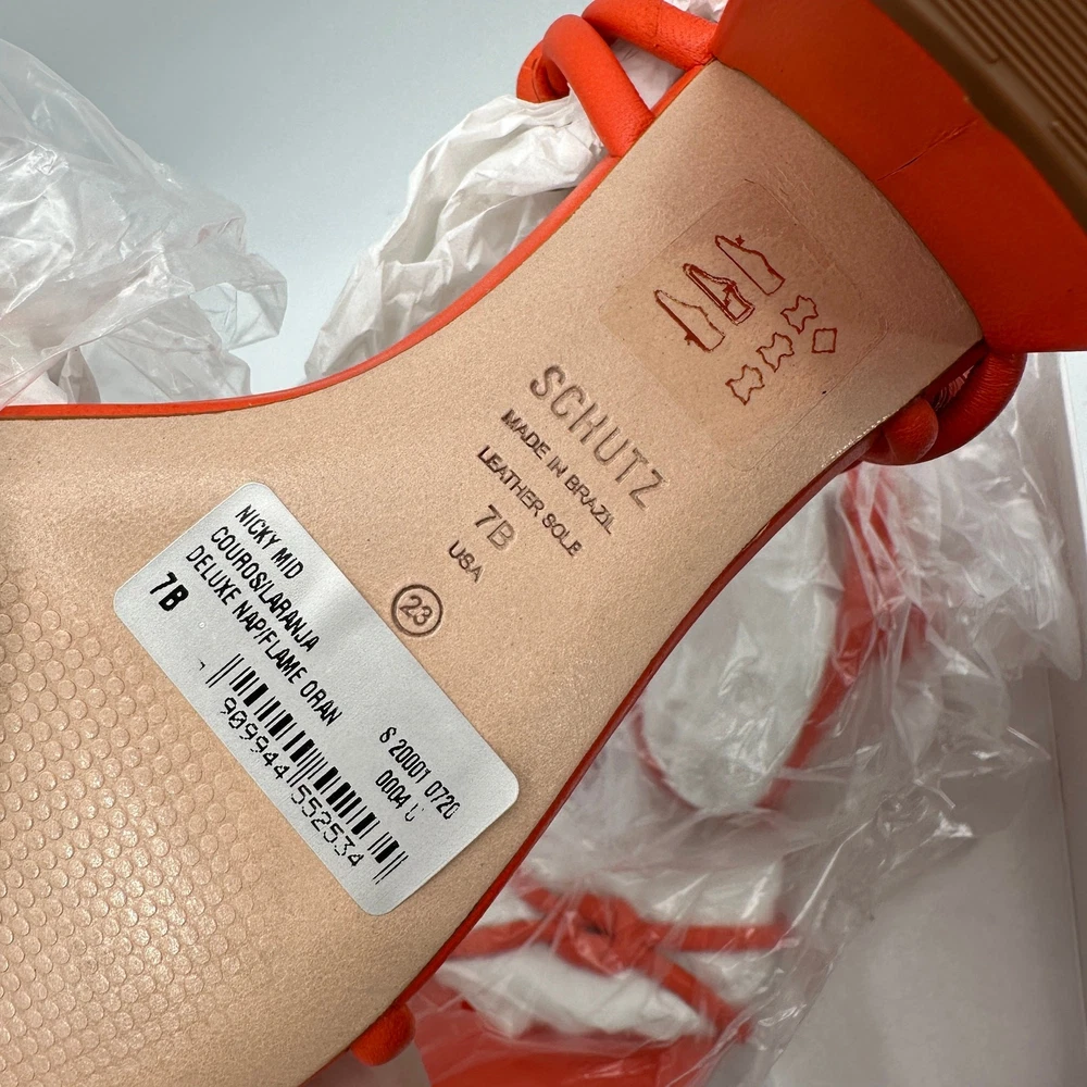 <![CDATA[<div>SCHUTZ Evereve Binky Mid Strappy Heel Sandal in Orange Size 7 New in box! $128 retail Orange strappy heeled sandal. Knotted straps add a stylish twist to these lace-up sandals by Schutz featuring a round toe and block heel. The smooth orange leather adds the perfect pop to any look from dresses to cropped denim. MEASUREMENTS Heel Height: 2.4" MATERIALS & CARE Material: Leather Style #: S20010720