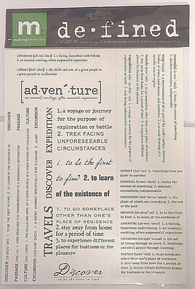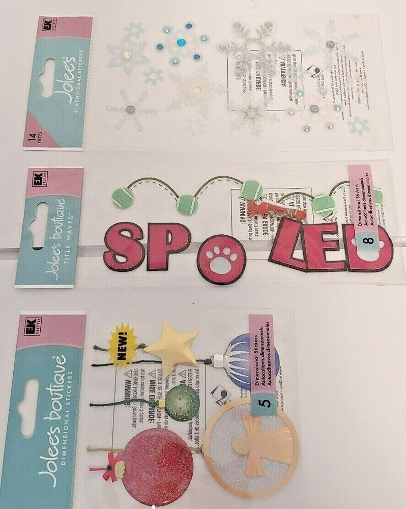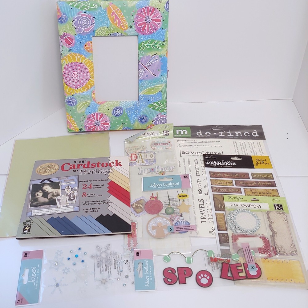 Lot of MISCELLANEOUS SCRAPBOOKING Supplies Includes: Framed Keepsake/Memory Box: Floral and Dragonflies. Measures approx. 12" x 9.25" x 2" M. Making Memories de fined: 8.5 x 11 sheet of adhesive backed card stock with TRAVEL themed definitions - unopened pkg. Marah Johnson Creative Imagination: Epoxy Sheet of stickers - unopened pkg. K&C Company: Cardboard FAMILY themed stickers - opened pkg. (7 of 18 stickers unused) K&C Company: Die-cut card stock labels - opened pkg. (missing some pieces, <40) Jolee's Boutique: Ornaments, Snowflakes, Spoiled -- Demensional Stickers - 3 unopened packages Paper Pizazz: 8x8 Cardstock, 24 textured sheets, 8 colors, acid-free 10 sheets of 8.5 x 11 cardstock