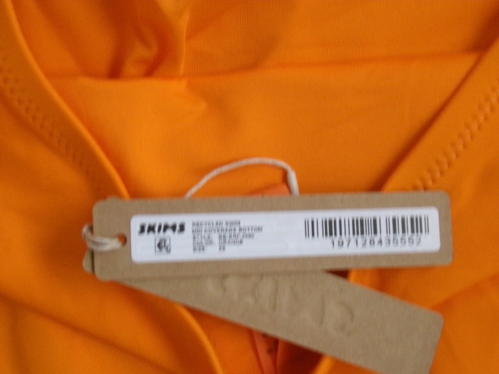 Elevate your beach look with these SKIMS Recycled Swim Bottoms in size 3X. The mid-coverage bikini style and elastic waist make them comfortable for all-day wear. The lightweight and stretchy nylon and spandex material ensure a flattering fit. Hand wash only to keep them looking their best. These orange bottoms are perfect for any beach or pool day. The solid pattern and plus size type make them a versatile addition to any swimwear collection. Get ready to turn heads with these stylish and sustainable SKIMS bottoms.