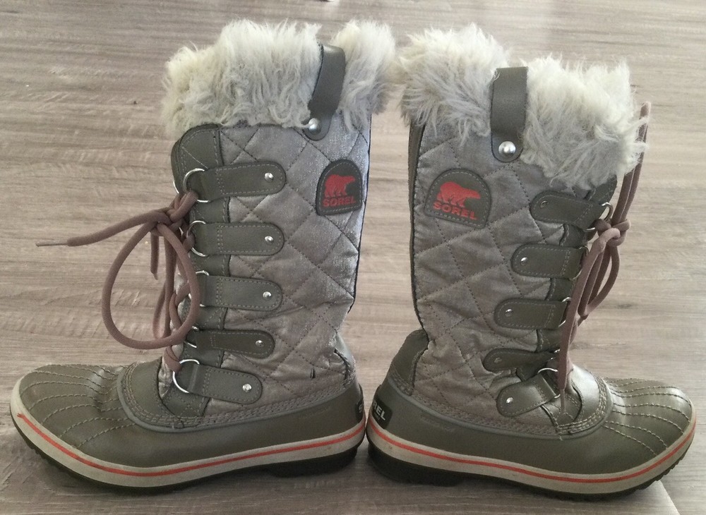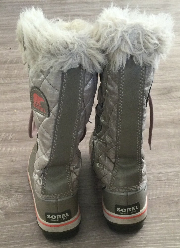 Step out in style this winter with these SOREL Tofino Organza Snow Boots in Gray and Silver. These boots feature a round toe shape and a tie closure secure fit. The boots have a low heel height and come with a fur trim accent for added warmth and comfort. The boots are perfect for travel, activewear, and casual occasions. They have a mid-calf shoe shaft style and a block heel style. The boots are made by SOREL, a trusted brand in the shoe industry. They are available in US size 6 and UK size 4. Please refer to the pictures for AU size. These boots have a metallic theme and are not vintage. They are ideal for the winter season and will keep your feet warm and dry.