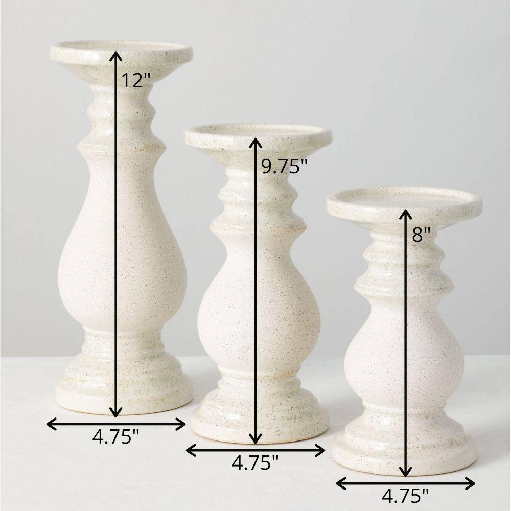 Contact Us Add to Favorite Contact Us Fast Shipping Hassle Free Return eBay Money Back Guarantee Authenticity Guarantee Features Candle holders are suited for LED or standard pillar candles Unique shape offers enhanced visual appeal Flat round surface offers a stable space for candles Item Description Terracotta, clay, and even concrete have unique properties of being sustainable, safe, durable and versatile enough for every style! Over the last 52 years, Sullivans has become an industry leader in home decorations. Our brand is rooted in tradition while incorporating modernized trends to keep your home looking up to date with timeless style. Here at Sullivans, we pride ourselves on creating product designs focused on quality and value, ensuring that our customers have access to beautiful products at reasonable price points. Candle Holder Type: Pillar Color Family: White Color/Finish: White Indoor/Outdoor: Indoor Material: Ceramic Number of Pieces: Set of 3 Placement: Tabletop Product Weight (lb.): 4 lb Returnable : 30-Day Style: Farmhouse Product Height (in.): 12 in Product Width (in.): 4.75 in About us Customer service is our top priority! Please be sure to read the description thoroughly to make sure that this is the item you want before making a purchasing decision. We make every effort possible to accurately describe and depict the items. Please be aware that slight variations in color may be due to differences in lighting and computer monitor resolutions. In the unlikely and unforeseen event that we are unable to fulfill your order through any of our networked warehouses. Payment PayPal is our preferred method of payment. If you do not have a PayPal account, all major credit cards are gladly accepted through PayPal as the payment processor. PayPal offers great buyer and seller protection. Your order will be processed pending receipt of cleared payment through PayPal. Sales tax may be charged depending on your location. Shipping We provide fast, free shipping. Most items are shipped within 3-5 business days of receiving cleared payment. We ship to the lower 48 contiguous United States only. We do not ship to P.O. Boxes or APOs. For select items, we ship internationally through eBayâ??s Global Shipping Program. We do ship most of our smaller items internationally using eBays Global Shipping Program. If ordering electrical items outside of the U.S., please note that they will come equipped with a standard U.S. voltage plugs. You will need a suitable adapter to use the item in your country. Certain restrictions apply. Standard or Economy Shipping is ALWAYS FREE! You will be notified via eBay messages as soon as your items ship. Special Notice for Freight Items: If an item ships via Freight (Truck) Delivery, a valid phone number will be required so that we can contact you to schedule delivery. The item may be delivered with curbside delivery. An adult signature will be required. Please be sure to have available help on hand to assist you with moving the item to the desired location in or outside of your home. Freight items must be inspected upon delivery. In the unlikely event that damaged is observed, you MUST refuse delivery and note the damage on the shipping receipt and send it back via the Freight carrier. Returns will not be accepted on Freight items after they have been delivered, inspected, and the driver has left the premises. Returns We offer a 30 day return/exchange policy for most of our products. You can request a refund if you are dissatisfied for any reason with your product. (Restocking Fee May Apply). Only factory defects are accepted as a reason for a return. In the case of factory defects, if available, we will replace the product for you. When returning an item, it must be in all of the original packaging and include all of the original accessories or items that came with it. The item and package should be in original and perfect condition. You will be required to cover shipping on the return of non-defective items. All returns MUST be done within 30 days of date of purchase. Please note that we cannot give refunds or replacements after the 30 day limit has expired. When sending in a return, please note that it can take up to 7 business days for the return to be processed. We do our best to process as quickly as possible. We are extremely fair, and in the rare event of something out of the ordinary happening with our products or shipping, we will gladly work with you to find a fair resolution. Disclaimer Were sorry, but we do not honor product exchange requests. If you need to exchange an item received, you will need to go through the normal returns process identified in our returns section and then order the correct item, if it is still available. Orders are processed immediately and dispatched to fulfillment as soon as they are received. For this reason, we are typically unable to honor cancellation requests. If you need to cancel the transaction, please contact us as soon as possible and we will attempt to cancel the order. If the order has gone too far through the fulfillment process, we will be unable to cancel. In that event, you would need to wait until you receive the item and go through the normal returns process as mentioned in the returns section of our policies. Payment Options Shop With Confidence Copyright ©2023, All rights reserved. Listed by Sku Fetch