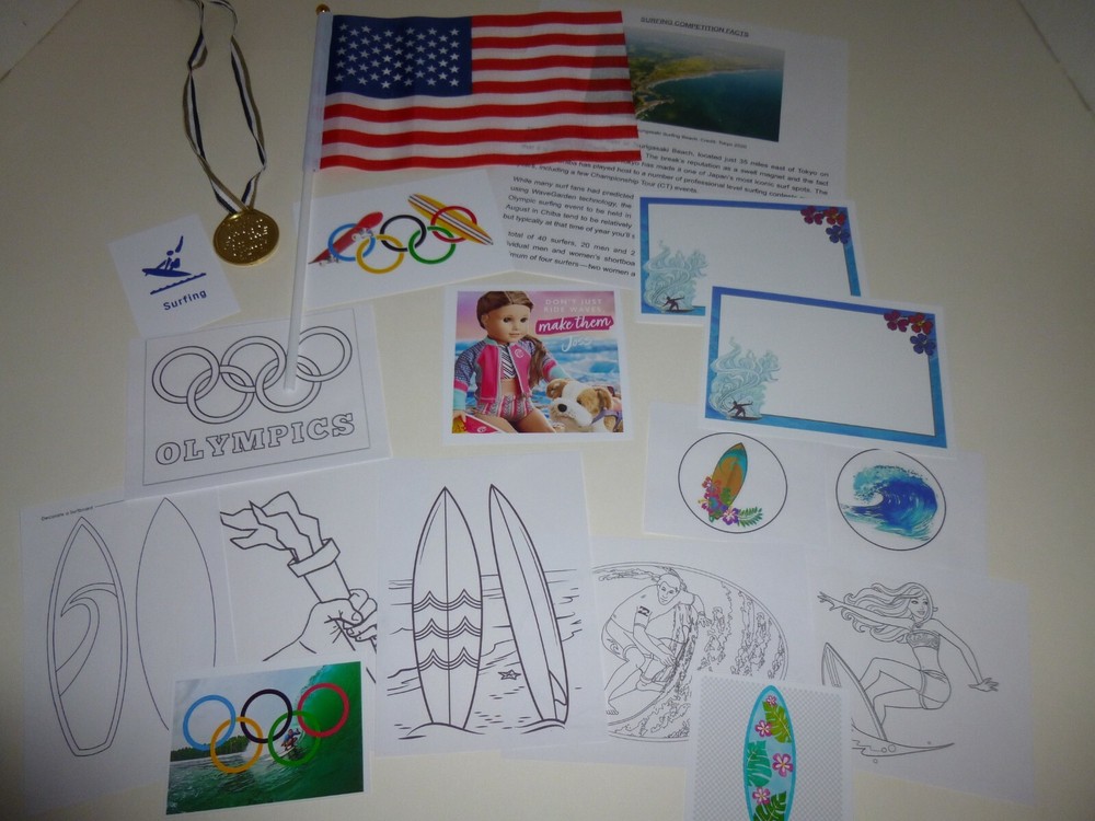 This auction is for a great SURFING OLYMPICS set that would be just perfect for your American Girl or any doll. Your dolls can use it to celebrate the Olympics or just for Surfing themed fun. The set includes: USA Fabric Flag Gold Medal "Shoot For The Stars" (Ribbon length can be adjusted to fit doll or child) 2 Surfing Note Cards Beautiful Photo of Joss in her surfing outfit Photo of Olympic Rings with Surfboard & Skateboard (2 new Olympic sports) Surfing Competition Article 2 Stickers- Surfboard Ocean Wave 3 Small Pictures- Surfboard Surfing Pictogram Olympic Rings & Surfer 6 Tiny Coloring Pages- Surfboards Girl Surfing Boy Surfing Decorate a Surfboard Olympic Rings Olympic Torch THIS SET IS FROM A PET-FREE , SMOKE-FREE HOME. YOUR ORDER WILL BE CAREFULLY PACKED SO THAT IT WILL ARRIVE SAFELY.