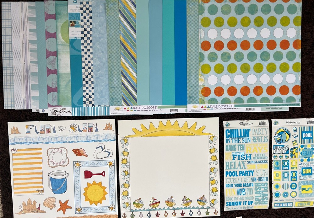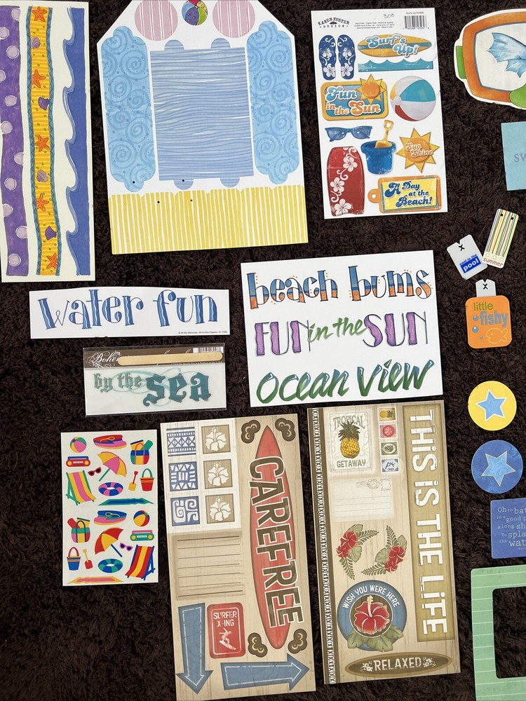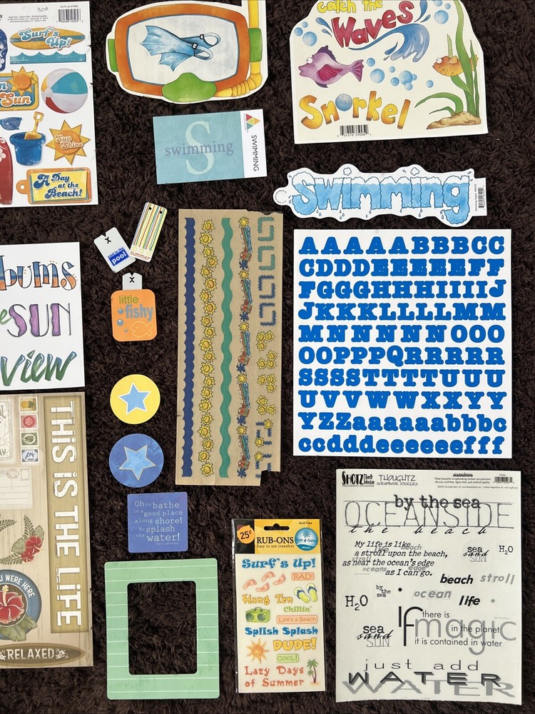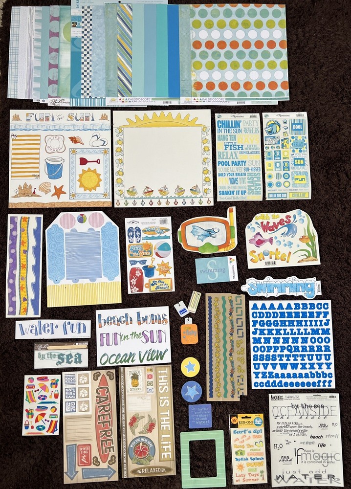 This is a SWIMMING Themed Embellishments Kit featuring products from My Minds Eye, Provo Craft, Reminisce, Mrs Grossman, American Traditional Designs, Ever After Scrapbook Co, Karen Foster, All My Memories, Me & My Big Ideas, Creative Imaginations, Creative Memories, and Close to My Heart. It includes 18 12x12 papers, border paper, frames, borders, journal block, alphabets, titles, sayings, tags, stickers, and rub ons. This is great for scrapbooking, crafting, and card making. I am happy to combine shipping so check out my other listings. Smoke free, pet free home