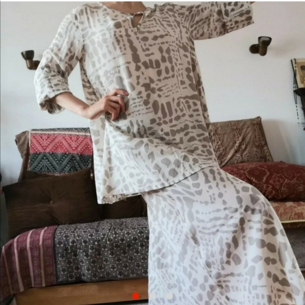 This chic Sahara co-ord set is a stunning summer find! The giraffe print in grey and white makes it unique yet versatile—perfect for formal events or standout daytime looks. The relaxed fit and elastic waist ensure comfort, while the adjustable sleeves add a customizable touch. Lightweight fabric means nude underlayers are a must, but the quality is flawless. True to size (fits a UK 12), it’s barely worn and feels brand new. Love how effortlessly stylish it is!