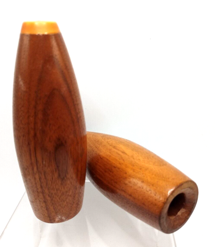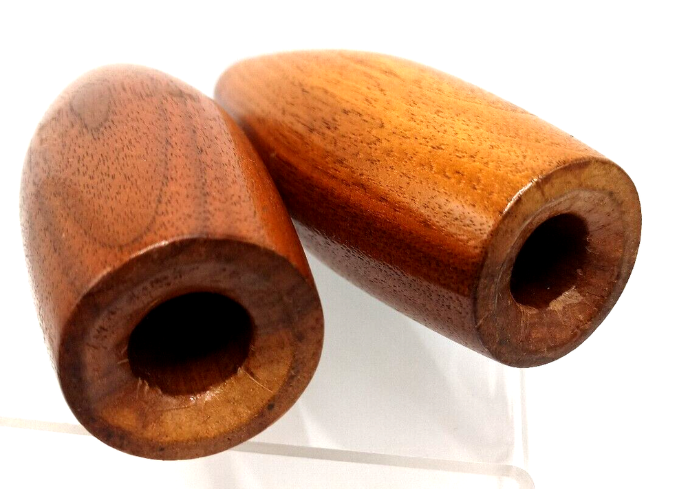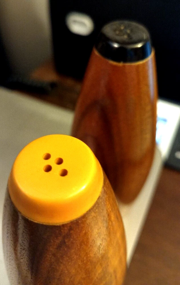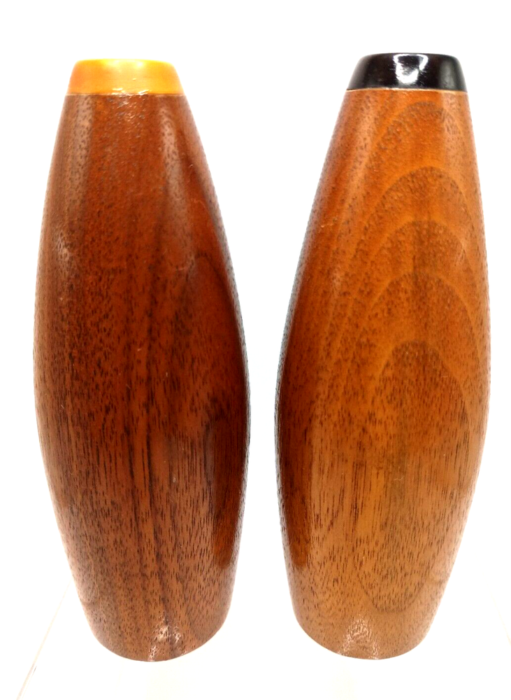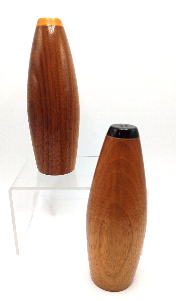 Sleek, atomic style mid century modern wooden salt and pepper shakers with plastic caps. Do need new corks as stoppers. None included....