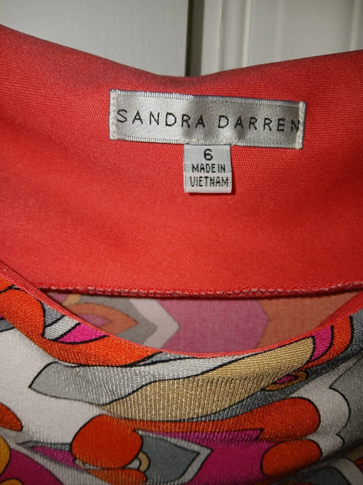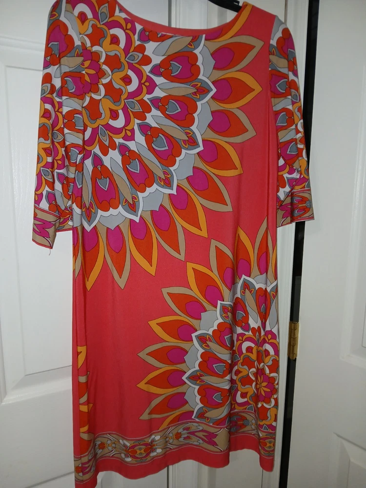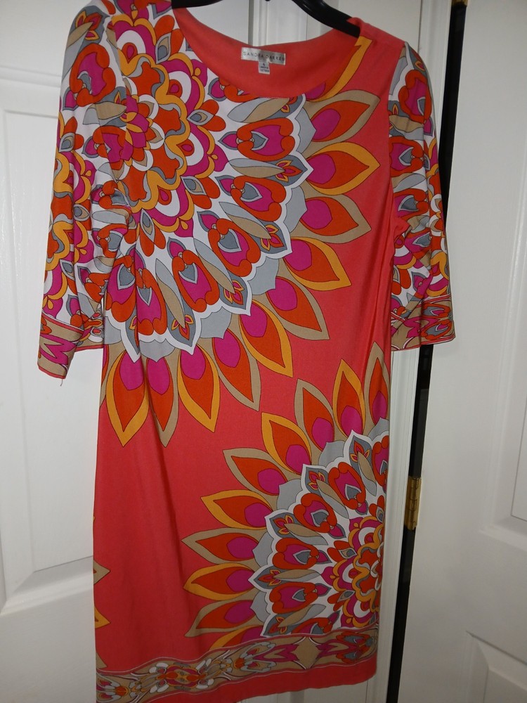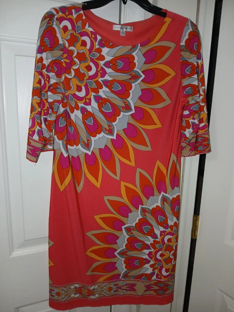 This is a Sandra Darren dress for women, featuring a retro hippie bohemian style with a geometric pattern in orange. It has a scoop neck, 3/4 sleeves, and a knee-length shift silhouette. Made of polyester and spandex knit fabric with a stretch feature, this pullover dress is perfect for parties, casual outings, or business events in any season. It is a size 6 and should be hand washed only.