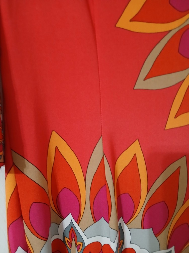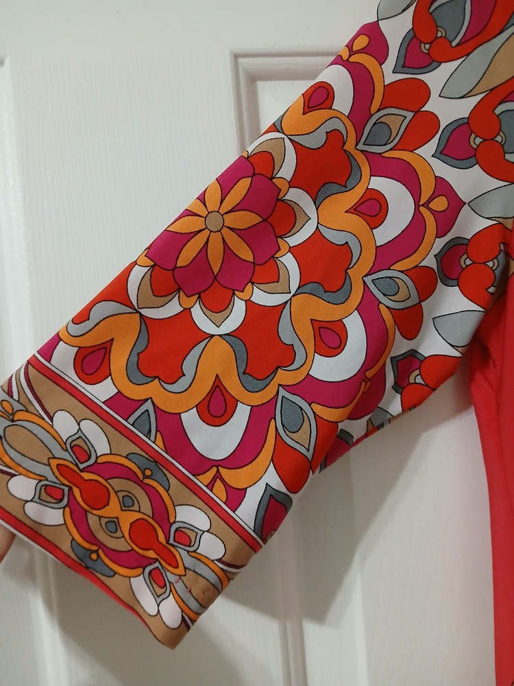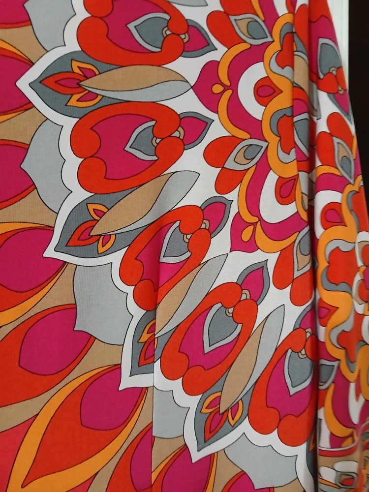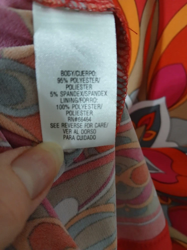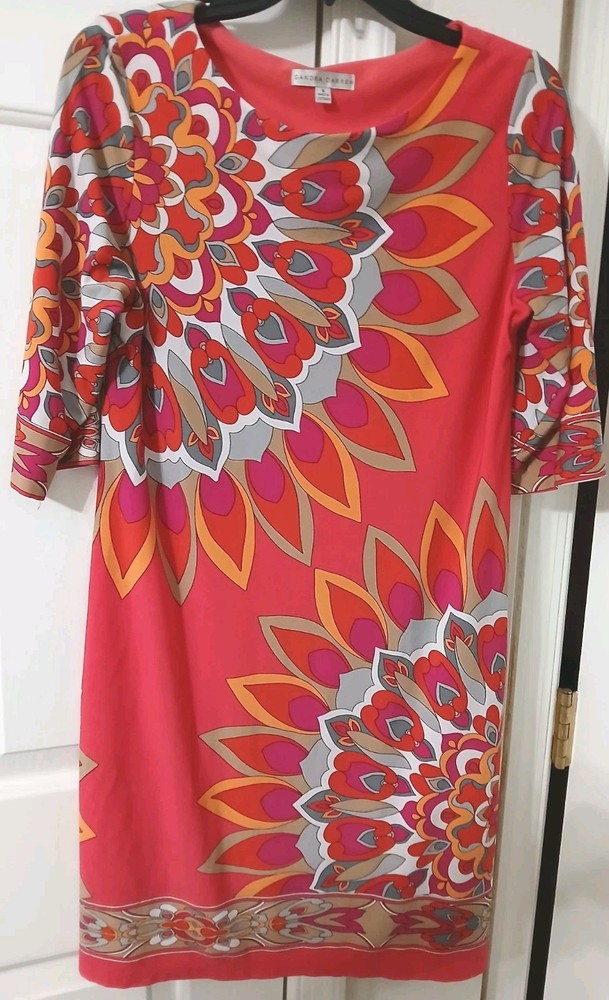 This is a Sandra Darren dress for women, featuring a retro hippie bohemian style with a geometric pattern in orange. It has a scoop neck, 3/4 sleeves, and a knee-length shift silhouette. Made of polyester and spandex knit fabric with a stretch feature, this pullover dress is perfect for parties, casual outings, or business events in any season. It is a size 6 and should be hand washed only.