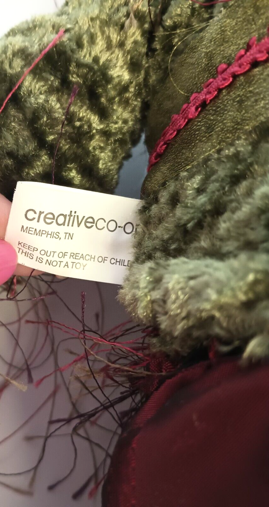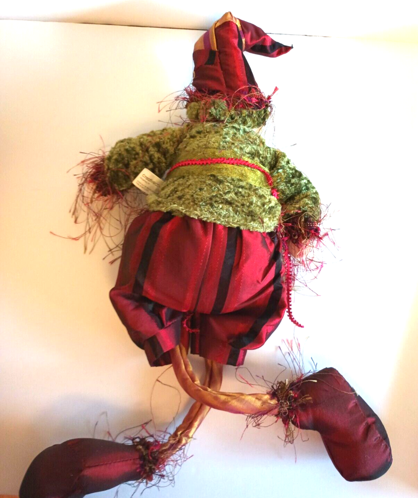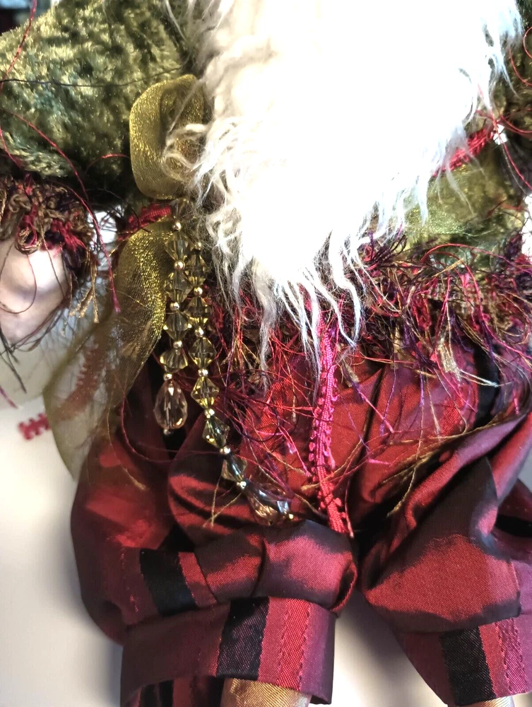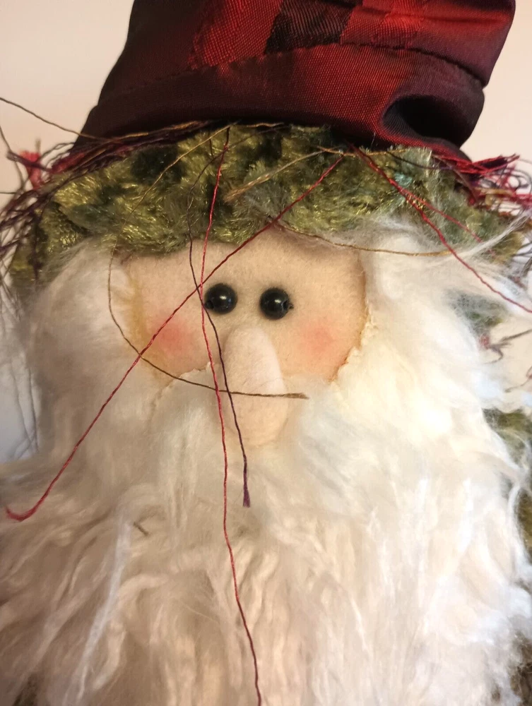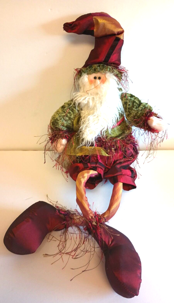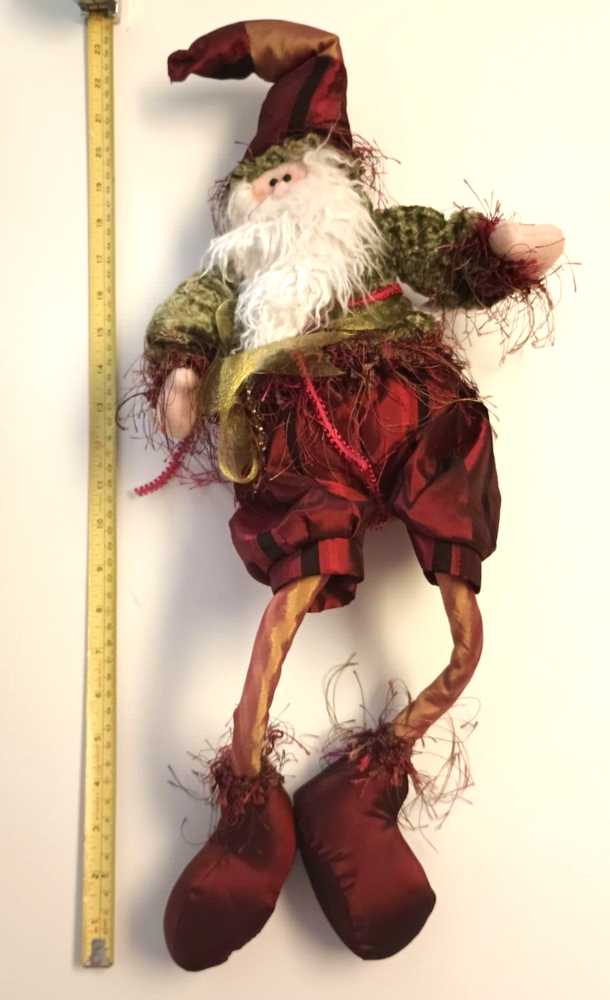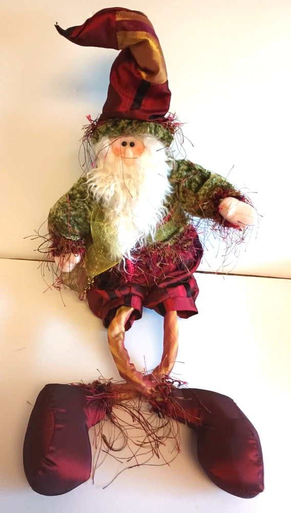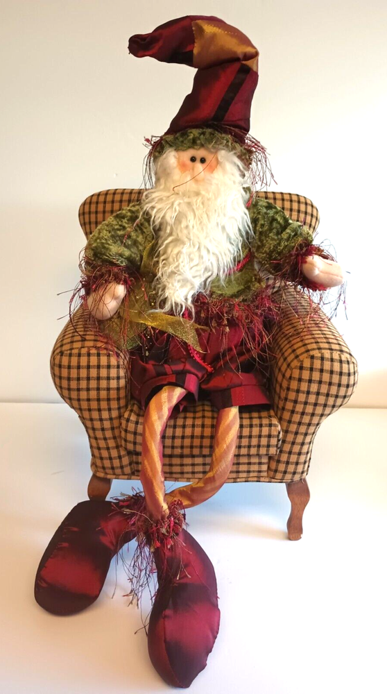 A Long Legged Sitting Santa with Weighted Bottom Dressed in Textured Green Sweater and Burgundy Satin Plaid Shorts and Hat with embellishments of Hairy Ribbon and Beads. Hat is Bendable but arms and legs are not. It measures 24" long and 7" wide at the shoulders ***Chair not included, sold separately in my shop ** Good condition Please see pictures as that is a part of the description.