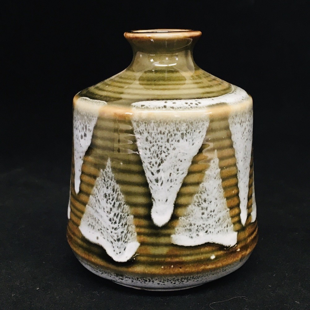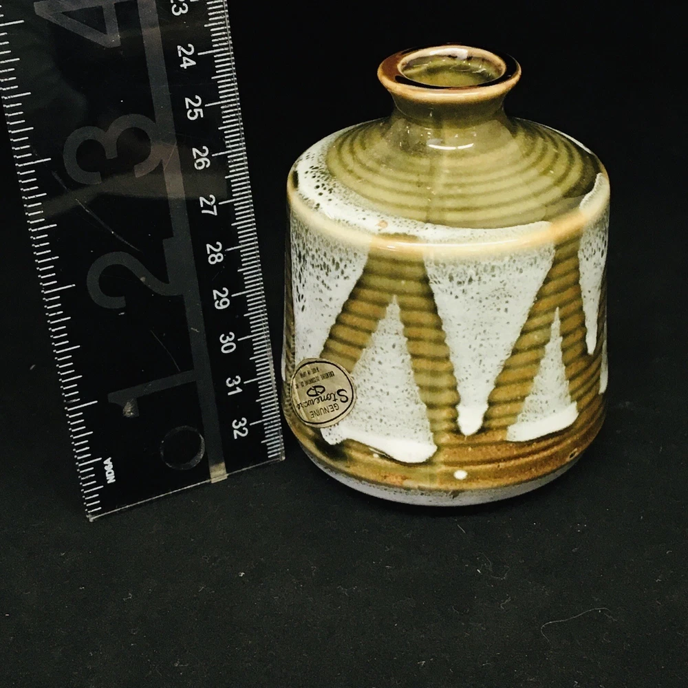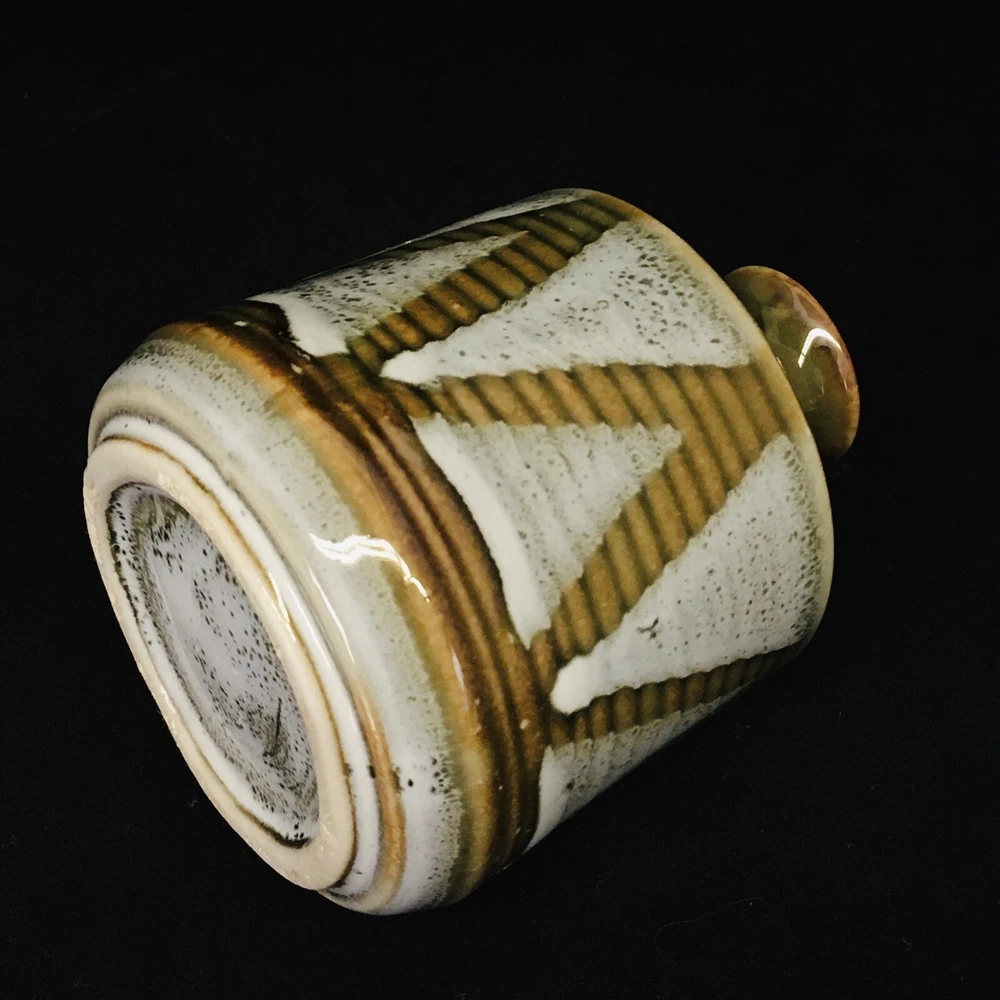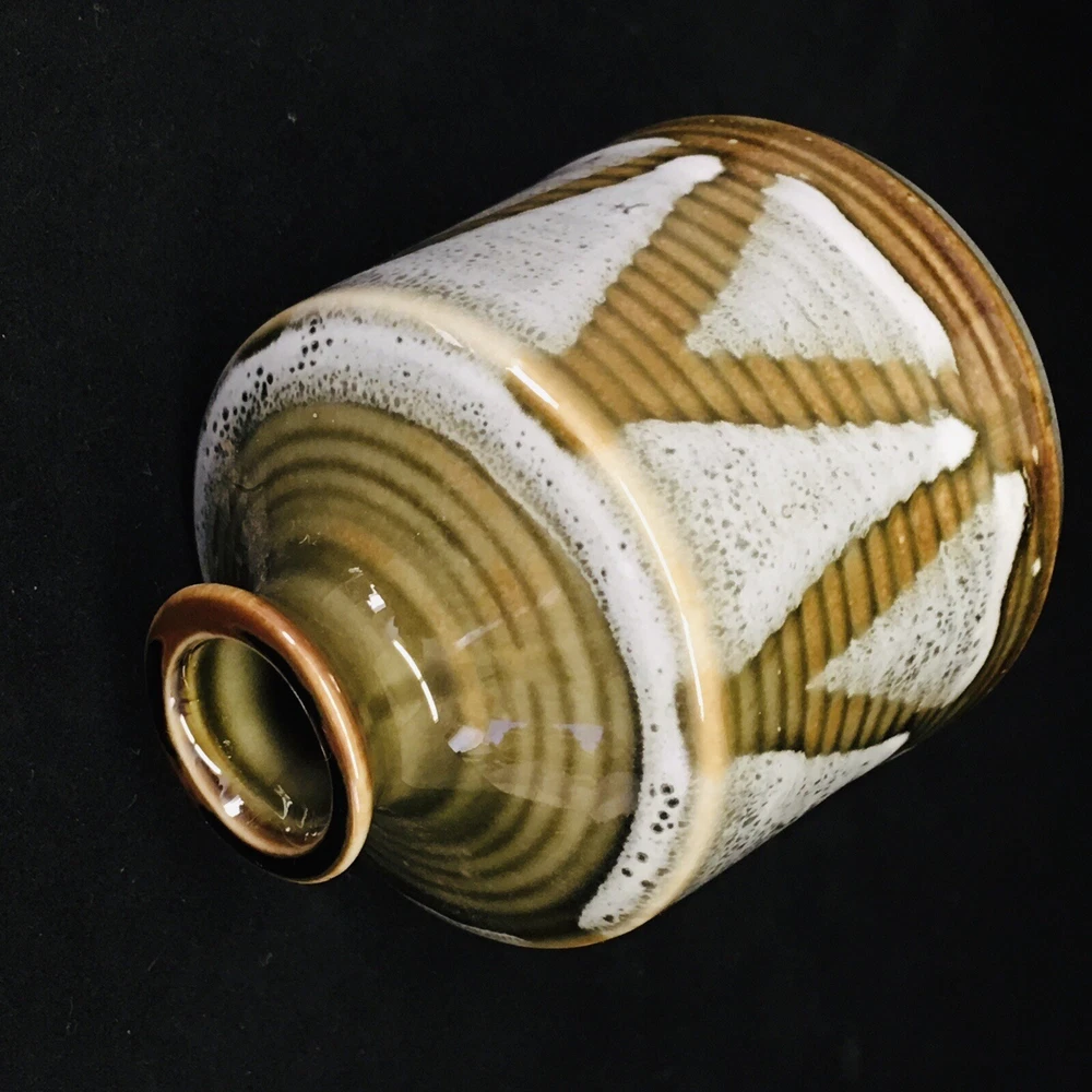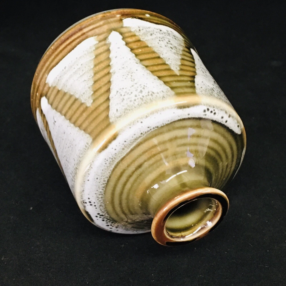 Sawtooth Weed Pot Genuine Stoneware Creative Decorative Co Inc Made in Japan Original Foil Sticker Brown Tone Rings Gray-white Arrowheads Sawtooth Chevron Designs Mid-Century Modern Measures Approximately: 3½“ Tall 2¾ “ Wide 2“ Diameter Base Please ask any questions you may have. Thanks for shopping with Crystal & Jules!