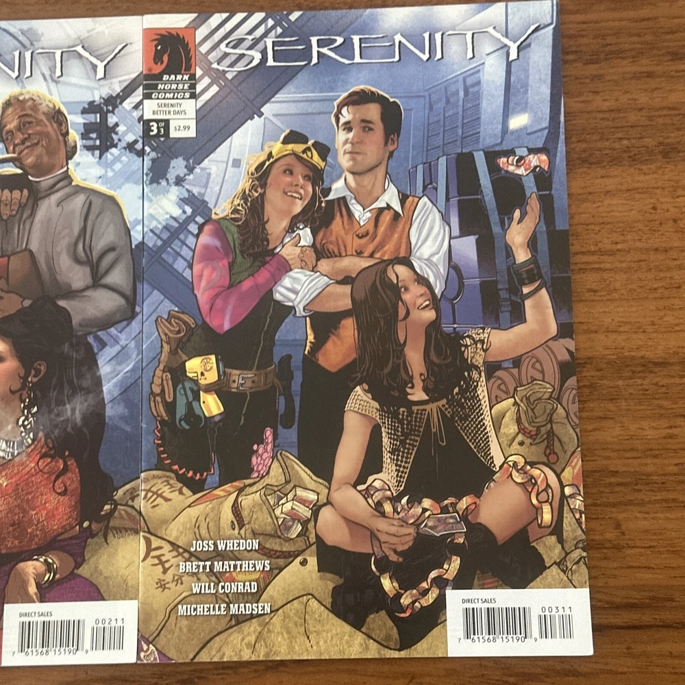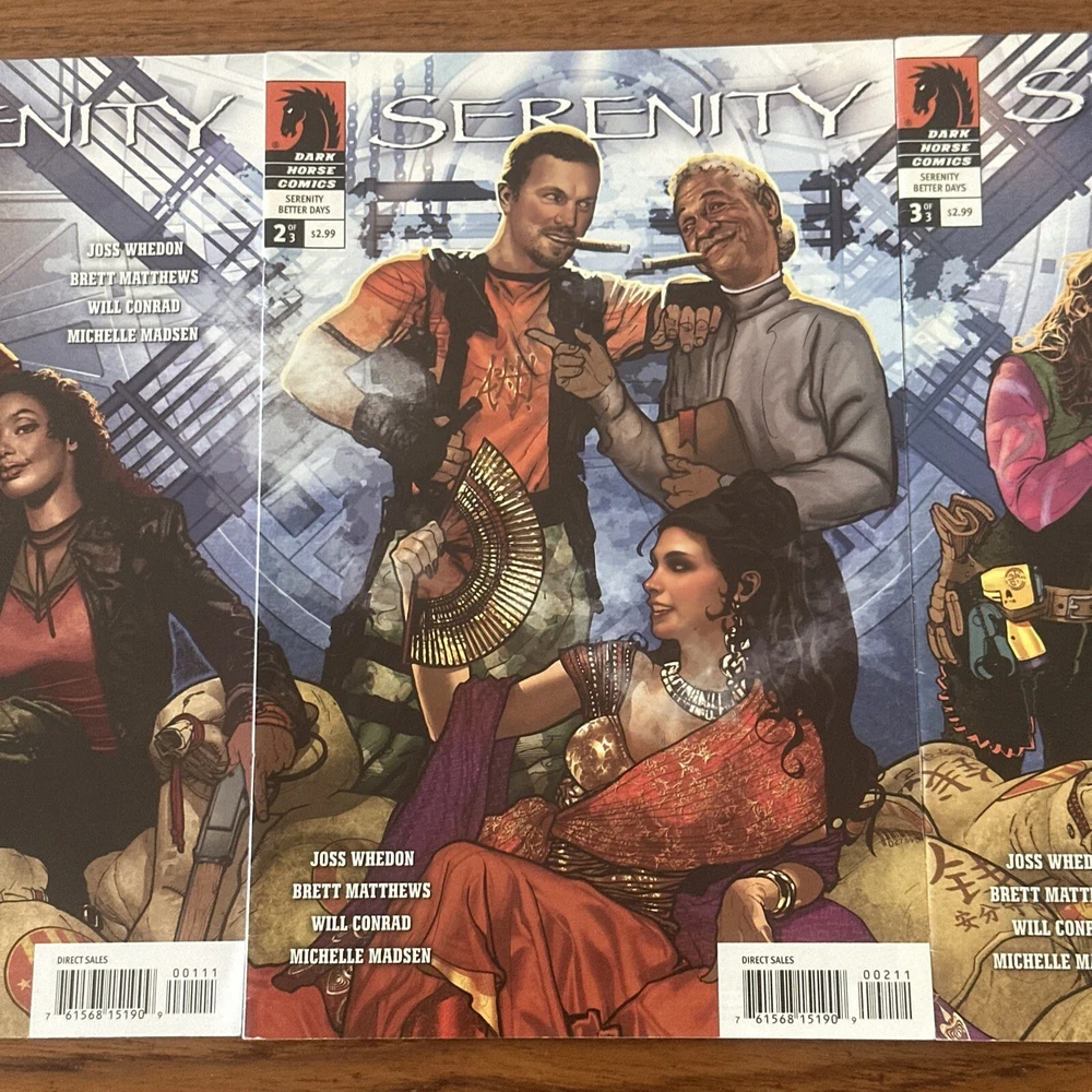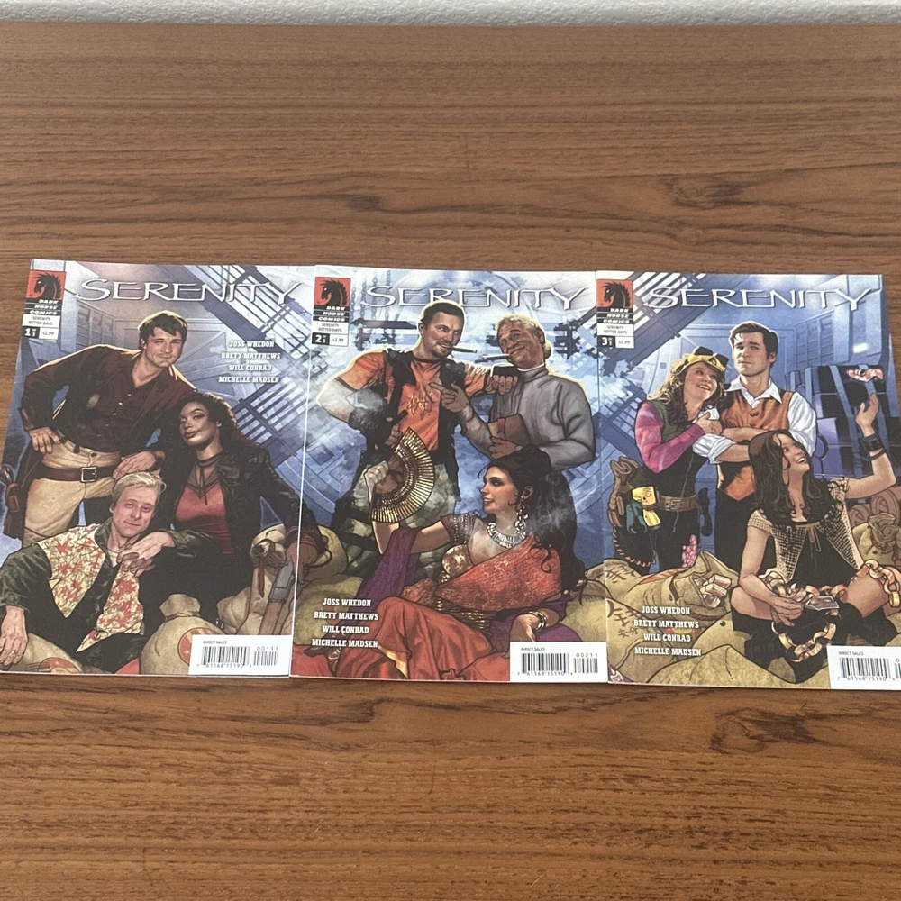 This 3-issue set of Serenity: Better Days comic books by Joss Whedon and Adam Hughes is a must-have for any Firefly fan. The colorful illustrations and commercial comic style make this set a great addition to any comic book collection. The set includes all three issues, each with a unique cover and numbered pages. The story takes place in the Firefly universe and follows the characters as they try to make a better life for themselves. The comic books are in English and were published by Dark Horse in 2008. The intended audience is general, and the story is suitable for anyone who loves the Firefly universe. This set is uncertified and is a modern age comic book.