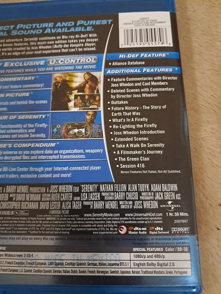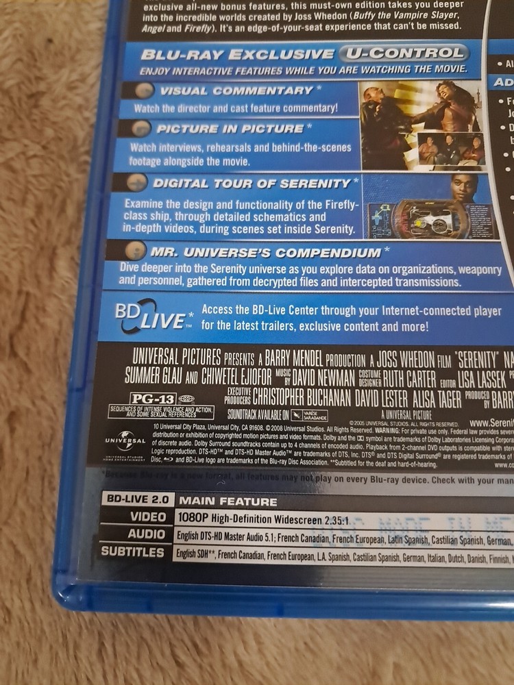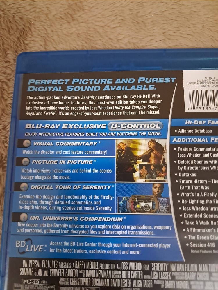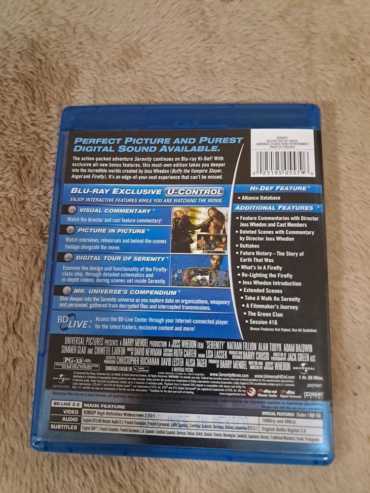 Experience the thrilling science fiction world of Serenity, directed by Joss Whedon and produced by Barry Mendel. This Blu-ray edition, released in 2005, offers a 2.35:1 aspect ratio and a run time of 119 minutes. Enjoy the combined shipping available for this Universal Studios production, which features English, French, and Spanish language options and subtitles. Immerse yourself in the PG-13 rated storyline of Serenity, which follows the crew of a World War II submarine who find themselves stranded in a foreign world filled with danger and wonder. With an incredible cast and gripping visuals, this movie is a must-see for any science fiction fan. Get your hands on this limited edition Blu-ray edition today! VISIT AND FOLLOW THE STORE FOR MORE GREAT FINDS AND COLLECTIBLES!!!