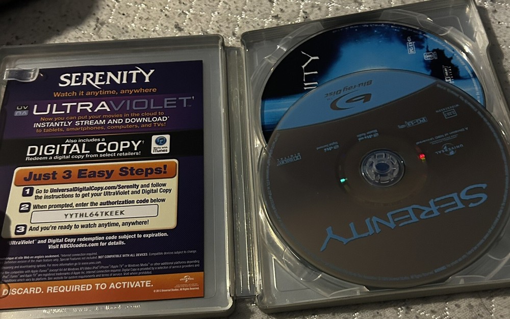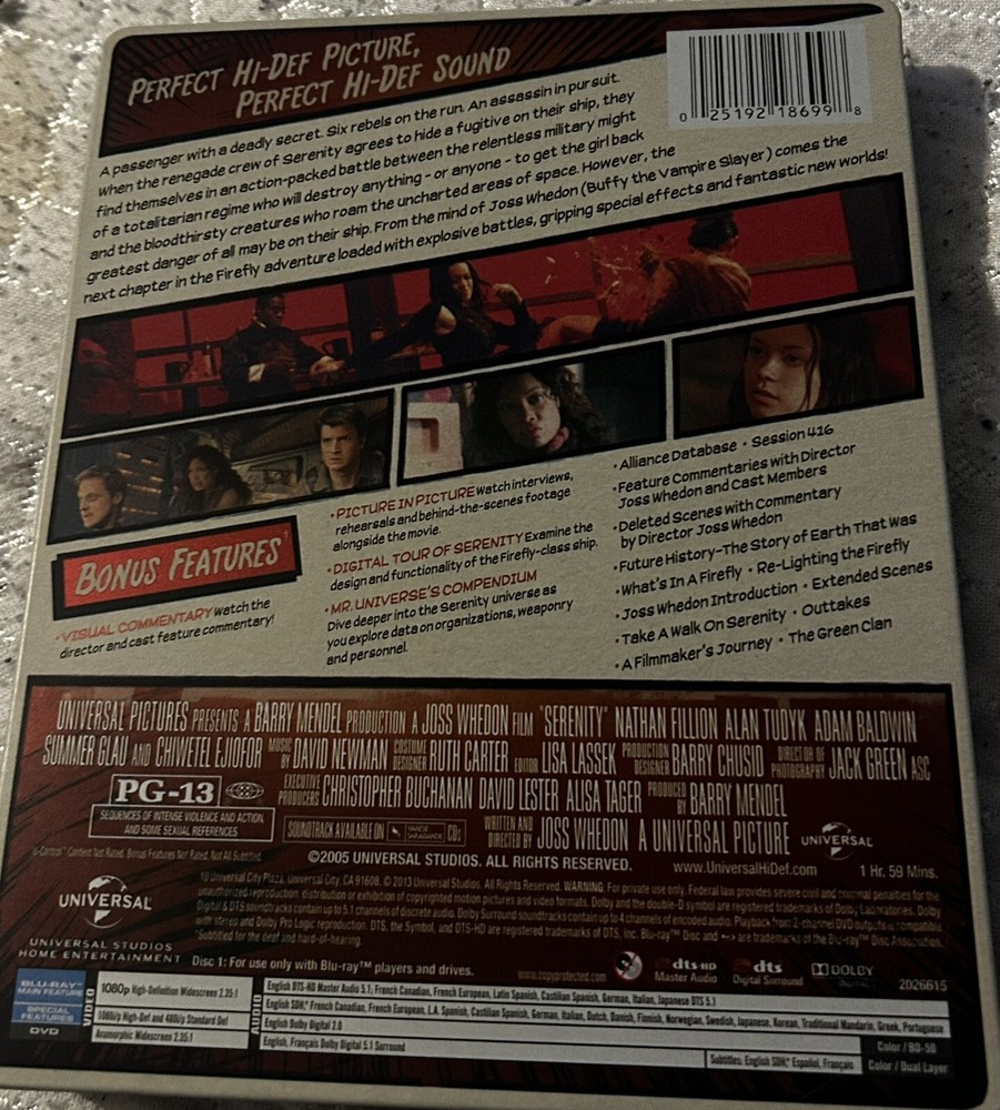 Immerse yourself in the world of Serenity, a thrilling action and adventure film directed by Joss Whedon. Starring Gina Torres and Nathan Fillion, this Blu-ray/DVD set is a must-have for fans of the genre. The 2-disc set includes a digital copy and an Ultraviolet version, making it a versatile addition to your movie collection. Experience the excitement and drama of Serenity, set in the 23rd century during a civil war. The film is rated PG-13 and is perfect for those who love action, adventure, and a touch of science fiction. Add this item to your DVD or Blu-ray collection today and enjoy the ultimate viewing experience.