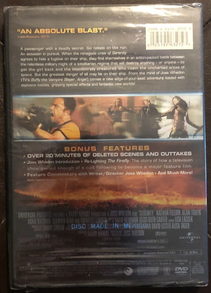 Serenity DVD 2005 Nathan Fillion Joss Whedon Widescreen New Condition see pics As shown in picture#4 there is a rip in the seal but it is intact and new still. Thanks