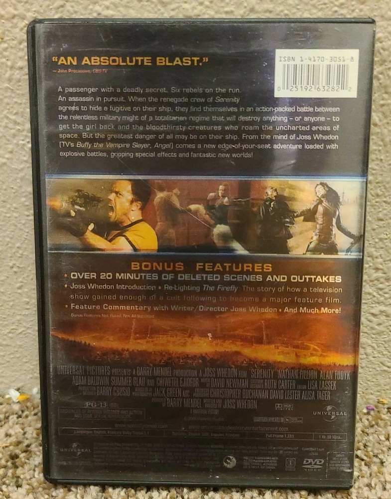This DVD is a must-have for any sci-fi fan! The story is gripping, the characters are unforgettable, and the action keeps you hooked. The disc arrived quickly and was in excellent condition—no scratches or issues. Perfect for rewatching Whedon's brilliant work. Highly recommend!