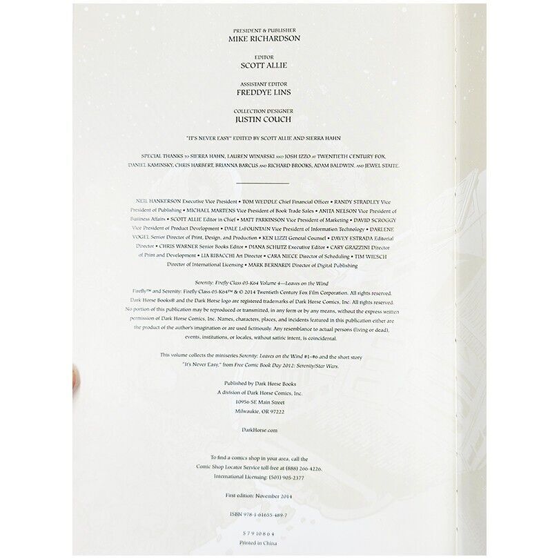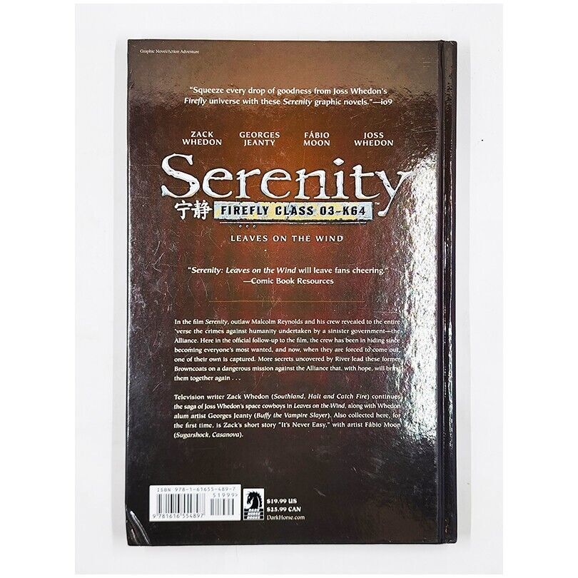 Product Details ISBN: 1616554894 EAN: 9781616554897 Format: Hardcover Publisher: Dark Horse Comics Publication Date: 2014 Pages: 152 Reading Age: Young Adults, Adults Product Dimensions: 0.75 x 7 x 10.5 inches Language: English BOOK OVERVIEW "Serenity: Leaves on the Wind" picks up after the events of the movie Serenity, continuing the story of Captain Malcolm Reynolds and his crew aboard the Firefly-class spaceship. As the crew faces the aftermath of rebellion and betrayal, they find themselves hunted by the Alliance while trying to rebuild their lives in the blackness of space. Packed with thrilling action, deep character moments, and compelling narrative arcs, this graphic novel offers fans of the Firefly universe an unforgettable continuation of the beloved series. With stunning artwork and storytelling by Joss Whedon, Zack Whedon, Georges Jeanty, and Karl Story, this hardcover Edition is a treasure for both long-time fans and newcomers alike. ABOUT THE AUTHOR Joss Whedon is a celebrated writer, director, and producer known for creating cult-classic television shows such as Buffy the Vampire Slayer, Angel, and Firefly. In addition to his work in TV and film, Whedon has contributed to numerous graphic novels and comic books, continuing the stories of his iconic characters in dynamic and engaging ways. His unique storytelling style blends sharp wit, emotional depth, and thrilling action, earning him a worldwide fan base. For items without product details. Please refer to the actual images for information. Product Condition Please read the store's product description, review images of the item for sale for accurate details, and ask questions when in doubt before purchasing the item. VERY GOOD. All pages and the cover are intact (including the dust cover, if applicable) and not marred by notes or highlighting. The spine may show signs of wear. Some books, "but not all books," may include inscriptions or dedications. Due to the age or quality of the paper, they may develop signs of foxing. Feedback Dimittas Home Book Collection eBay feedback is automatically generated after leaving positive feedback. Thank you so much.