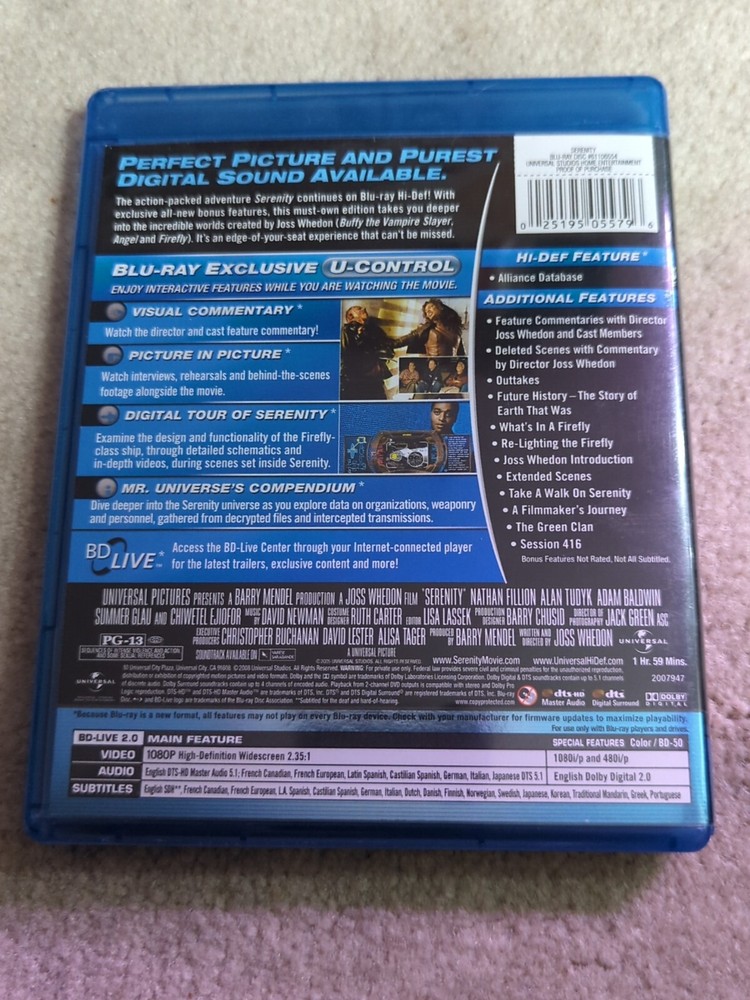 This Blu-ray disc features the 2005 science fiction film "Serenity", directed by Joss Whedon and produced by Barry Mendel. The movie stars a talented cast and has a run time of 119 minutes. It is rated PG-13 and has subtitles available in English, French, and Spanish. The disc has an aspect ratio of 2.35:1 and is in the Blu-ray format. It features audio in English, French, and Spanish, making it accessible to a wider audience. The movie is a must-watch for fans of the science fiction genre and is a great addition to any collection.