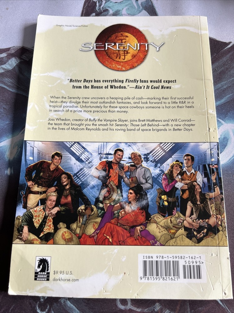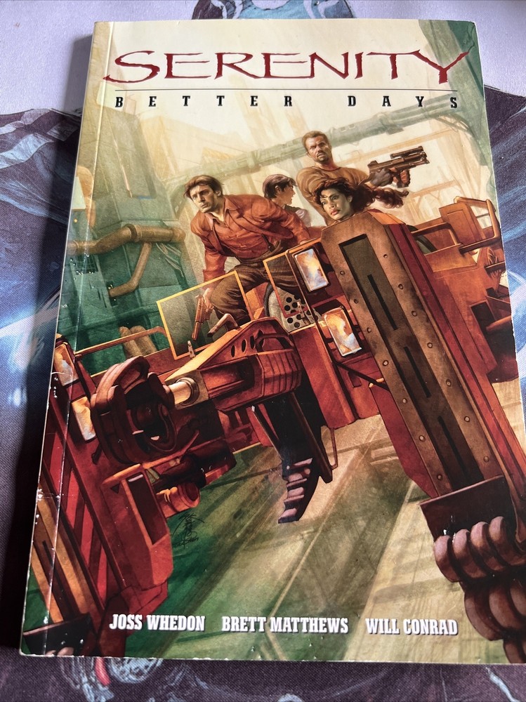This is a paperback copy of Serenity, Vol. 2: Better Days, written by Joss Whedon and illustrated by Michelle Madsen, Will Conrad, and Brett Matthews. It features a stunning cover art by Jo Chen and was published in 2008 by Dark Horse Comics. The comic is in English language, belongs to the Science Fiction genre and is part of the Serenity series. This issue number 2 is a must-have for any fan of US Comics, Comics & Graphic Novels, Collectibles, or Comic Books & Memorabilia. It is set in the Modern Age (1992-Now) era and is sure to provide hours of reading enjoyment.