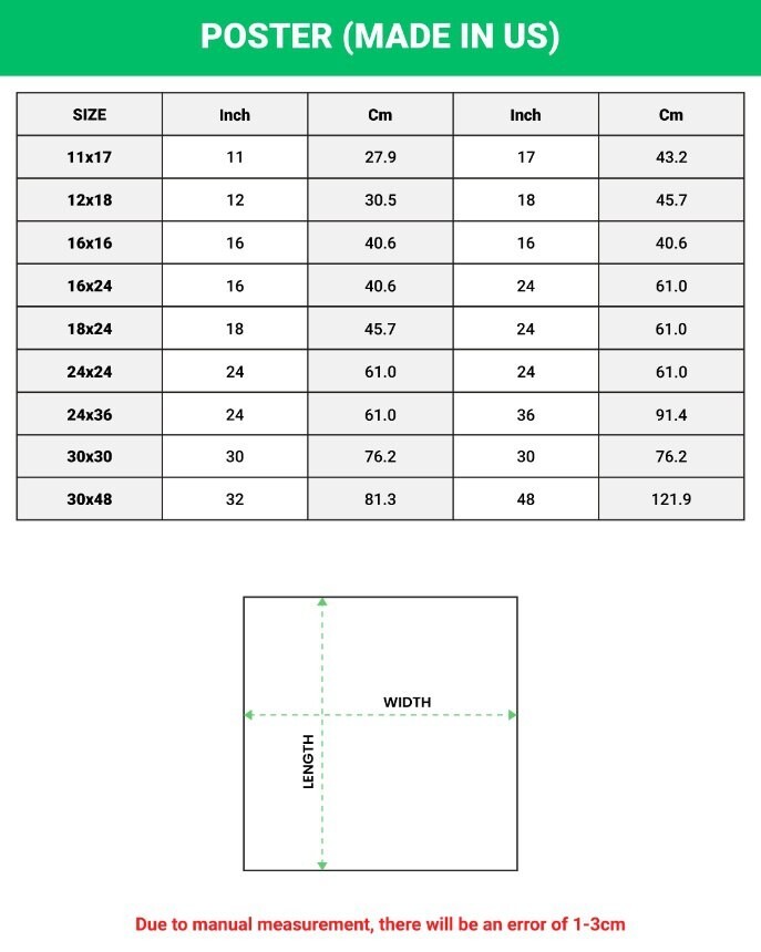 Make your room more colorful and add characters to your space with this simple custom Poster. Made from high-quality paper, our posters are perfect to hang on the wall. You can easily decorate any space from a party, bedroom, bathroom, kids room, living room, office, dorm, and more with our print poster. I also accept printing on demand - High-quality resin-coated photo base paper. - Smooth surface, maximum color gamut, dmax, and image resolution. - Heavyweight (230 gsm); 9 mil base. - Wrapped in protective tubes. *FRAME NOT INCLUDED* Please note colours can be less vibrant on print than what you see on screen for obvious reasons but please be assured all are printed to the hights quality. This Print comes in 4 ready-to-frame sizes: 12"x18" 16"x24" 24"x36" 32"x48" Let us know if you have any questions. Thanks for visiting our shop!