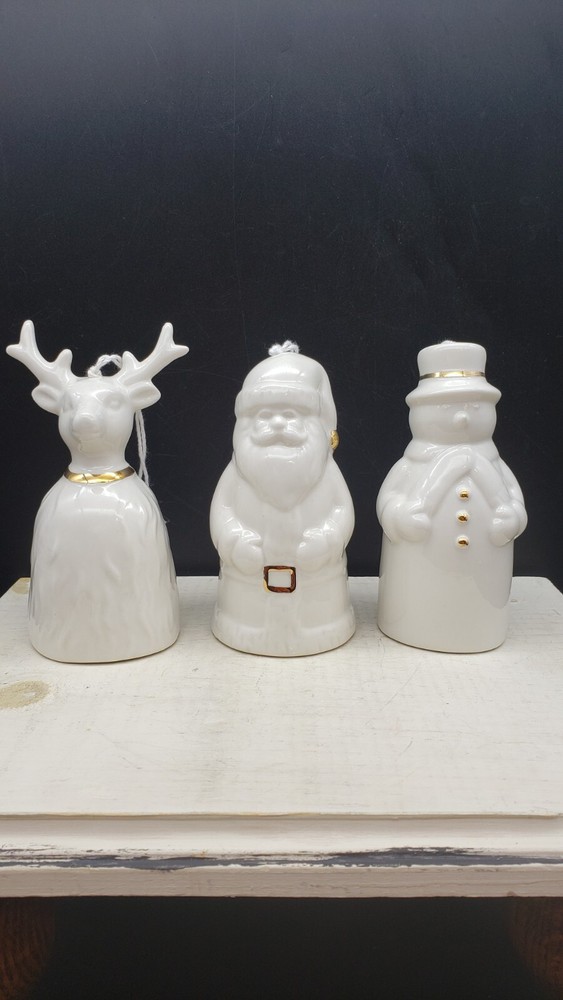 Christmas will be here before you know it and I am here to help you get ready. I have a gorgeous set of 3 bell ornaments made by Paula Joerling for Creative Coop. One is a reindeer with legs as the clapper, one is Santa with booted feet as the clapper, and one is a snowman with a gold star as the clapper. They are each glazed in a glossy, creamy white with hand painted gold accents. They are each approximately 5 inches tall and have a white tread hanger. These have a very classic look to them and are great for Farmhouse Decor. These are new and in very nice condition. They are coming from a smoke free, cat friendly home. Please feel free to message me with any questions. Please visit my store, Tennessee Valley Collectables, for more items, both vintage and new.