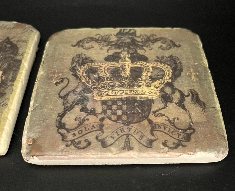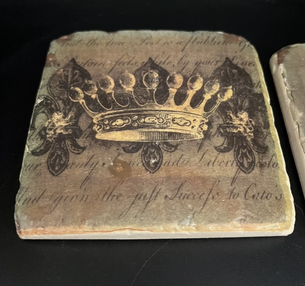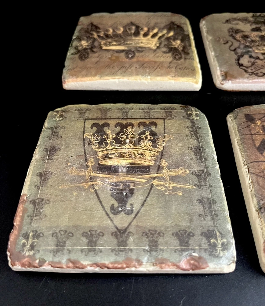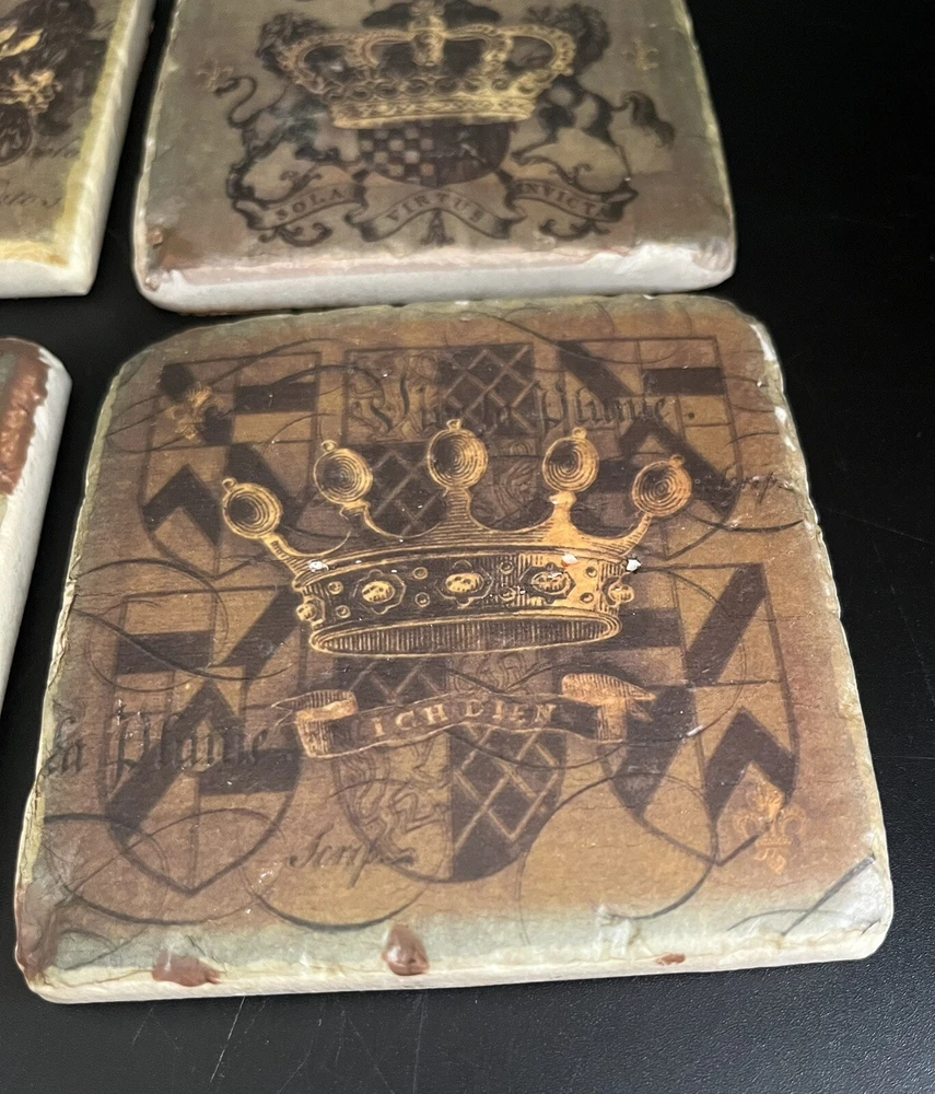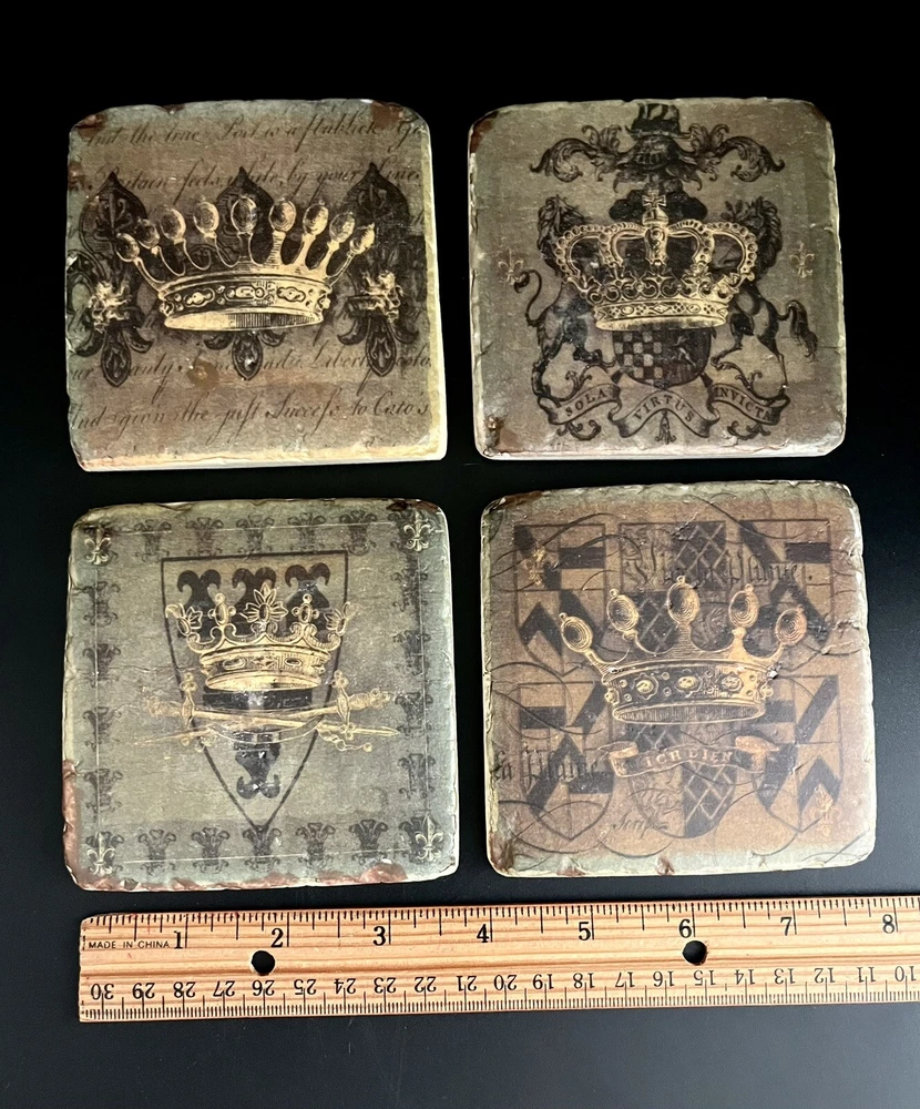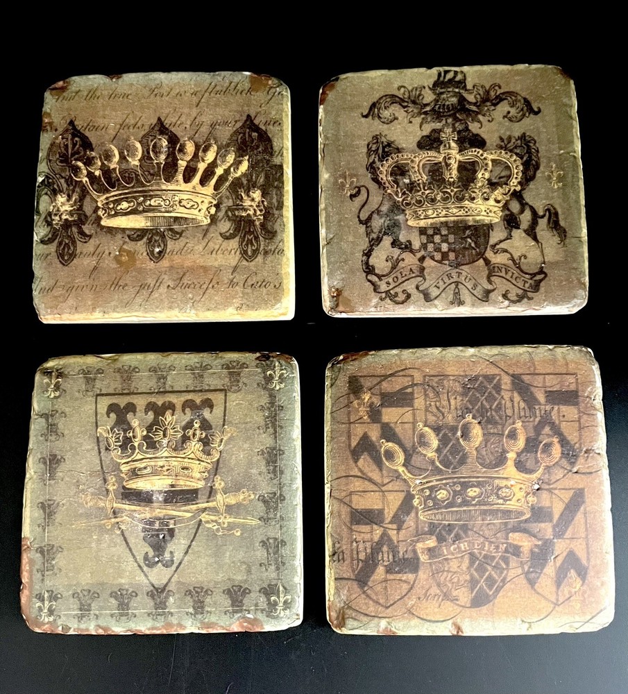 Set 4 Tumbled Ceramic Tile Coasters Rustic Crowns Shields Phoenix Creative Co. Each tile has a unique crown design in Renaissance style Measure 3 3/4 in. square x 3/8 in. tall Cork back with labeling Produced in 2009 Previously owned in good condition. No chips or cracks. Cork bottoms show minor signs of use and storage Photos are part of the description; please view carefully and ask any questions