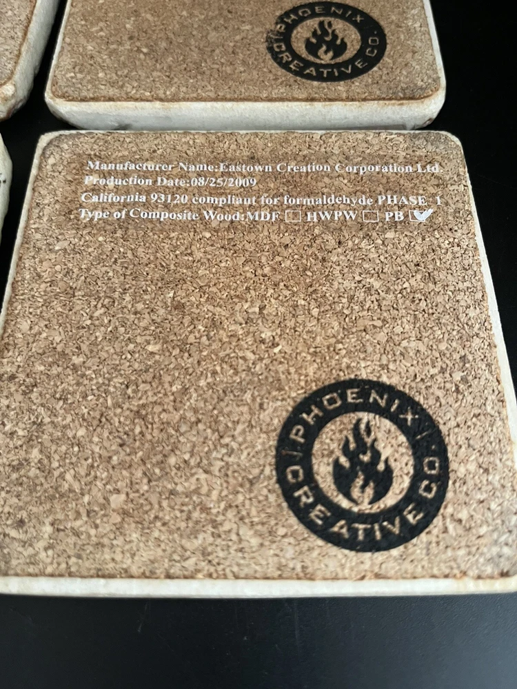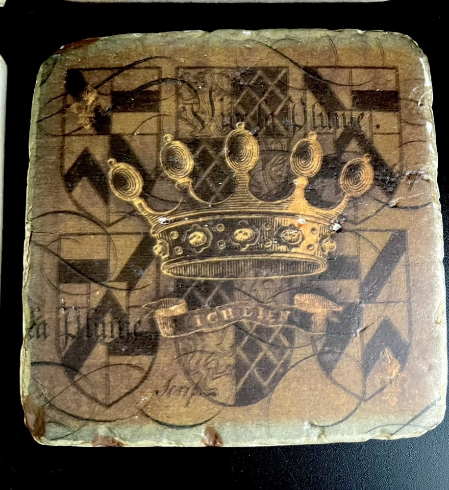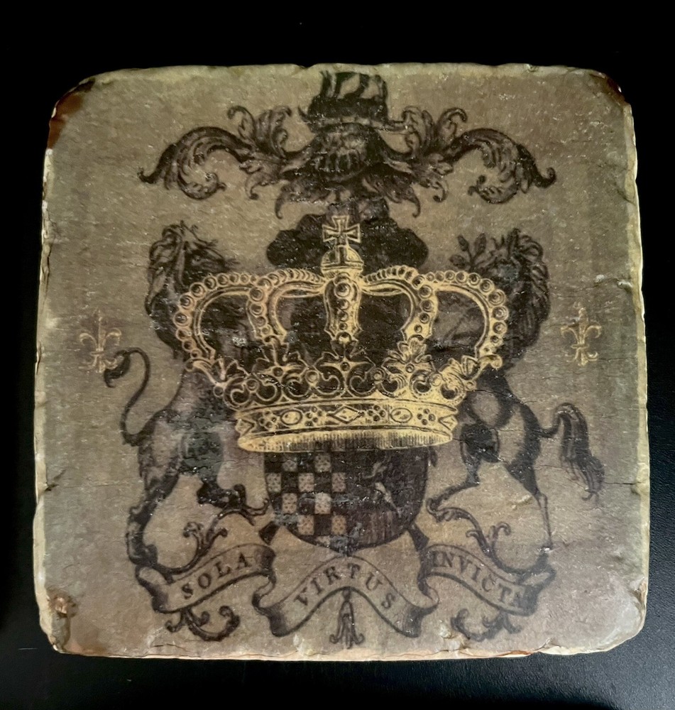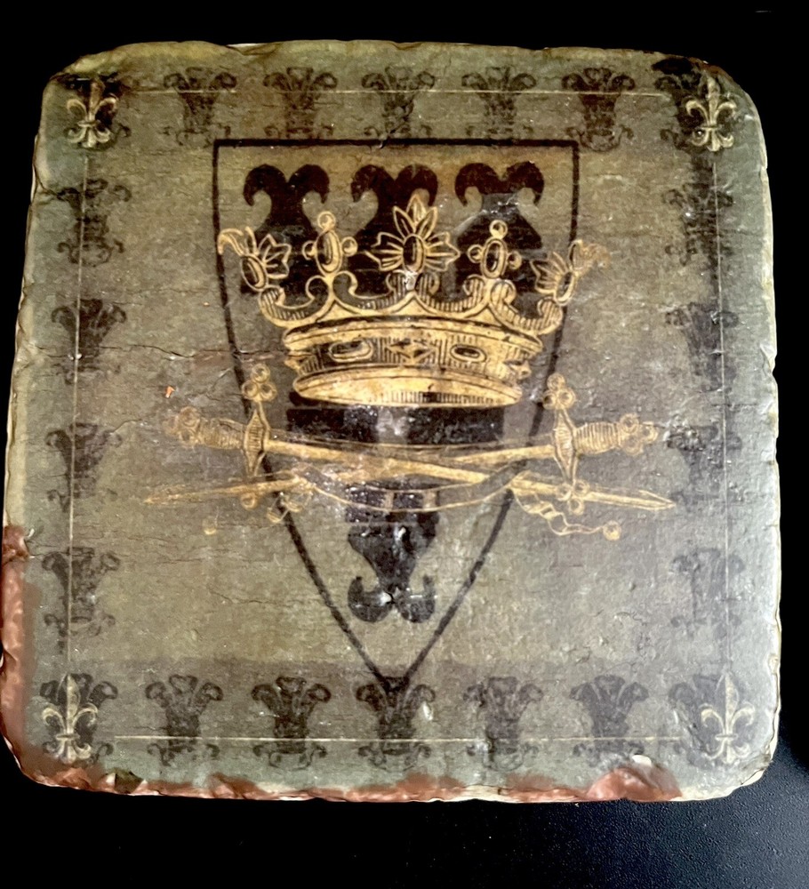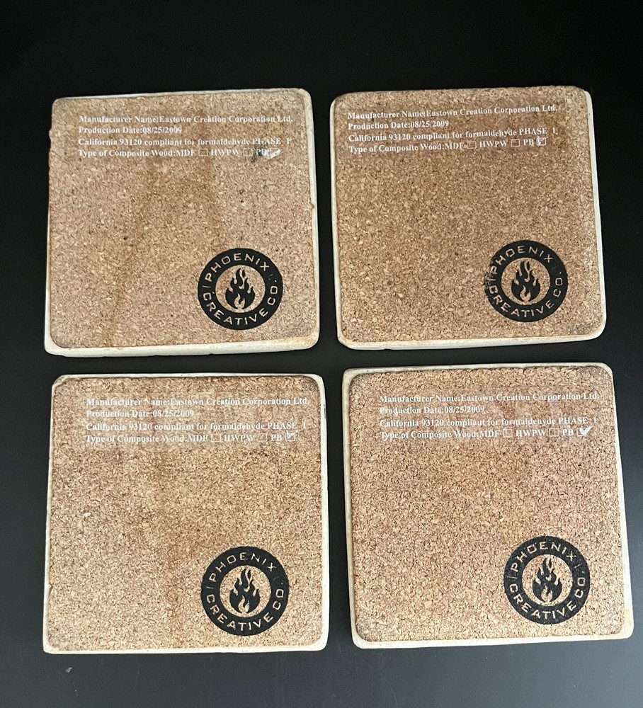 Set 4 Tumbled Ceramic Tile Coasters Rustic Crowns Shields Phoenix Creative Co. Each tile has a unique crown design in Renaissance style Measure 3 3/4 in. square x 3/8 in. tall Cork back with labeling Produced in 2009 Previously owned in good condition. No chips or cracks. Cork bottoms show minor signs of use and storage Photos are part of the description; please view carefully and ask any questions