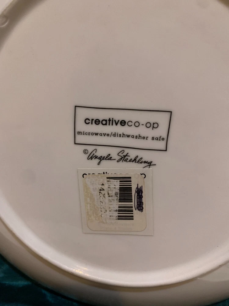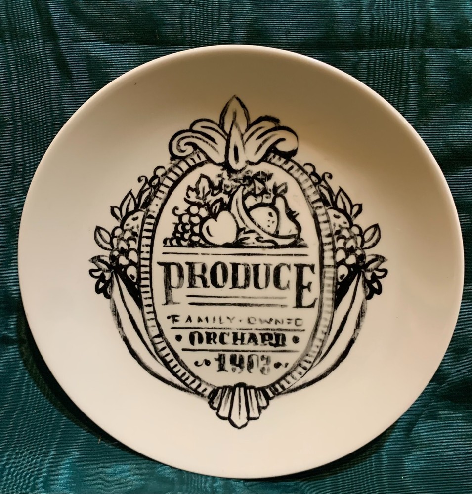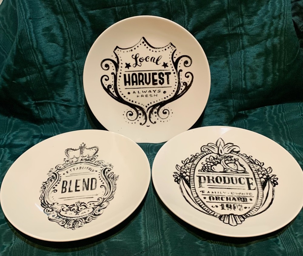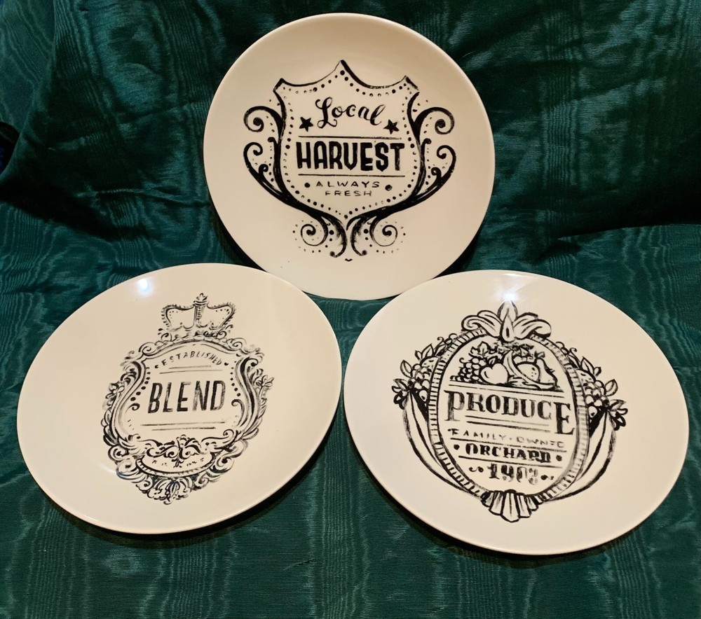 You are looking at a set of 3 plates from Creative Co-Op. They are white with black writing on the front and have a farmhouse decor look. One says "Local Harvest, Always Fresh." One says "Produce Family Owned Orchard 1903." One says "Established Blend." They are very cute and were used for decor, but I'm not sure they've ever been eaten on. No major flaws for wear. They are microwave and dishwasher safe if you do want to eat on them though. Angela Staehling design. Plates are 8 inches.