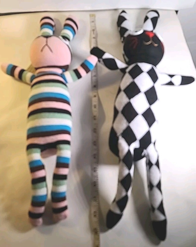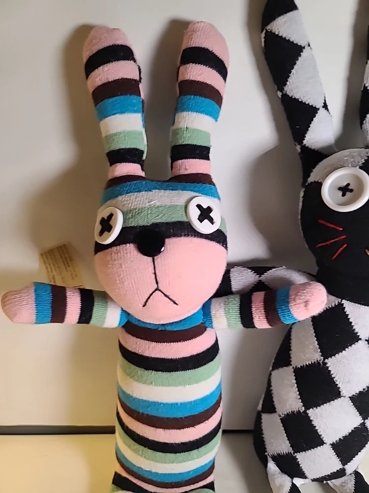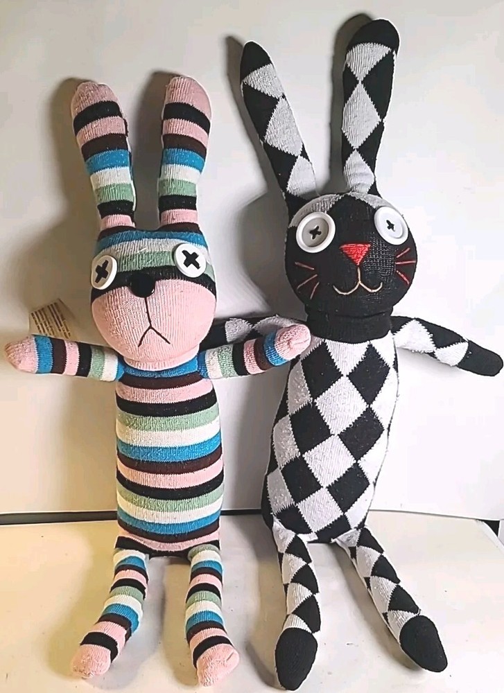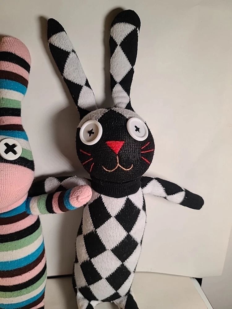 This set of 2 stuffed bunnies from Creative Toys Co. is the perfect addition to any collection. Handmade from socks, these medium-sized (14-24 in) toys are full of color and character. Made in China, these bunnies are a great gift or addition to any toy collection. With their unique design and charm, they are sure to bring a smile to any face. Don't miss out on the chance to own these adorable stuffed animals from the Bunny character family. Black& white has no tag. #handmade #bunny #bunnies #Easter #plushbunnies Bin 81