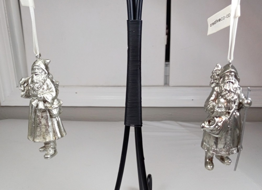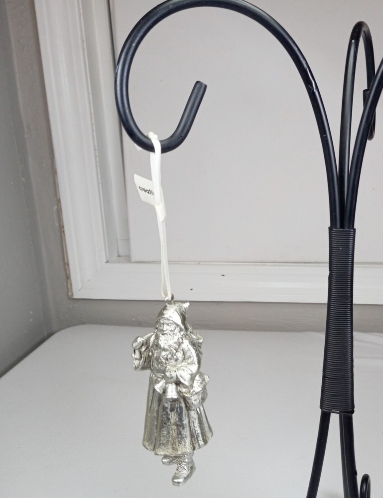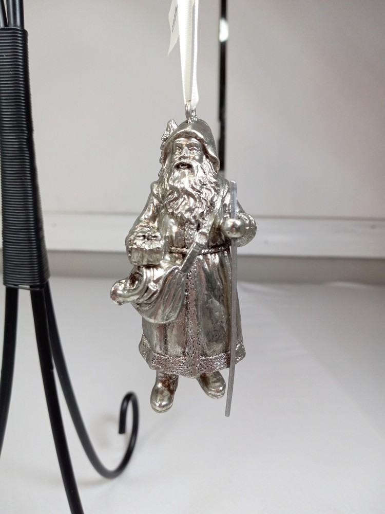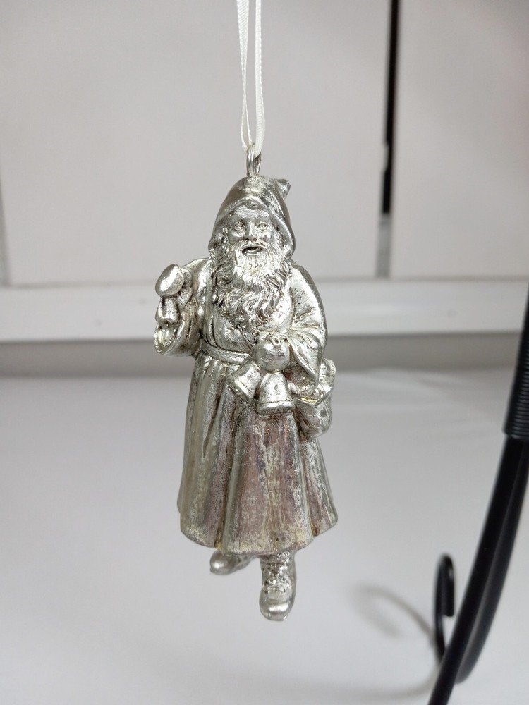 Set Of 2 Silver Finish Metal Santa Clause Hanging Christmas Tree Ornaments NIB. Condition is New in Box 2 4" inch Silver colored Santa Clause Tree Ornaments One Santa has a tree,present and walking stick One Santa has a bag of presents and bells Both have their tags Each measure about 4" inches tall These are heavy and well made See photos for actual condition Fast Shipping and packaged with care