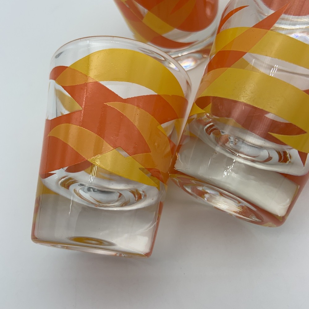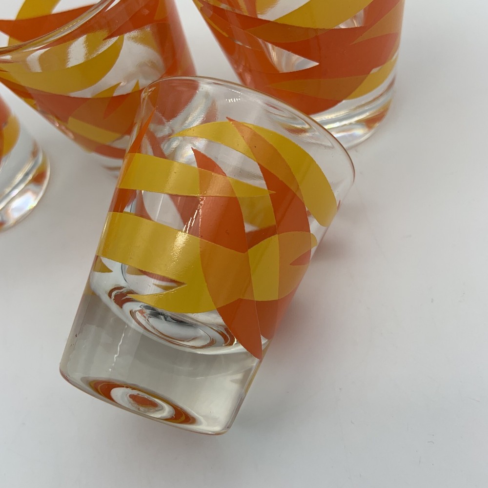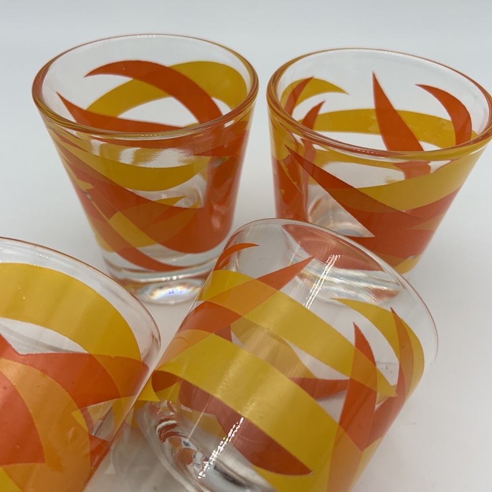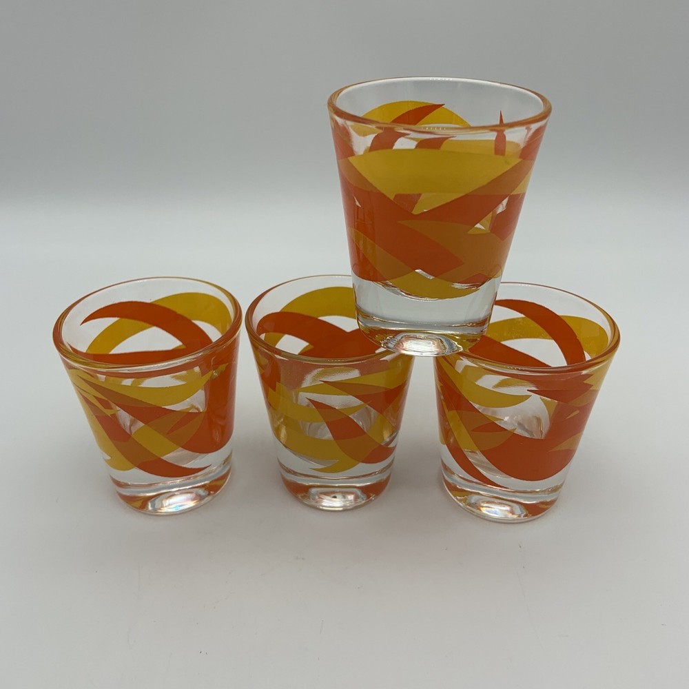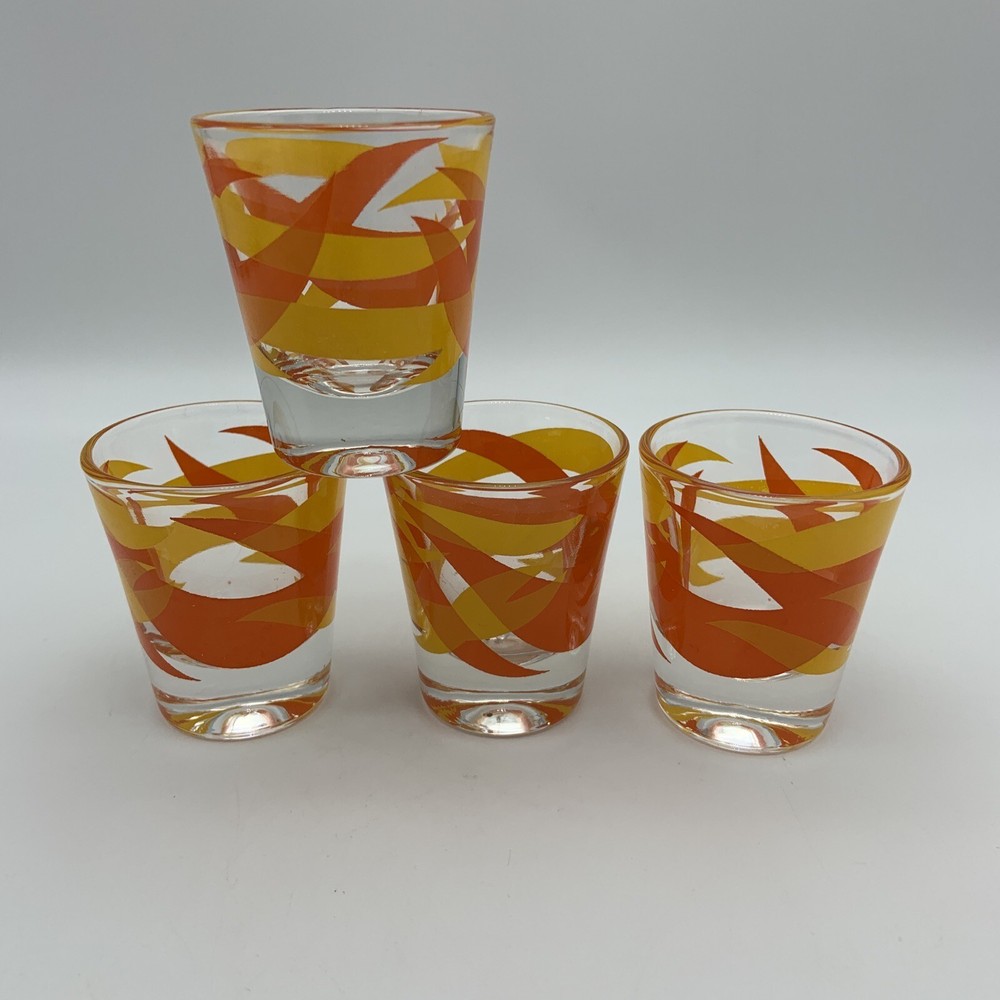 Add a touch of retro charm to your drinkware collection with this set of 4 STARLYTE Mid Century Modern Shot Glasses. The glasses feature a vibrant fire flames pattern in orange and yellow on clear glass material, giving them a glossy finish. Each glass stands at a height of 2-1/4”, making them perfect for all occasions. These original vintage shot glasses are a must-have for any drinkware or stemware enthusiast. Hand wash only to maintain their pristine condition. The glasses come in a four-piece set and were made in the United States. Don't miss out on the chance to add these unique and stylish shot glasses to your collection today! No flaws noted. Gorgeous!
