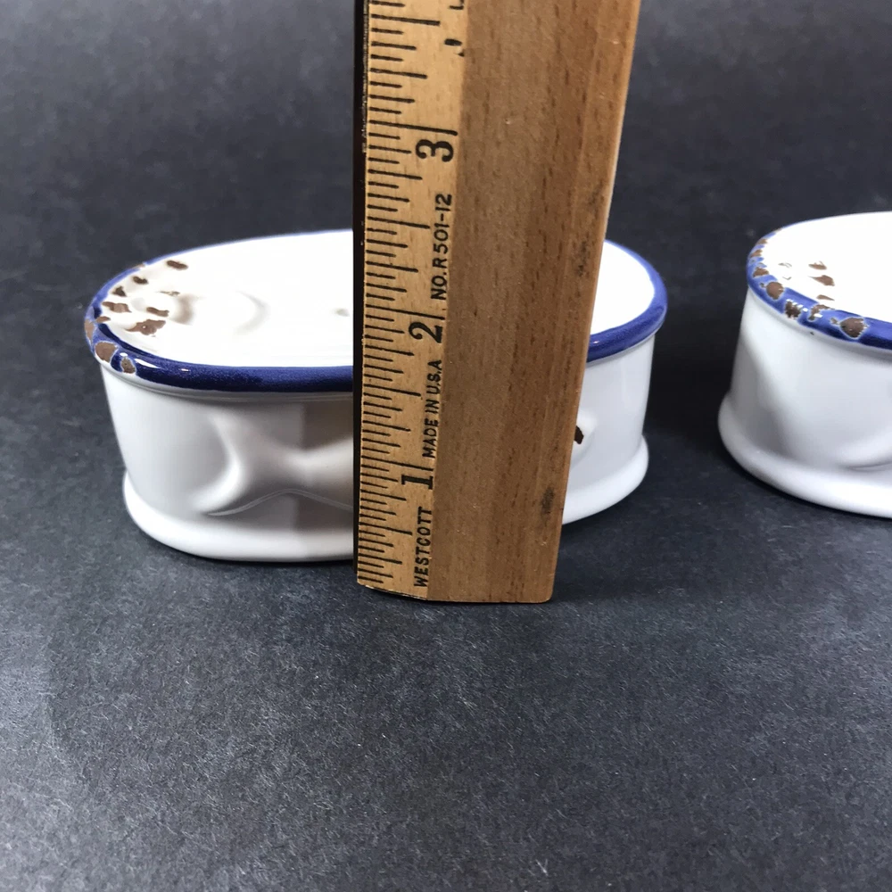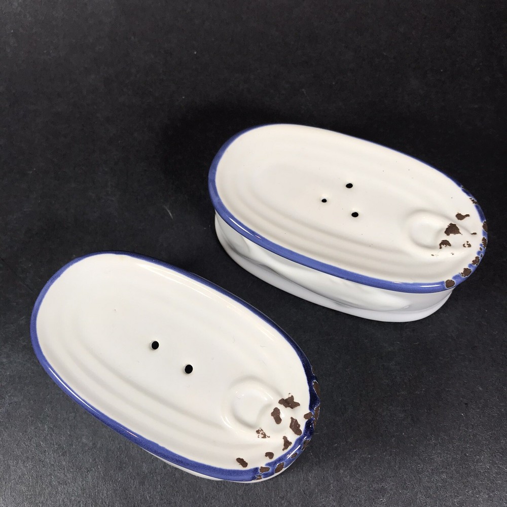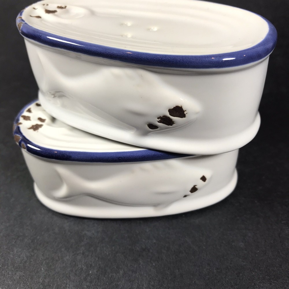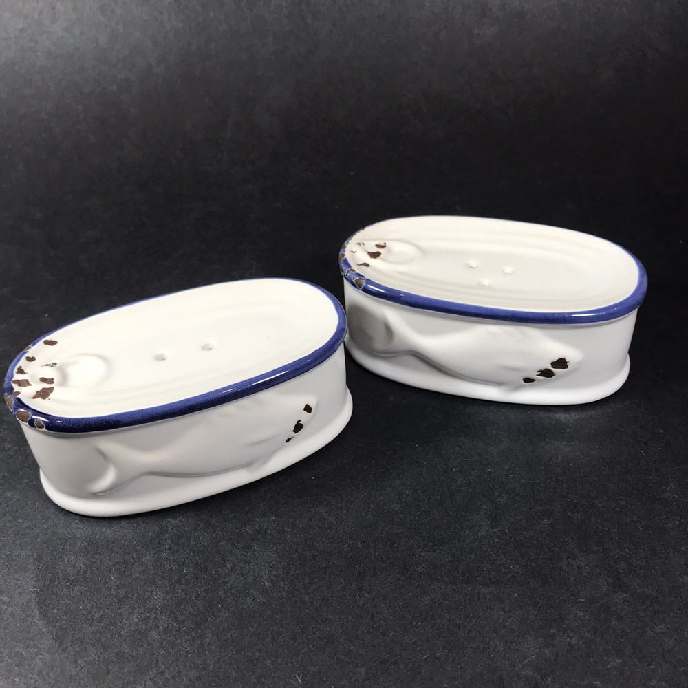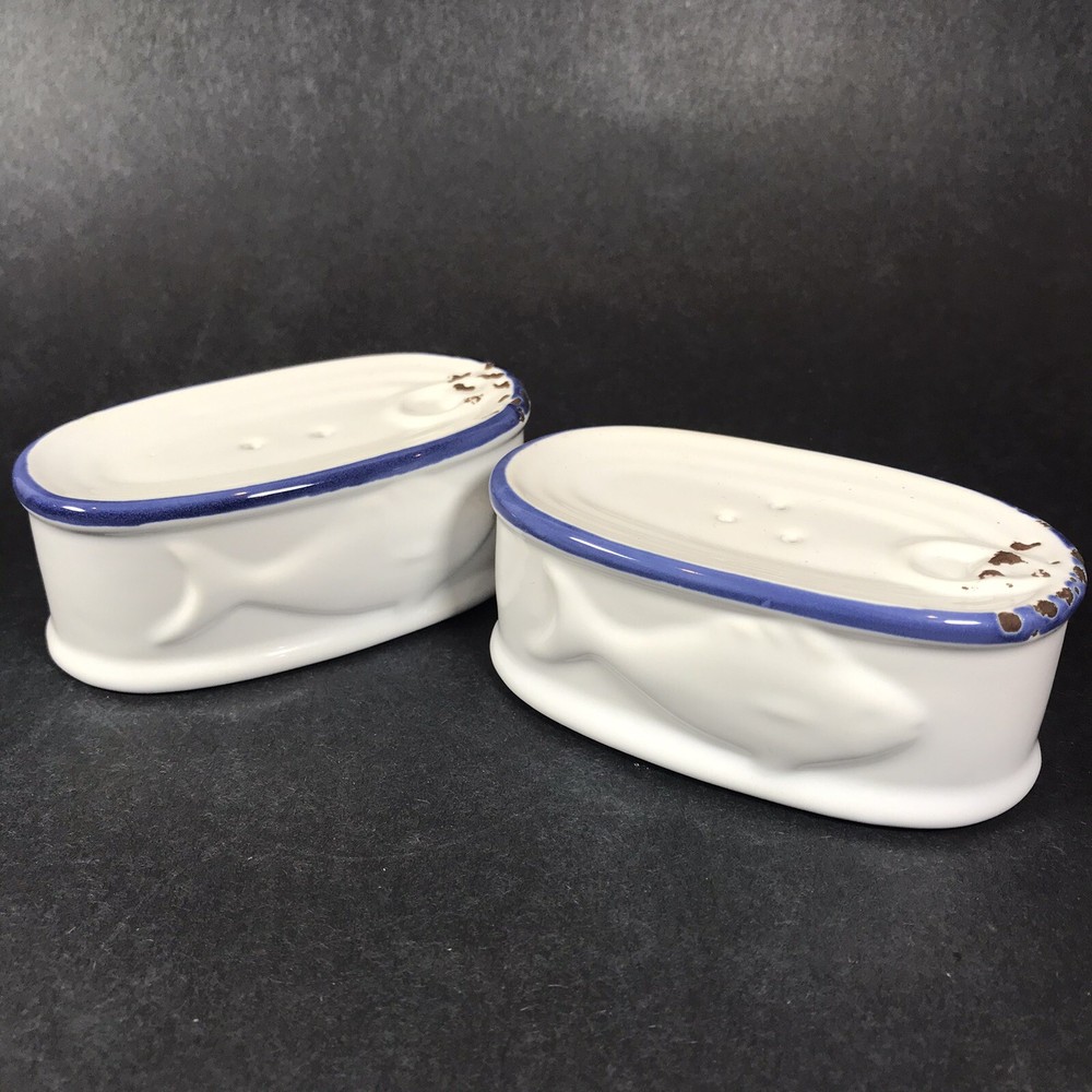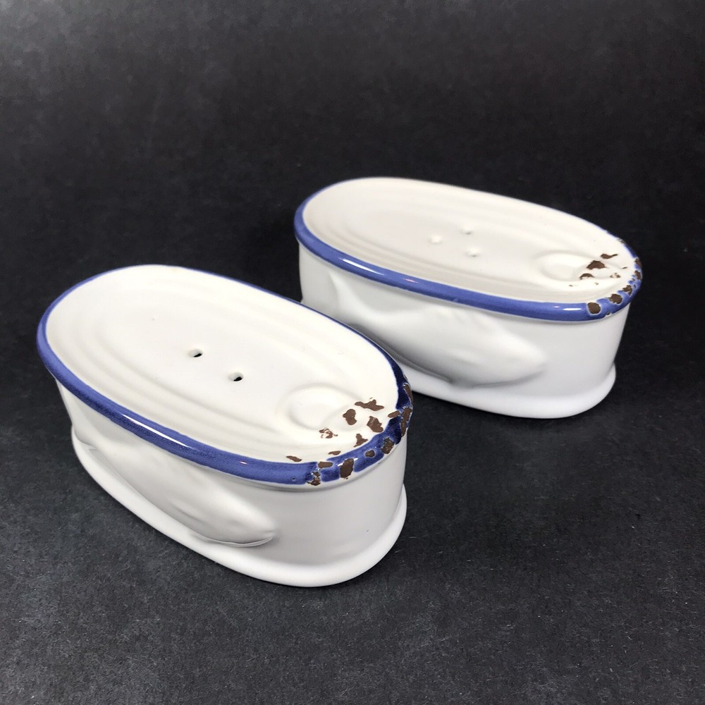 Set Tuna Fish Can Salt Pepper Shakers Creative Co Op Ceramic Distressed Look 4"L I offer 30-day returns except for items that are listed as nonworking. Buyer is responsible for return shipping, and the item must be returned in its original condition. Of course, if I make a mistake, I will pay for return shipping or provide a suitable resolution. Please contact me via eBay message with any issues. We are a non-smoking house, but we do have cats.
