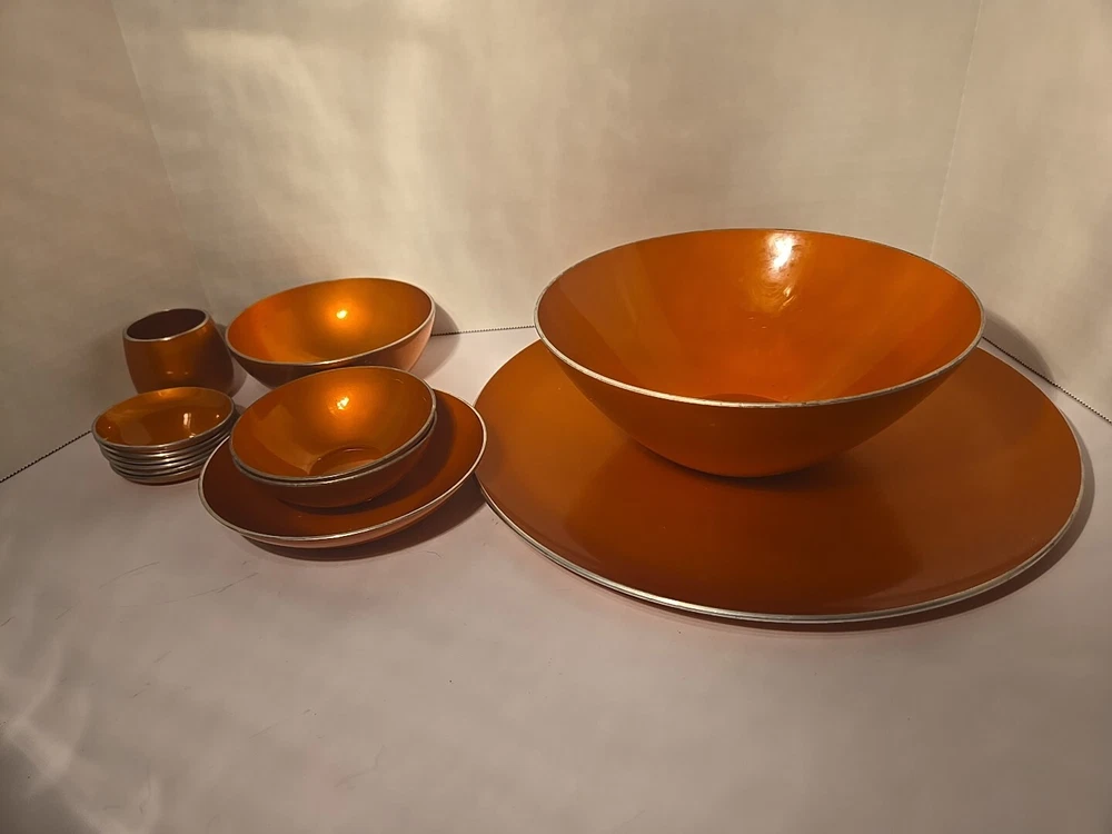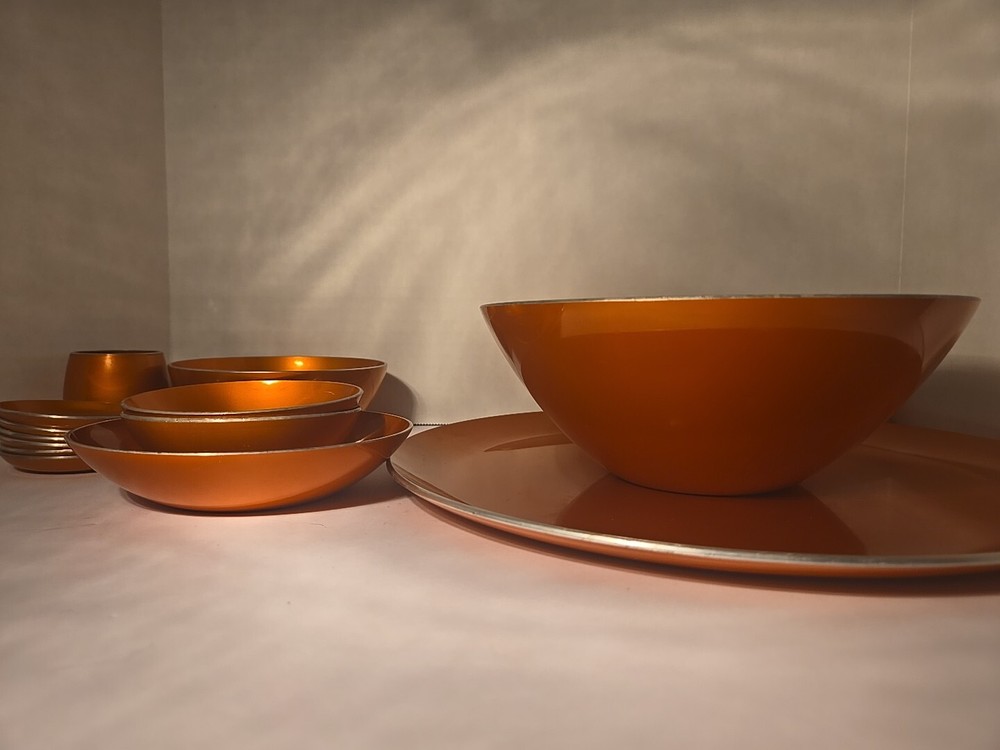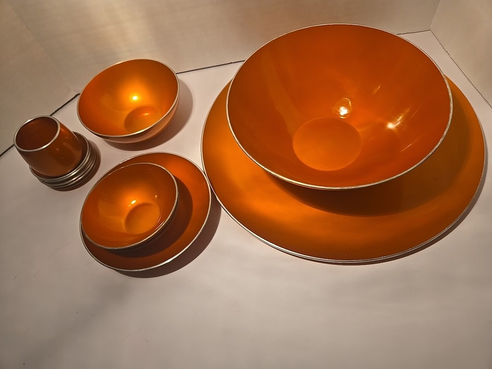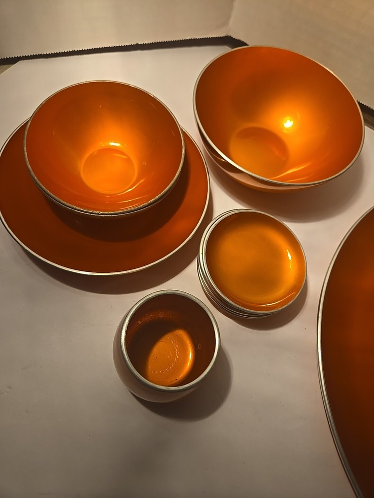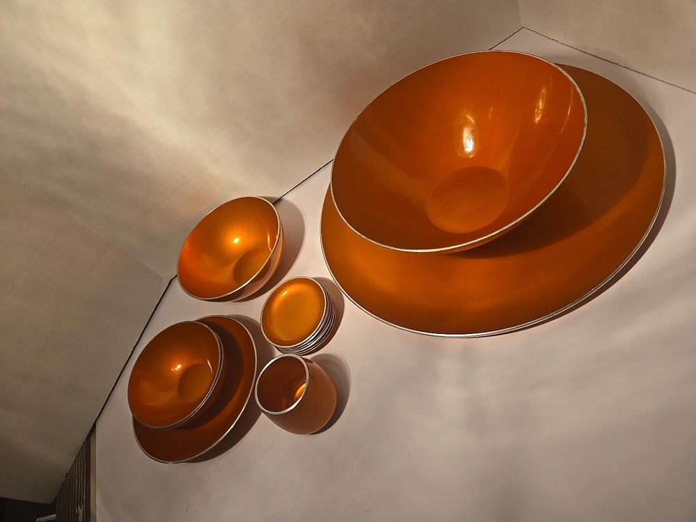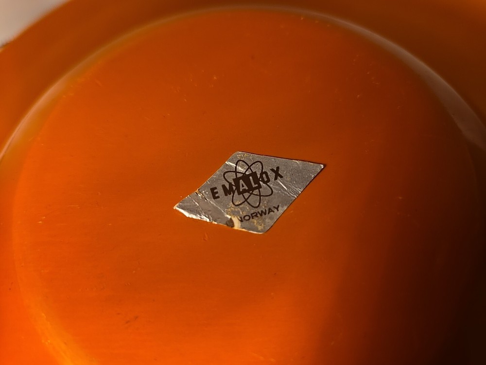 Add a pop of color to your collection with this set of 13 mid-century Emalox bowls. Made in Norway during the 1960s, these orange bowls are perfect for serving your favorite meals. The sleek design and durable construction make them a great addition to any kitchen. Crafted with care and attention to detail, these bowls are not only functional but also stylish. The vibrant orange color adds a touch of retro charm to any table setting. Whether you're a collector or just looking for unique and functional kitchenware, this set of Emalox bowls is sure to impress.