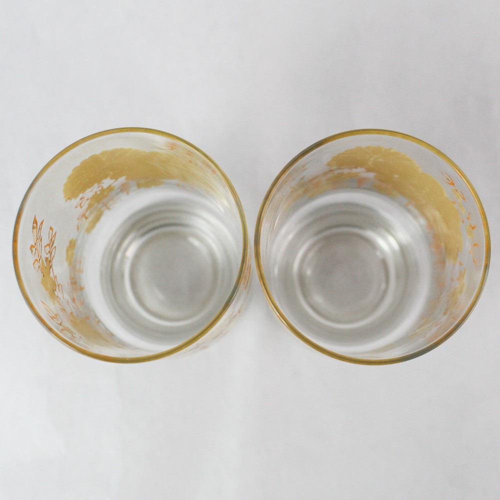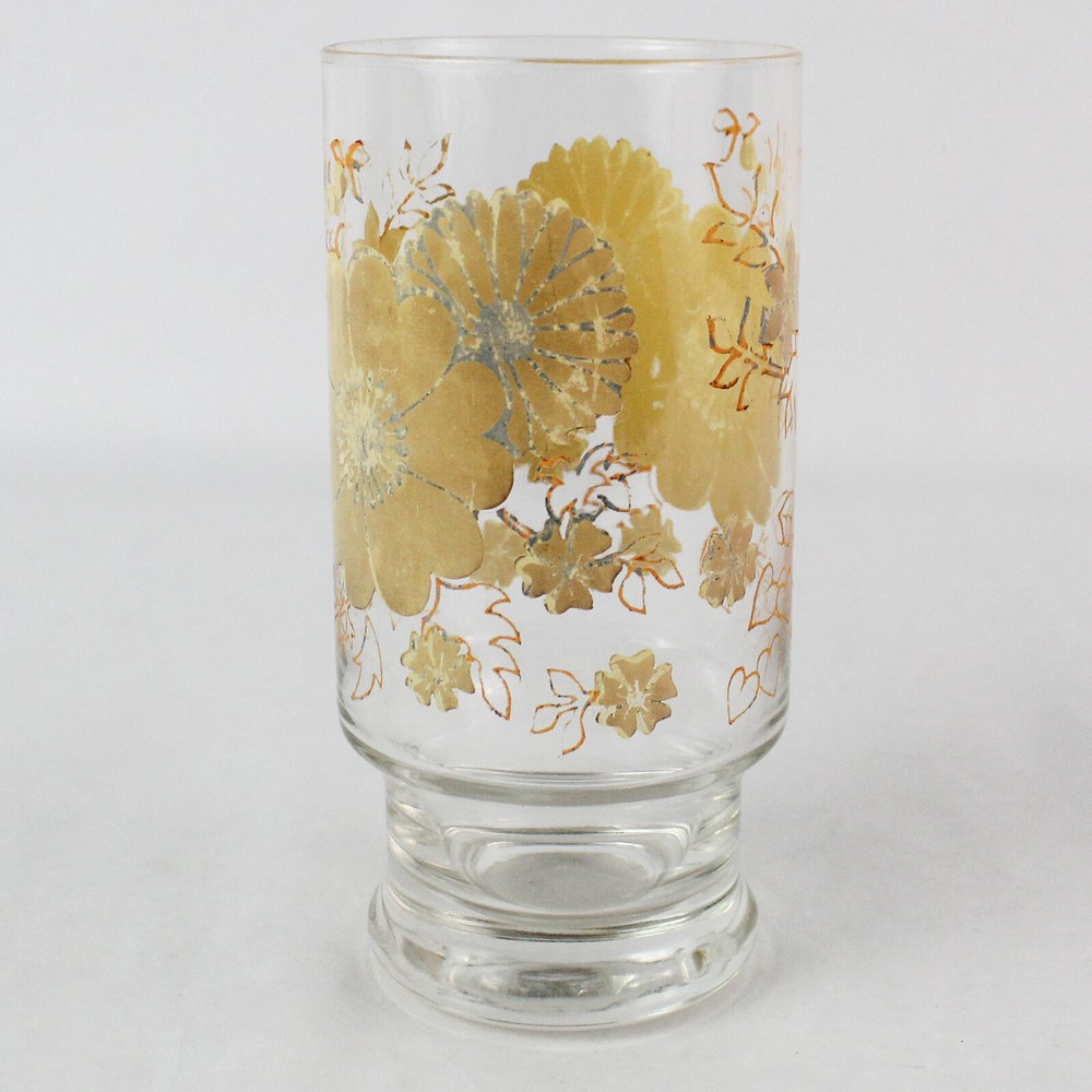 Enhance your glassware collection with these charming mid-century modern tumblers. Featuring a beautiful design of yellow flowers, orange leaves, and hearts, they are sure to impress. Each glass measures 5.75" tall and 2.75" in diameter, making them perfect for any beverage. These tumblers are in pre-owned condition, showing some paint wear and fading, adding to their vintage charm.
