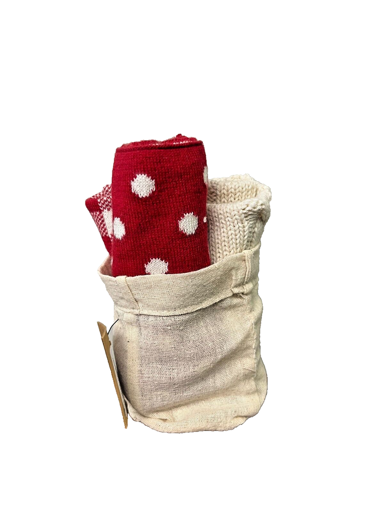 Set of 3 super soft, durable dishcloths packaged in a cute cotton bag. 10.5'' square. Perfect for the holidays or even Valentine's Day.